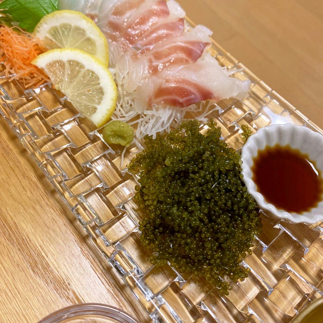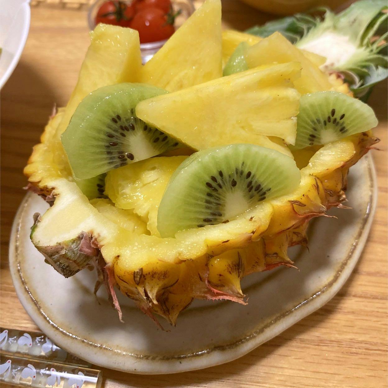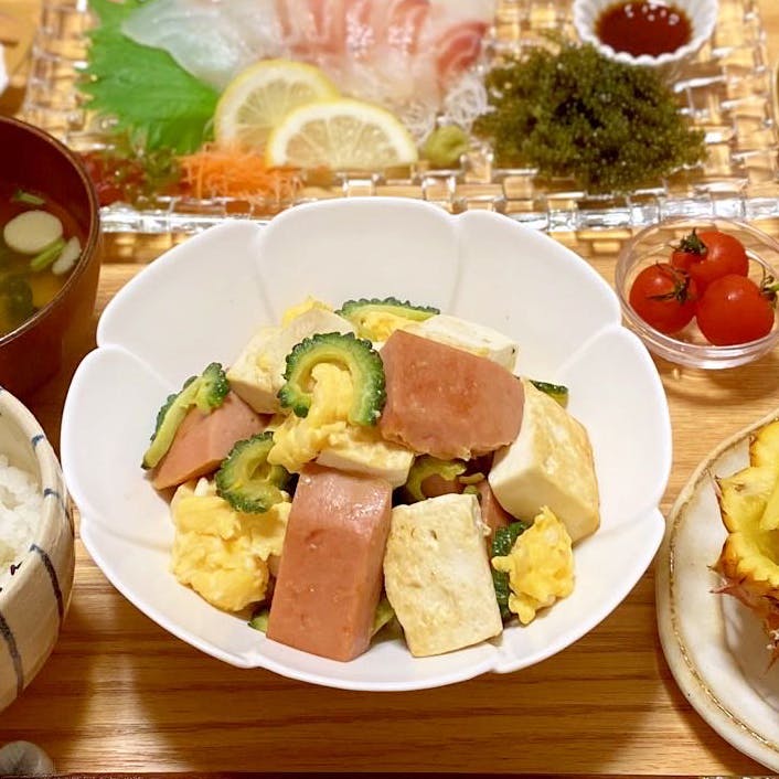 沖縄県のパイナップル、海ぶどうを偶然一日違いで旦那の友人から頂いたのと、急いでゴーヤ買ってきてゴーヤチャンプルをメインにしました! 豚肉の代わりにスパム使いました パイナップルくり抜くのに苦戦しちゃった🥺
