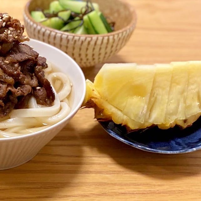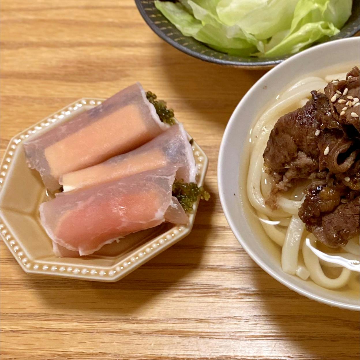 肉うどんがメイン♪ 海ぶどうとチーズの生ハム巻きと、きゅうりの塩昆布和えで塩分が高めになってしまったので献立のバランス的には反省🥲 でも塩分あるの好き😳