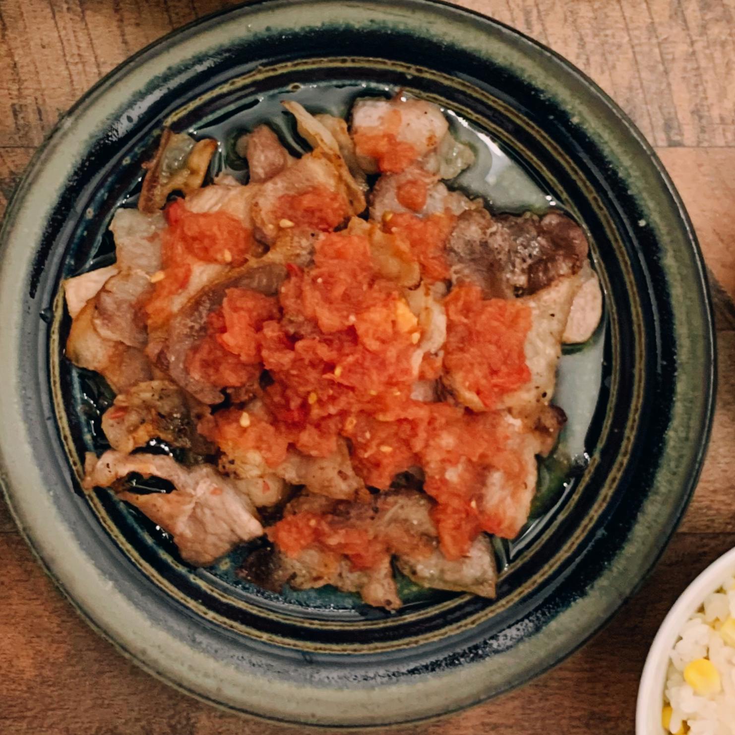 さっぱりしたものが食べたかった日 トマトおろしダレは、トマトと大根をおろして、ポン酢を混ぜるだけ。大根おろしの水分はきった方が使いやすいかも。 カリカリに焼いた豚肉にかけていただきました。 お肉にも合うし、余ったたれに麺つゆを混ぜて、そうめんで食べてもおいしかった☺️