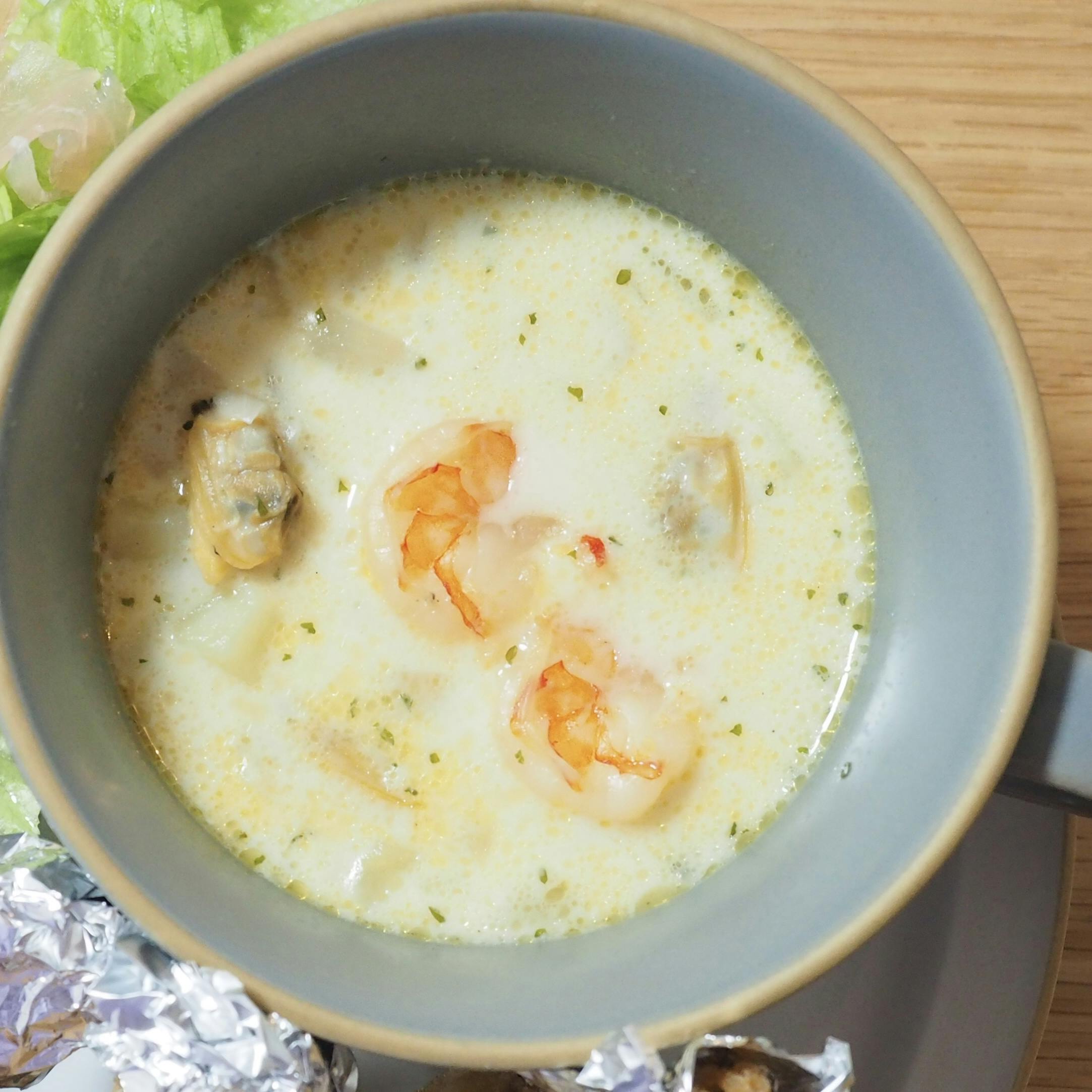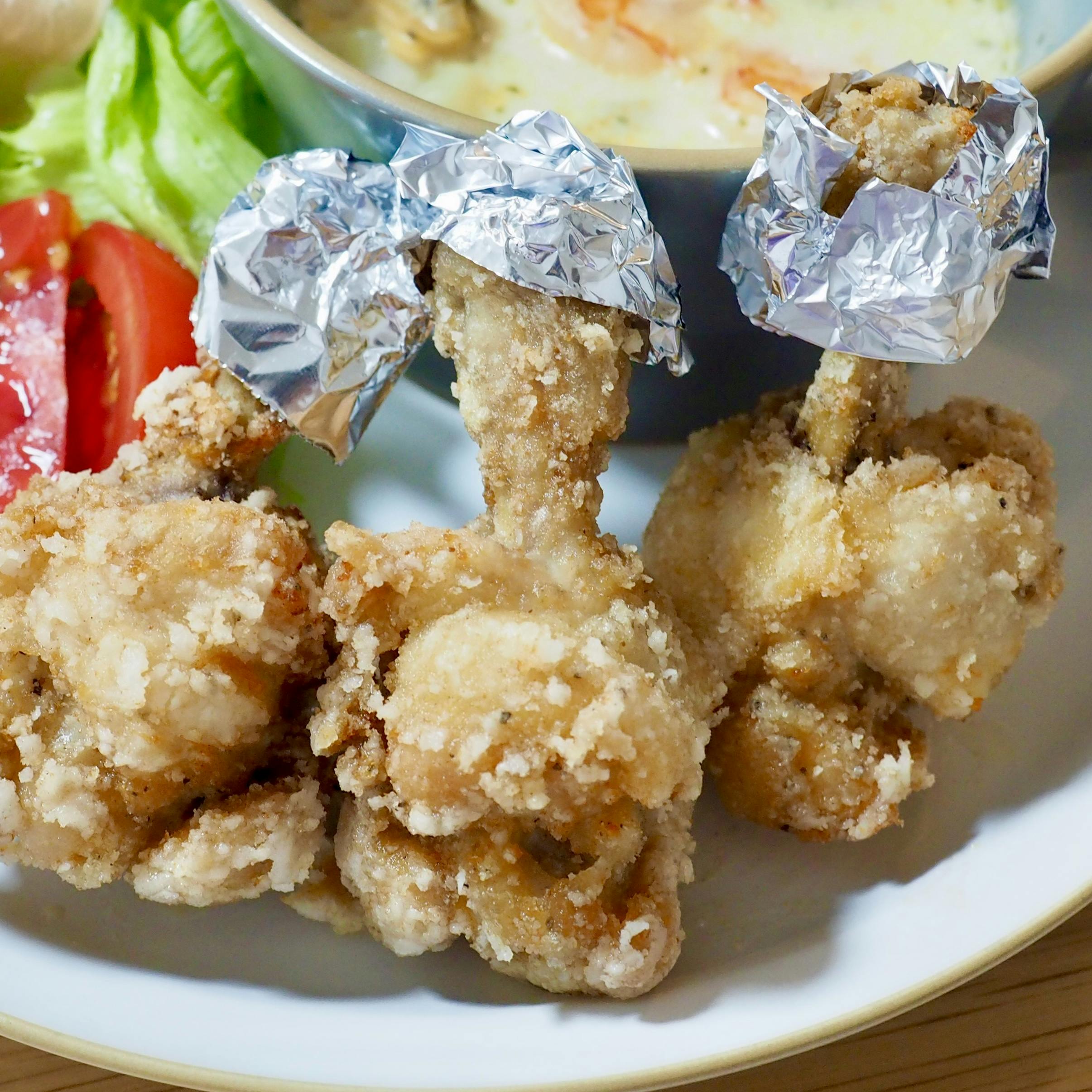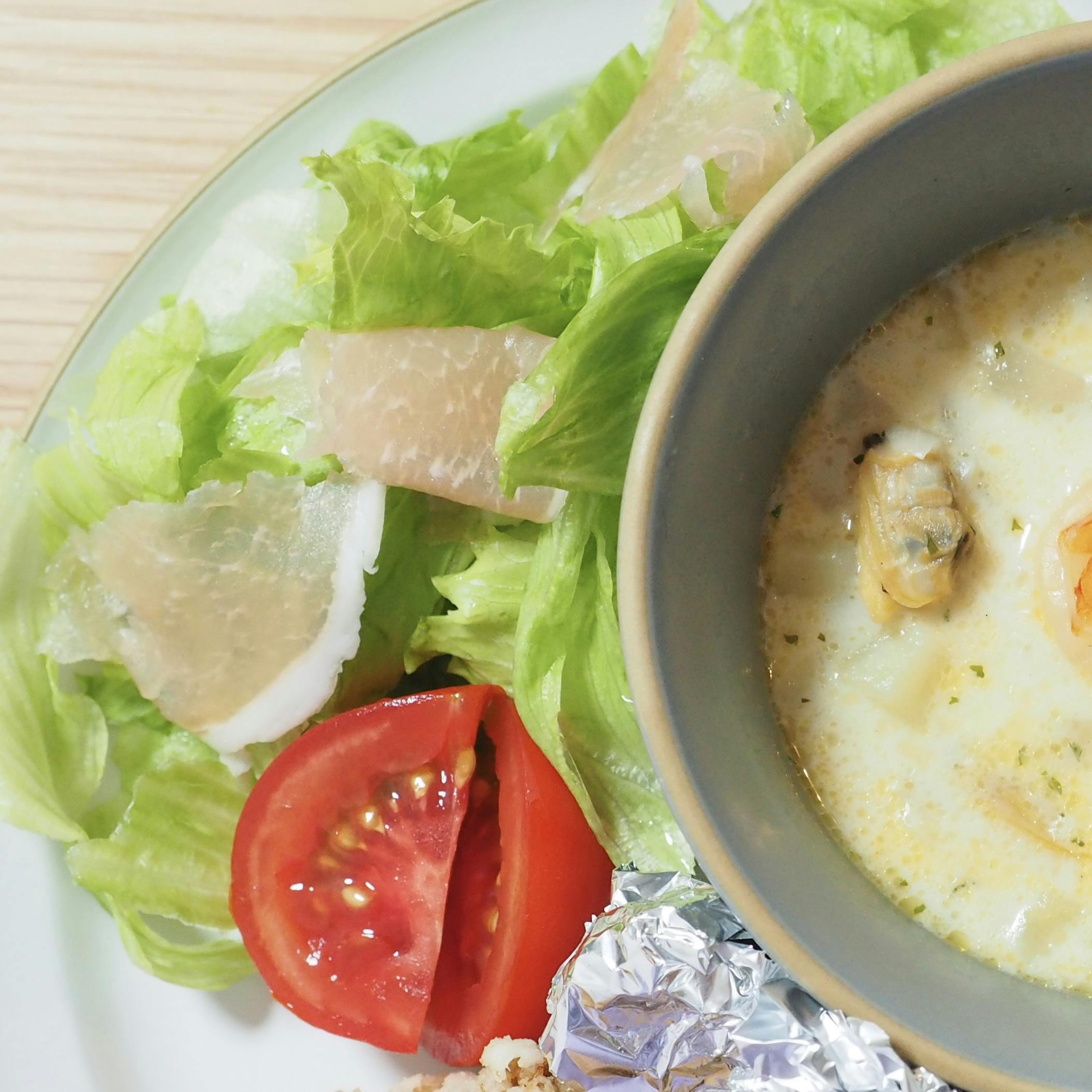 手羽元でチューリップ唐揚げをしました♪ クラムチャウダーには海鮮たっぷり入れて。