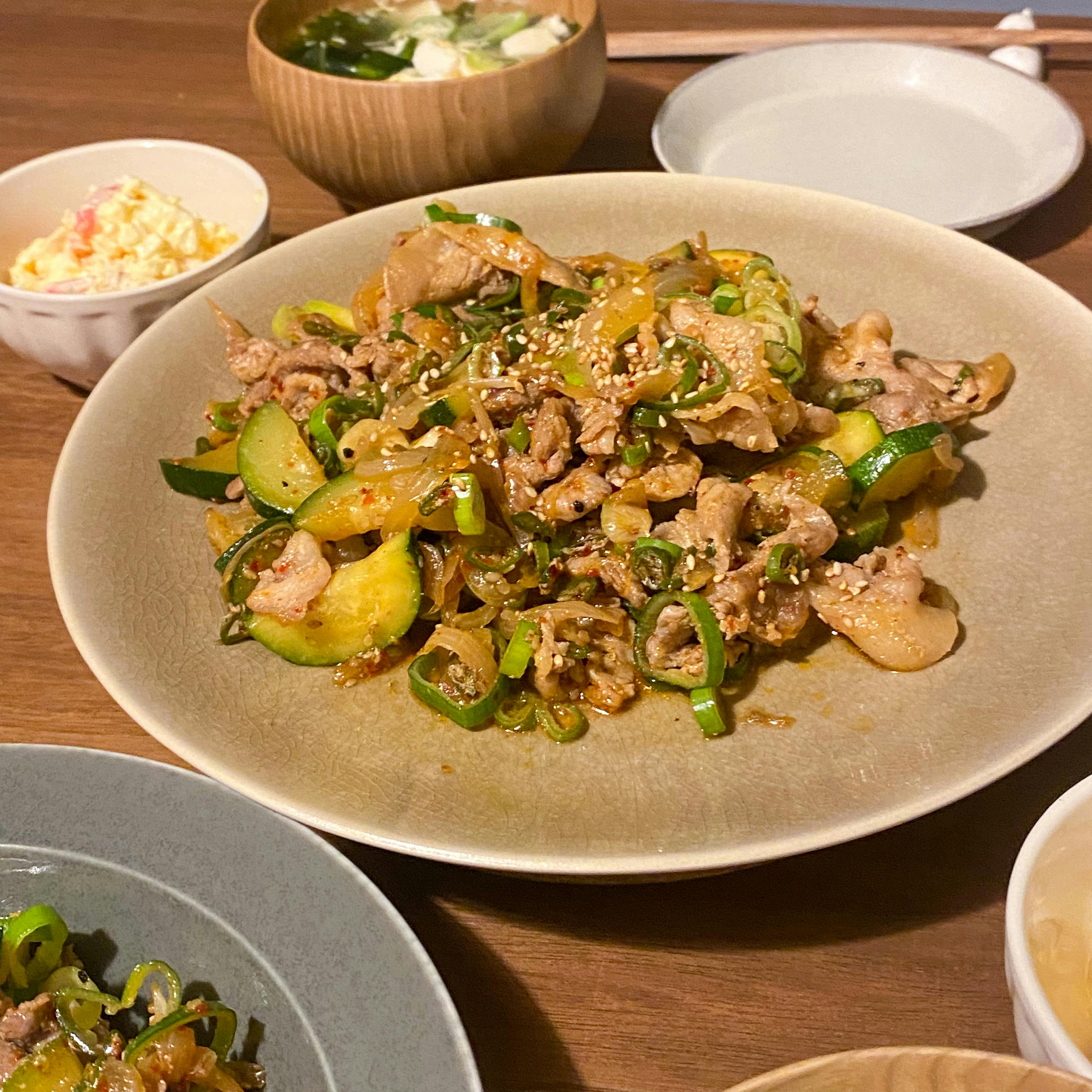 この日の晩ご飯は、プルコギ風炒め物を 好きなだけご飯の横によそって食べるスタイルでモリモリ食べた☺️ ズッキーニと冷凍庫の番人、豚こま肉を使ってサッと炒めるだけ! 少し甘めの味付けだからあまり🧔🏻♂️は好きじゃないかな〜?と思いきや、びっくりするほど好評だったので分量はメモ😂📝笑 あと、自分がめちゃくちゃ頼る作り置きのスタメン、自家製メンマはとりあえずあと一品にすごく便利! スープは韓国風に揃えてワカメスープ🥣 ミチョのソーダ割りで乾杯🍷