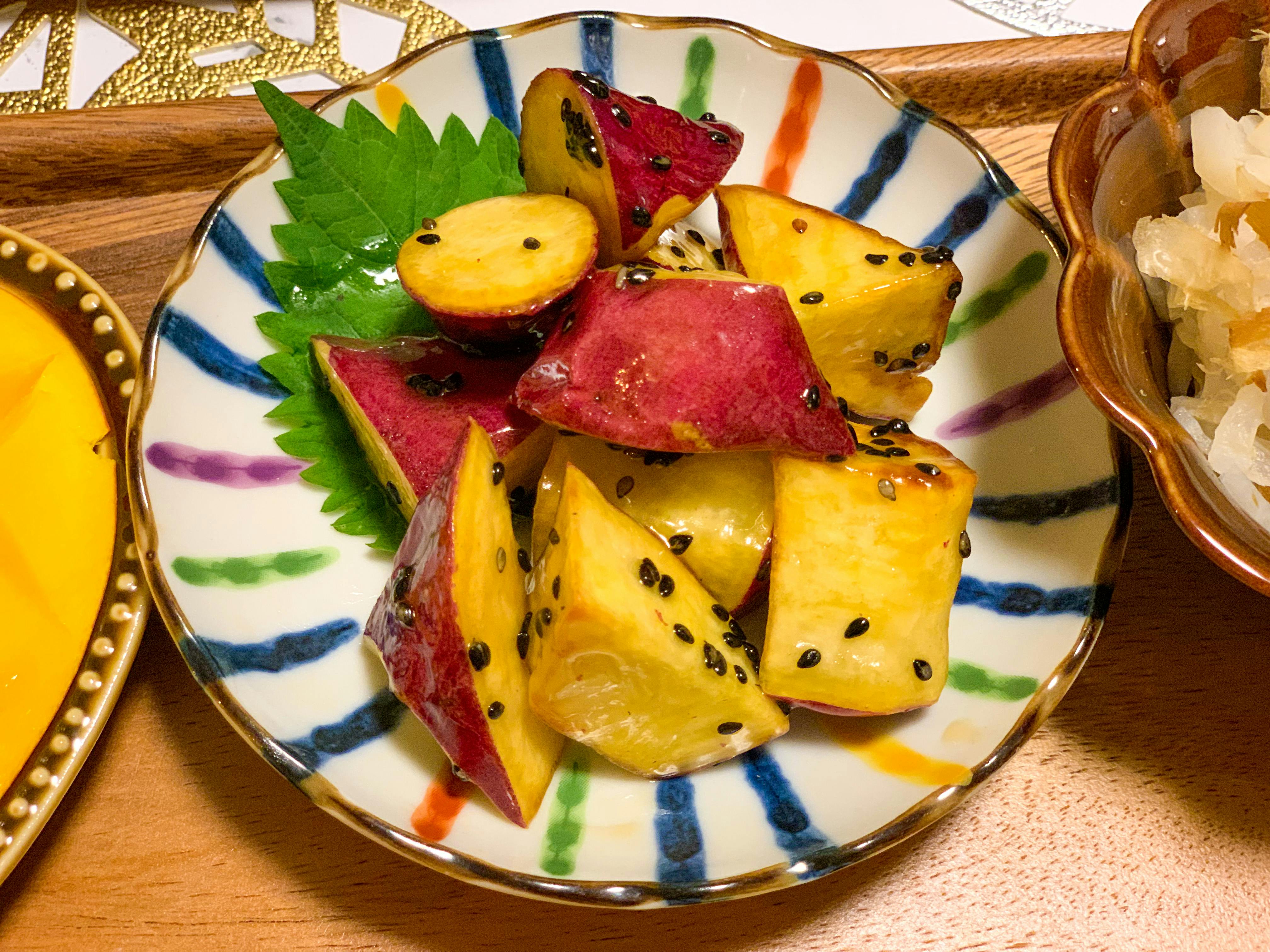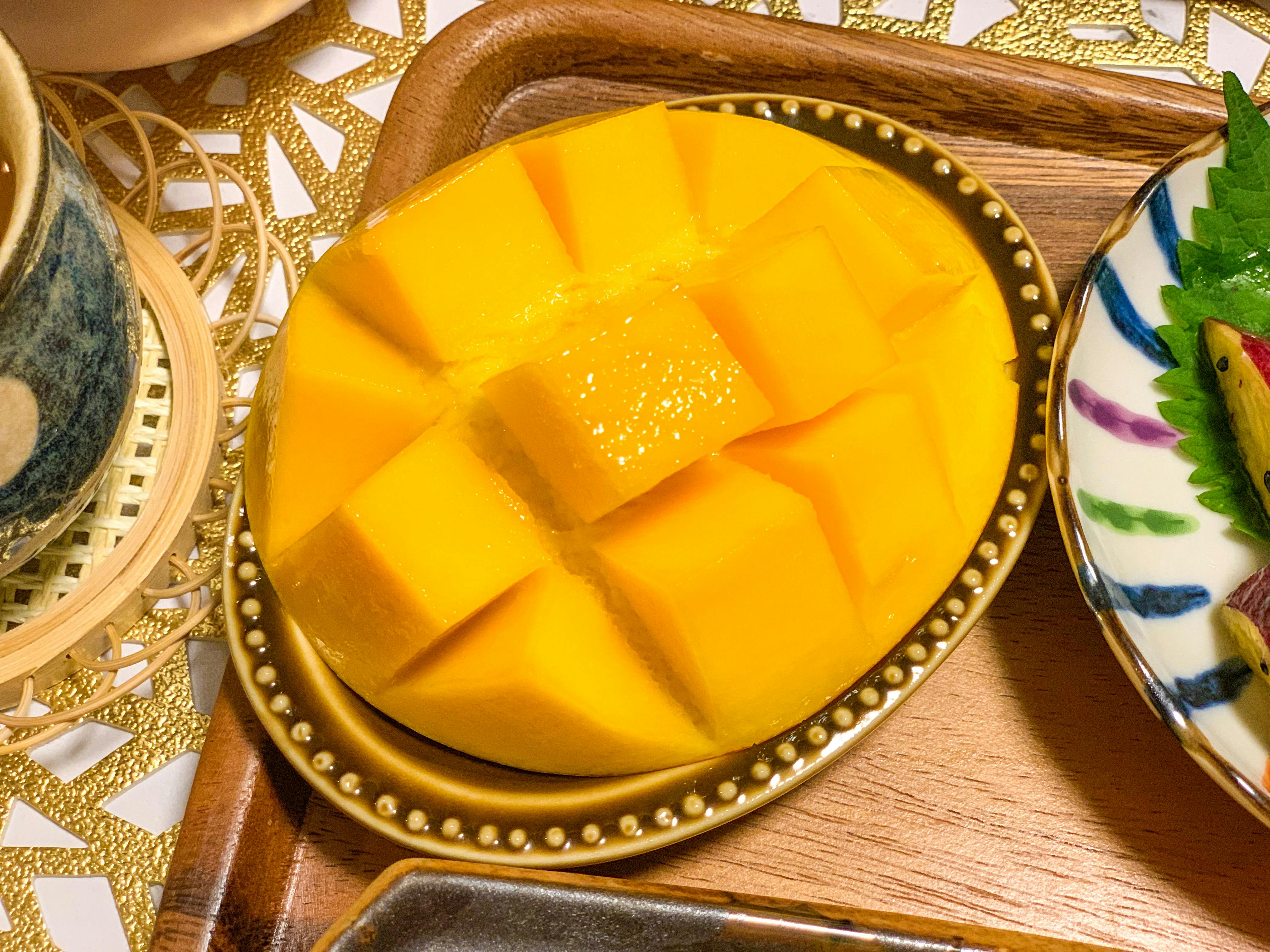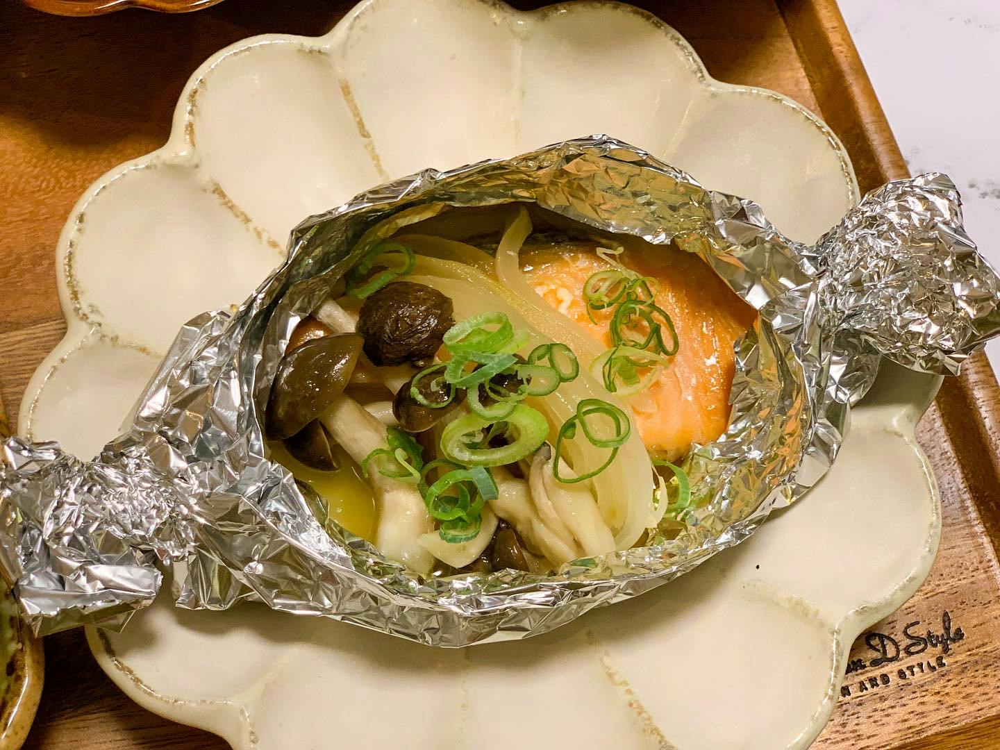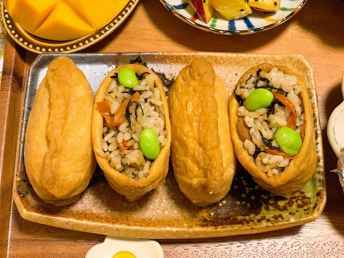 鮭のホイル焼きの味付けは、塩とバターのみです!✨✨ シンプルで美味しい☺️ 前日のひじきご飯をお稲荷さんにしましたー❣️ 酢飯のも作ったので、4つ。。多い。😅 この日はマンゴーがとっても美味しかったです🥭💕