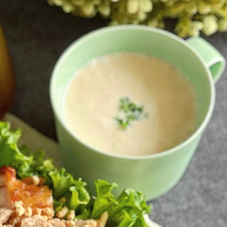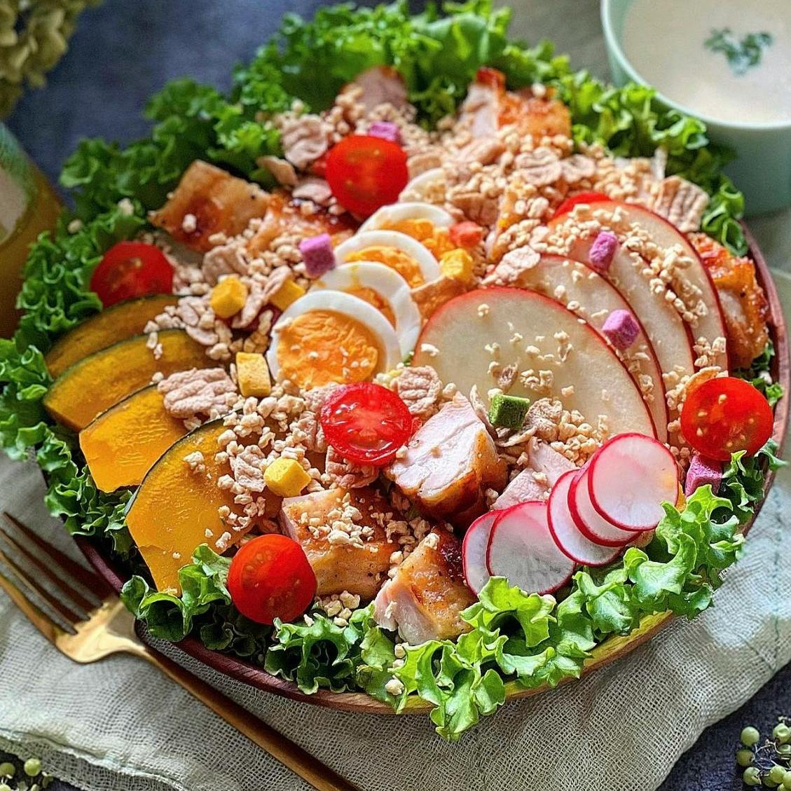 もりもり #パワーサラダ での朝ごはん🥗 ❁︎ ローストチキンのパワーサラダ ❁︎ じゃがいものポタージュ 具沢山でどこを食べても美味しい食事サラダ🥗 自家製レモンドレッシングをたっぷりかけて もりもりといただきました。
