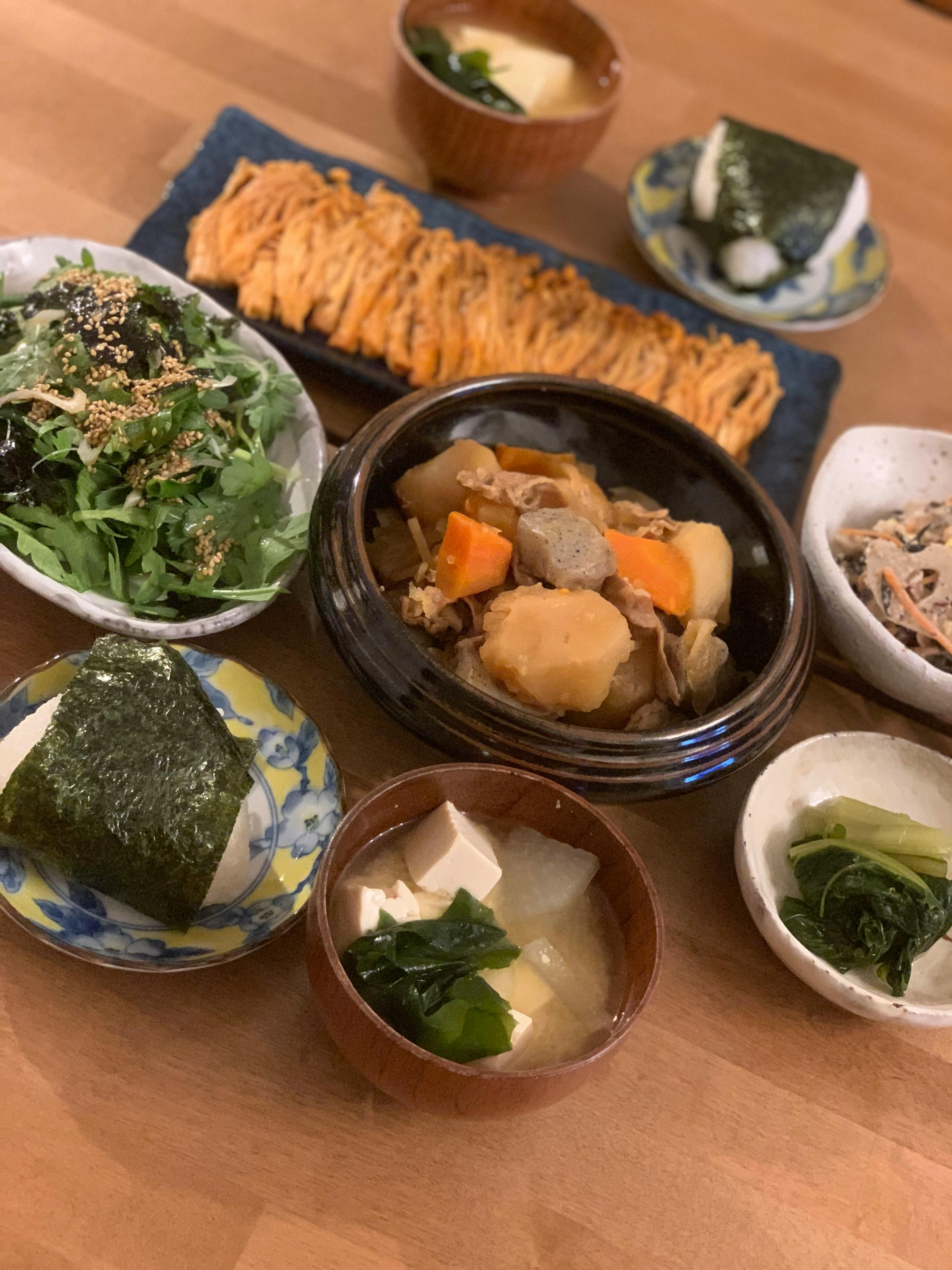 無水肉じゃがーーーっ!! 白滝ではなくこんにゃくで作りました。 最近ハマっている春菊サラダ。 子供達がはまっているコチュジャンえのき。 おにぎり 大根とわかめとお豆腐のお味噌汁 野沢菜のお漬物