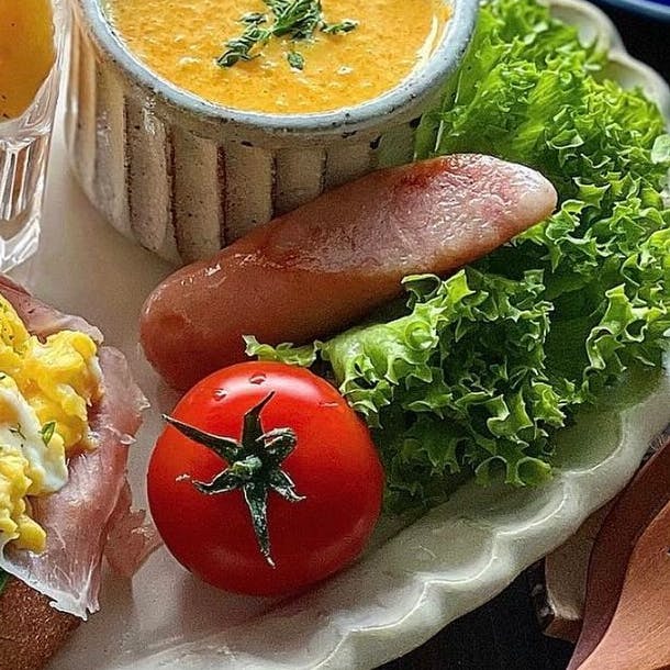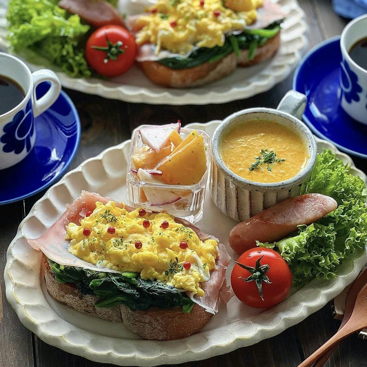 #オープンサンド で朝ごはん🥚 オープンサンドはバター炒めしたほうれん草+生ハム+スクランブルエッグです。 一つでお手軽に野菜もタンパク質もしっかり摂れます。 ❁ ほうれん草とスクランブルエッグのオープンサンド ❁ 柿と赤カブのマリネサラダ ❁ ソーセージ ❁ フリルサラダとプチトマト ❁ 人参のポタージュ ❁ コーヒー