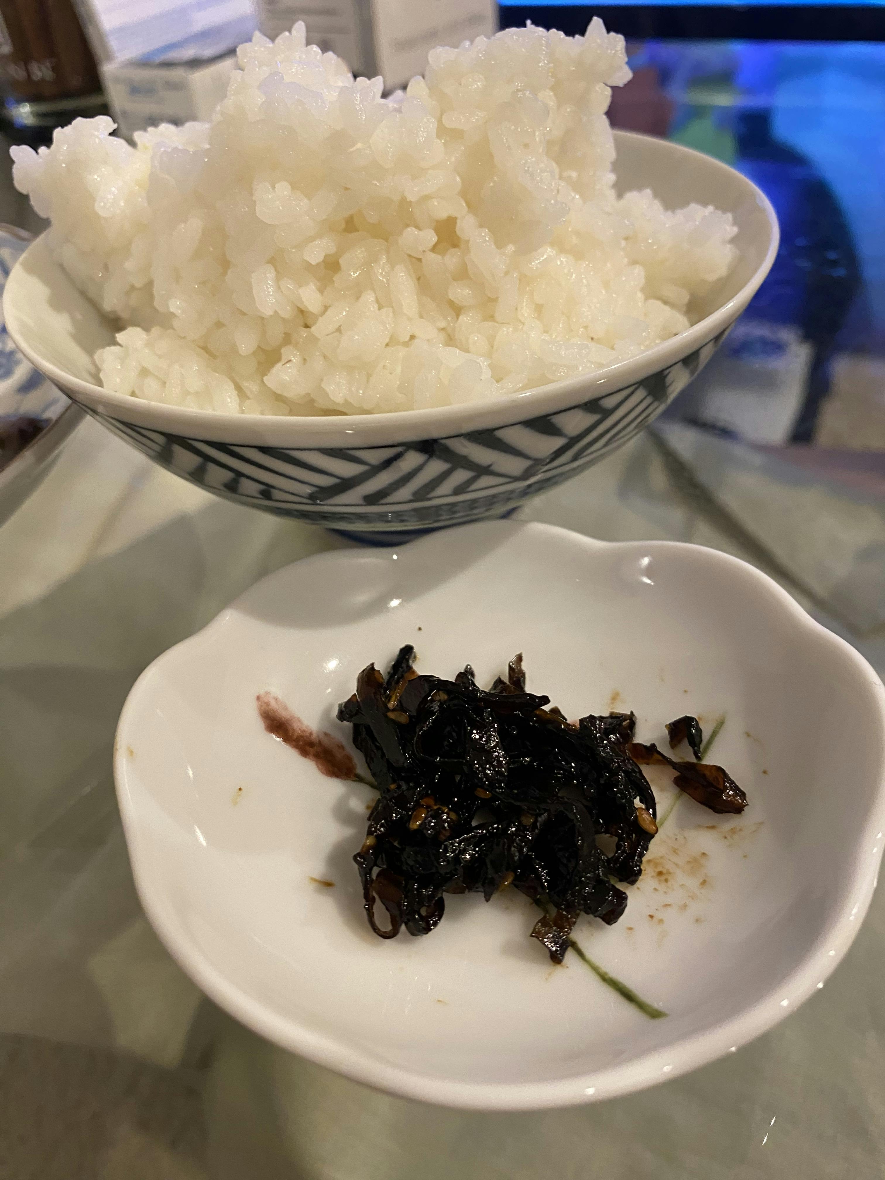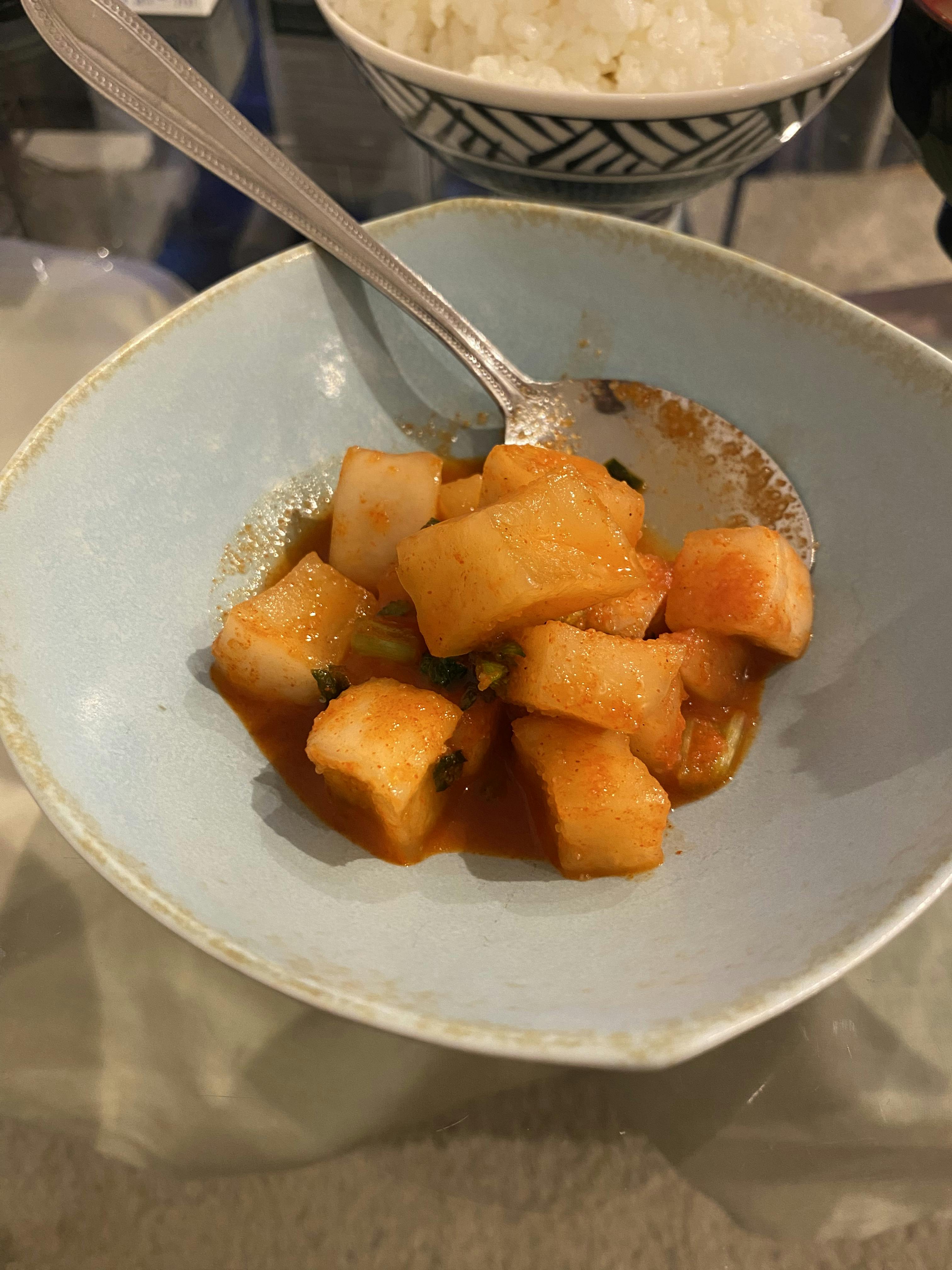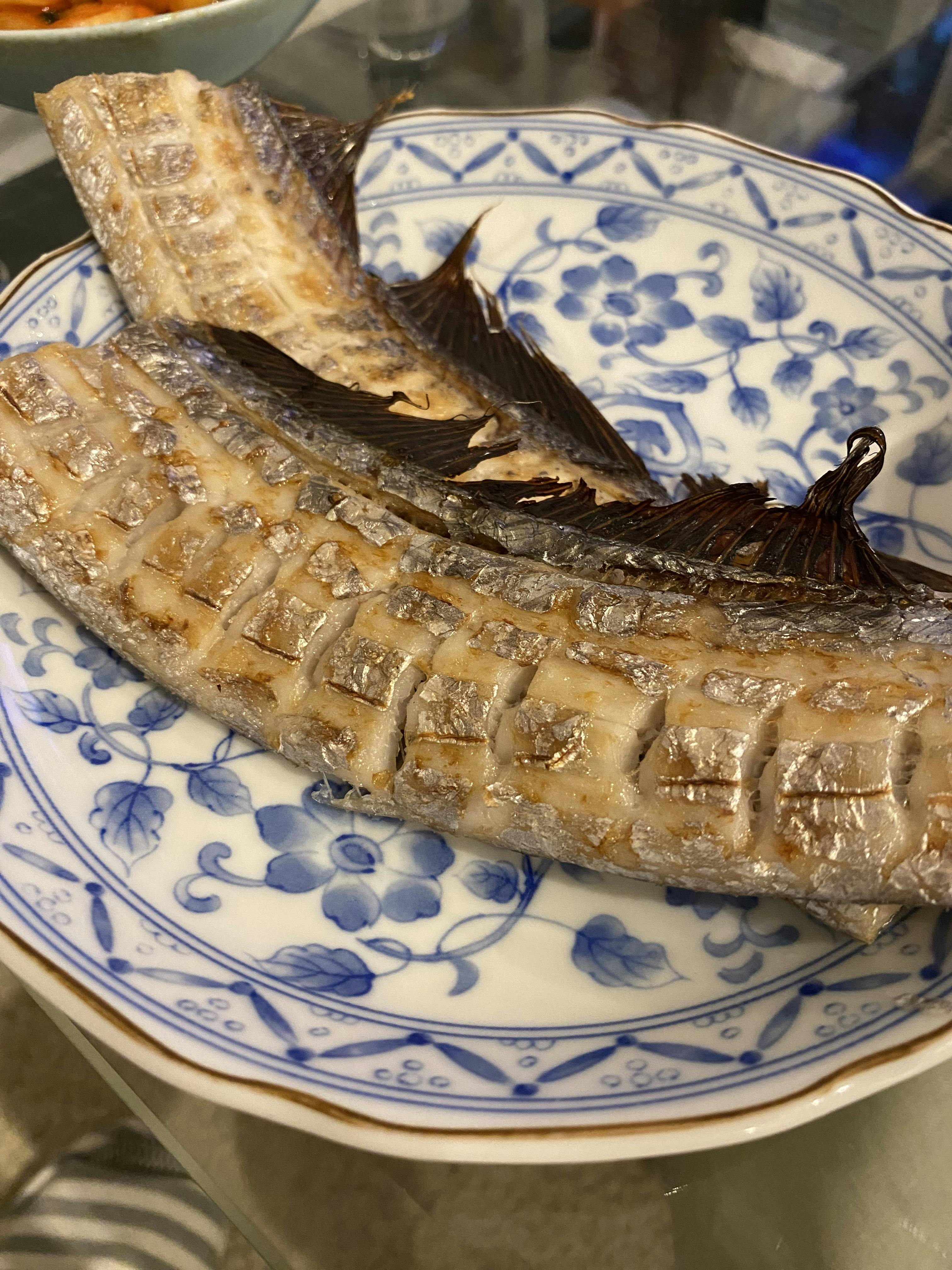 太刀魚がスーパーにあったので塩焼きに! 大根は今回はカクテキにして3日間漬け込んだものです。昆布は頂き物のピリ辛とっても美味しいご飯のお供です〜💓