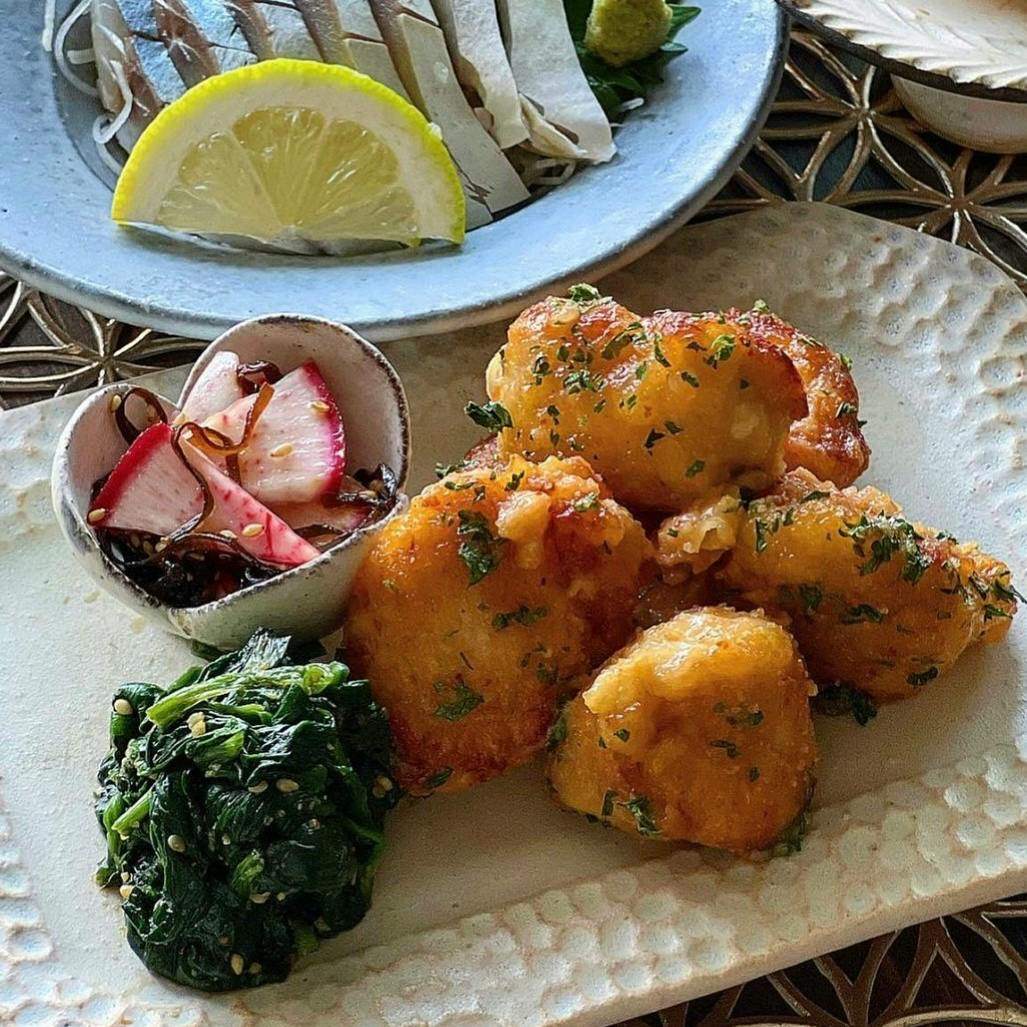 #和定食風ごはん ❁ 塩おにぎり ❁ しめ鯖 ❁ 鶏胸肉のマヨ磯辺唐揚げ ❁ ほうれん草の胡麻和え ❁ 赤かぶの胡麻昆布和え ❁ 彩り卵の袋煮 ❁ 長芋の梅干し和え ❁ 木の子入りぬるねばスープ ❁ みかん🍊 お肉もお魚もあると満足感ありますね。 彩り袋煮にはほうれん草とにんじんで。 塩おにぎりの塩は #ろく助の塩 を使っています。 昆布、干椎茸、干帆立貝が入ってるから旨み調味料で とても美味しいのでおすすめです。