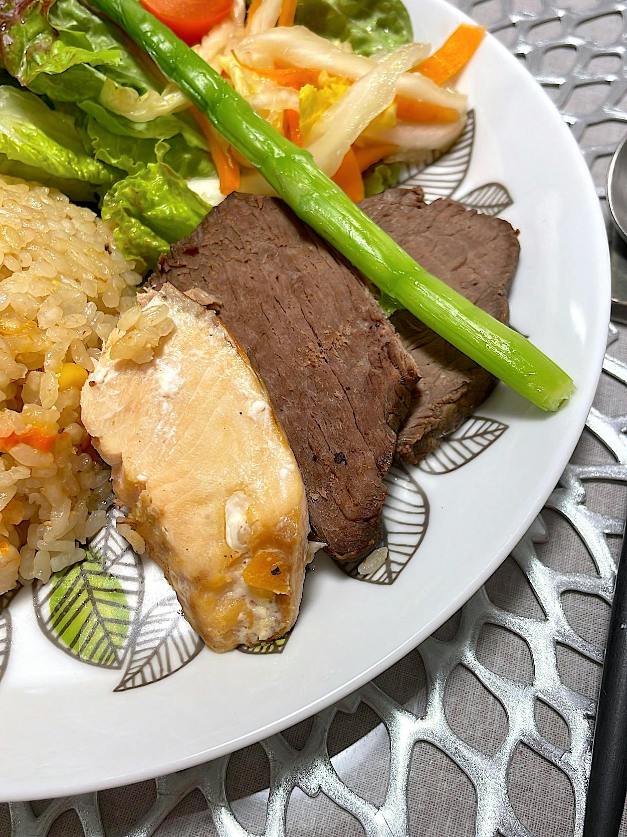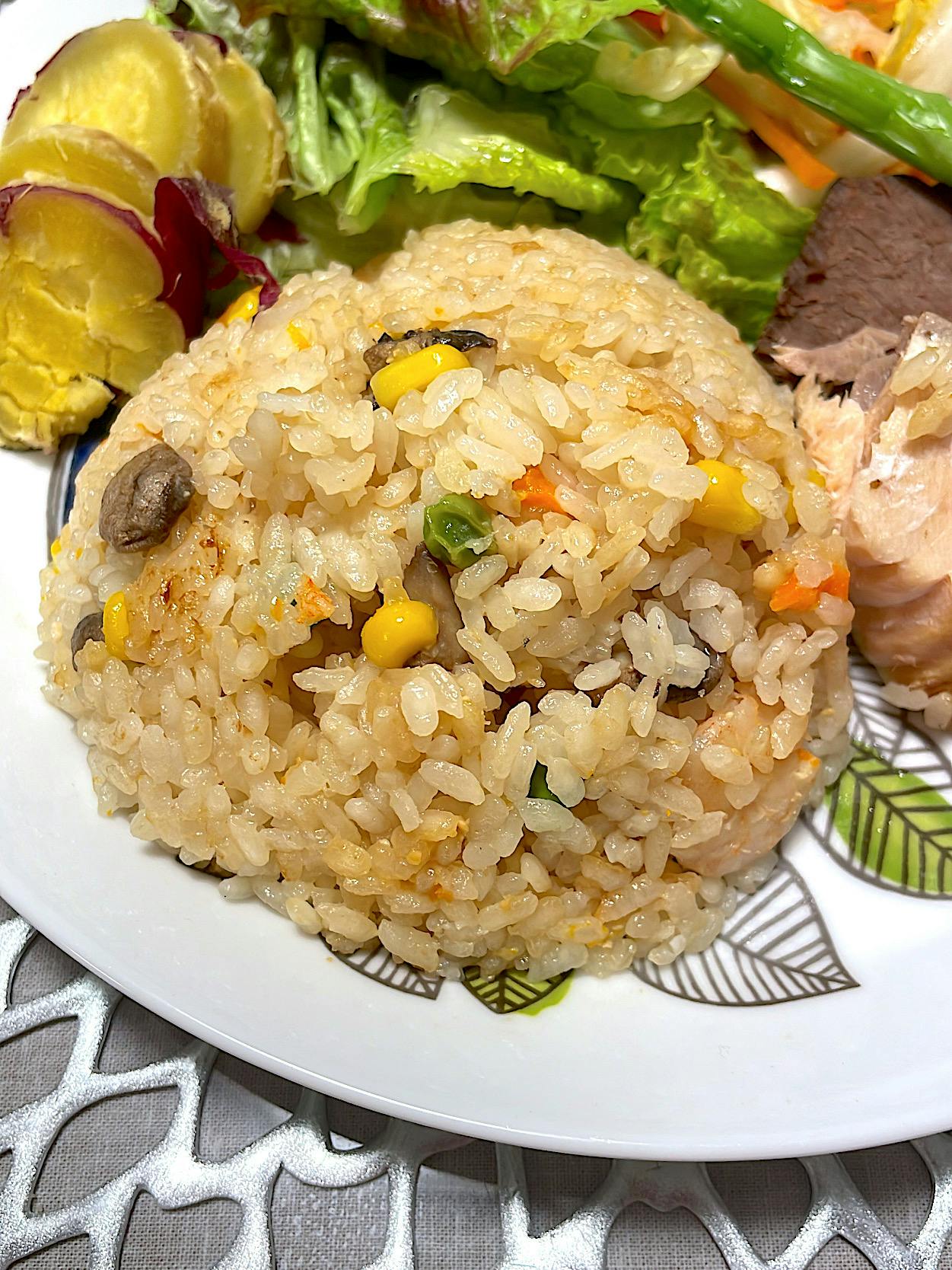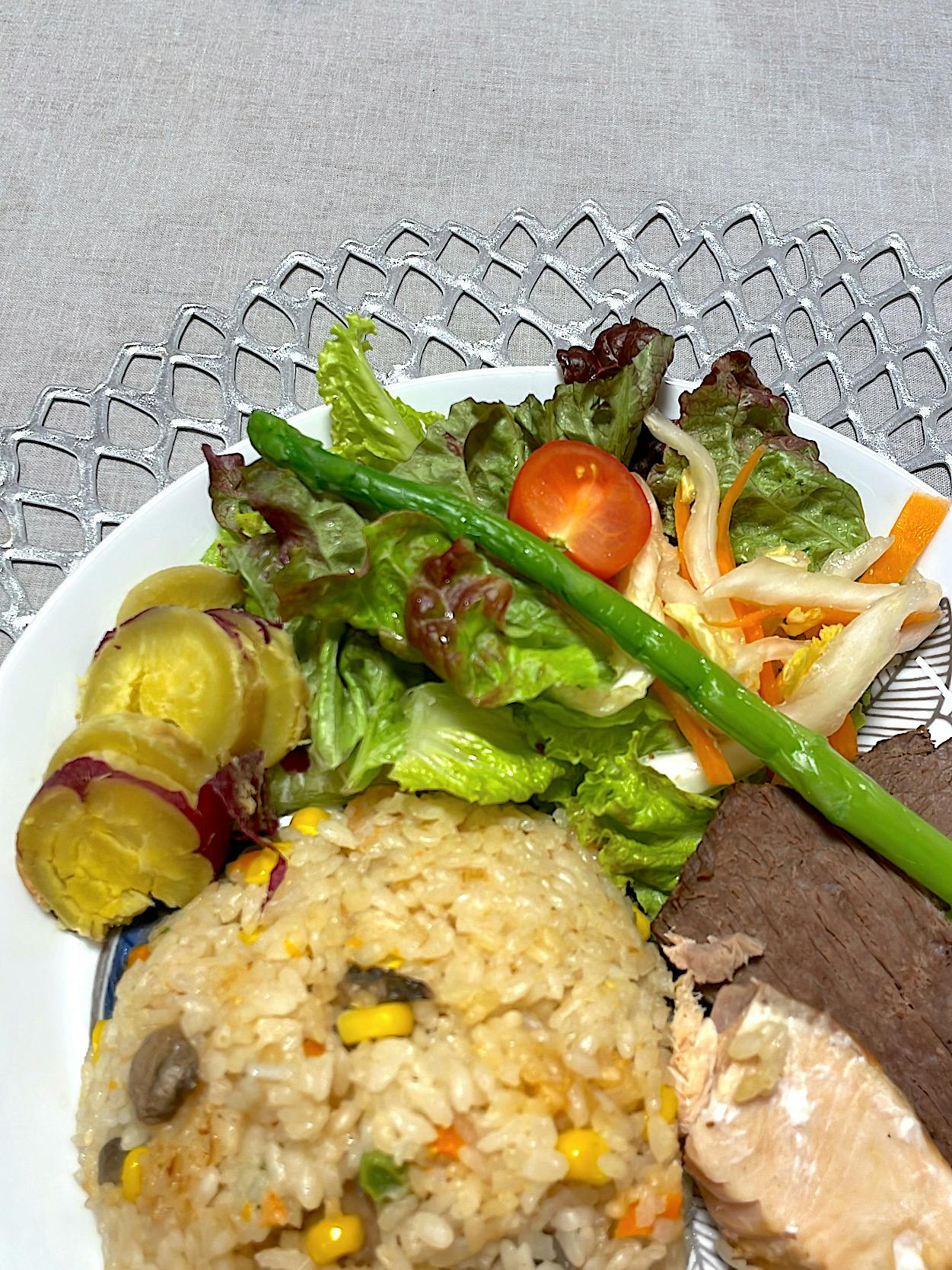 クリスマス余韻ごはんです🎄⏩️ 副菜の薄切りステーキは、親族のクリスマス会でお土産に頂いたローストビーフを、頂いた当日に火を通して翌日も安心して食べられるようにしました。 メインのピラフは、冷凍庫にアルモンデ! 冷凍エビとミックスベジタブル、pal systemさんで購入していた冷凍鮭をお米と一緒に炊飯器に投入!で楽ちん準備でした。 味噌とコンソメ、バターでしっかりめの味付けでした。 炊飯器で鮭を一緒に炊いたことで、メインと副菜を同時に準備できたのもお助かりでした。 サラダも同じくアルモンデ! にんじんや白菜は千切りにして塩麹につけておけば柔らかくなるので生でも食べやすく、準備も簡単でありがたいです。 さつまいもは炊飯器調理→冷凍ストックしているので、使いたい時に使いたい分を解凍して使えるのが便利で重宝しています。