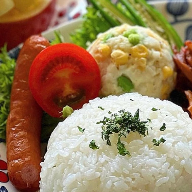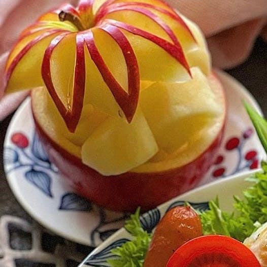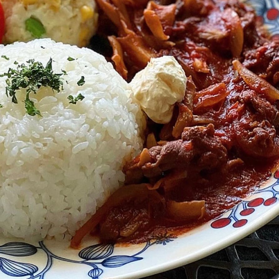 #ワンプレートごはん ❁ ビーフストロガノフ ❁ 長芋のサラダ ❁ 黒豚ウインナー ❁ りんご ❁ カフェオレ ビーフストロガノフプレートです。 トッピングはいつもサワークリームで。 長芋のサラダがポテサラとはまた違った美味しさですよ。 りんごは飾り切りしてみました。