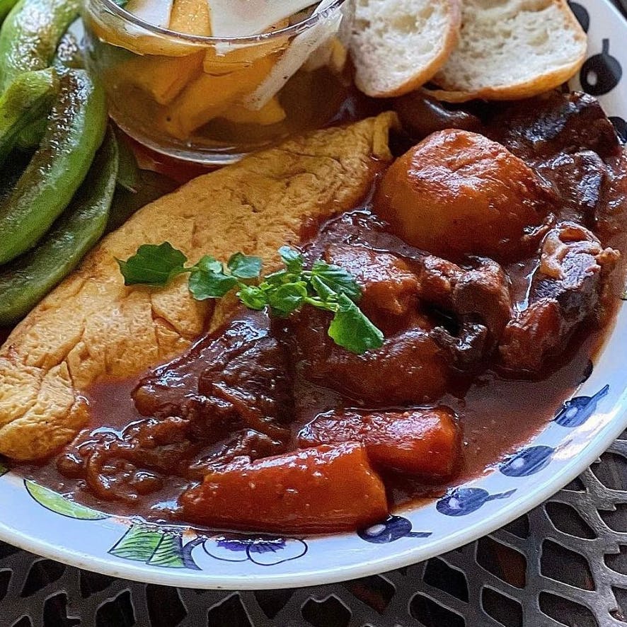 #ビーフシチュープレート ❁ オムビーフシチュー ❁ 柿と蕪のマリネサラダ ❁ スナップエンドウのバターソテー ❁ ソーセージ ❁ パン ❁ 小松菜とりんごとバナナのスムージー トロトロのビーフシチューにオムレツを合わせて オムビーフシチューに。 シャキシャキのスナップエンドウのバターソテーも 美味しいですよね。