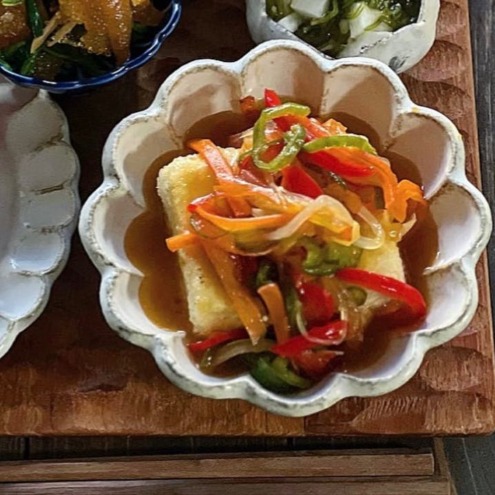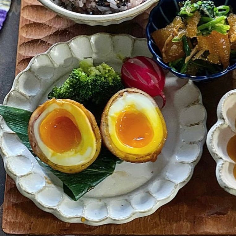 # 和食ごはん ❁ 肉巻き半熟卵 ❁ 揚げ出し豆腐の野菜あんかけ ❁ 松前漬けのほうれん草和え ❁ 長芋とめかぶの山葵しょうゆ ❁ 十六雑穀ごはん ❁ 鶏と色々野菜の味噌汁 半熟卵は豚バラ肉を巻いて甘辛で炒めてます。 中は黄味がとろ〜りで美味しい♡ 揚げ出し豆腐も野菜のあんかけをのせると美味しさも さらにアップ。 お野菜もとれてボリュミーな一品になります。