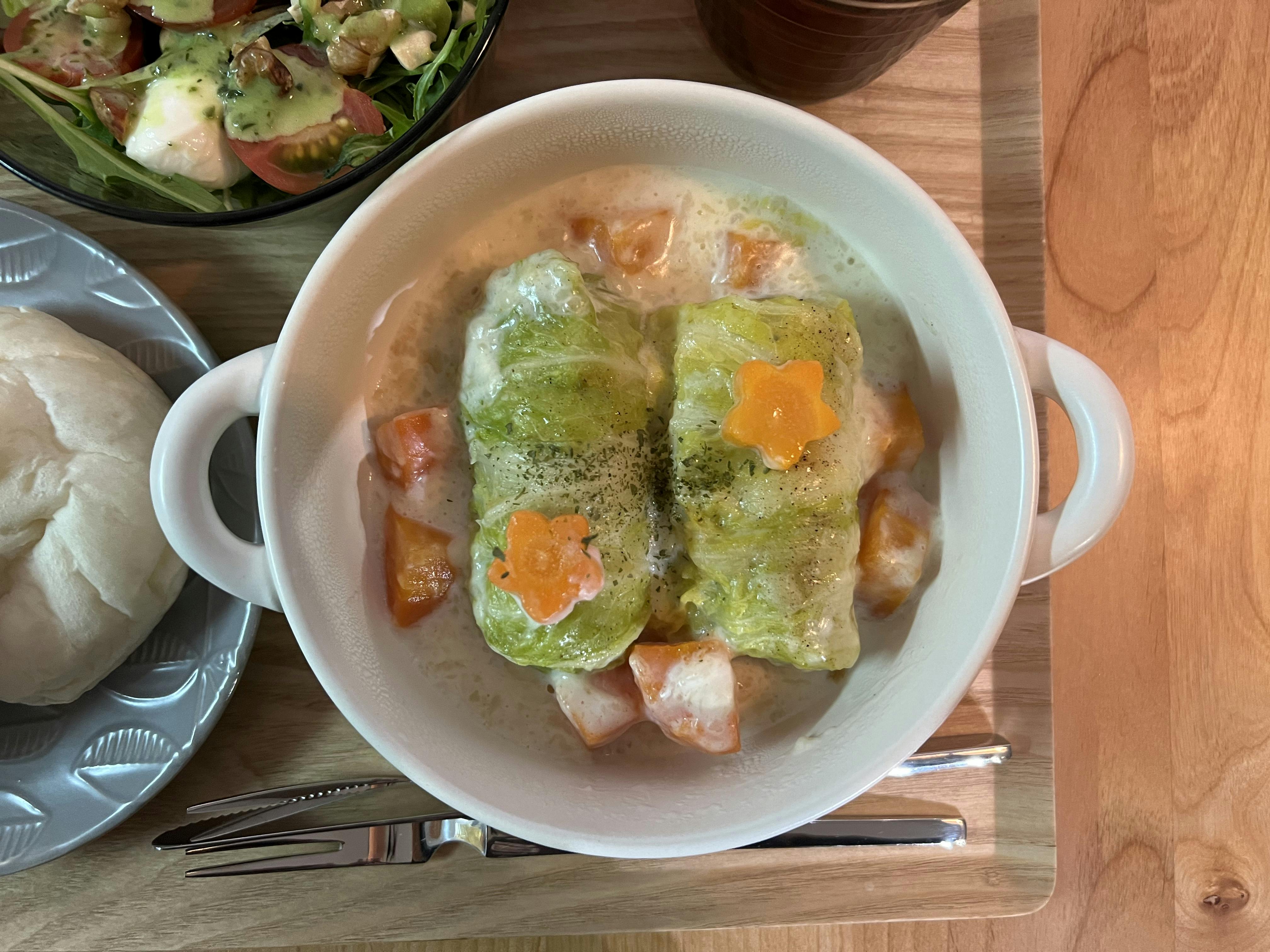 🥬🥕🌀 𖧵はちみつがけ白パン 𖧵ロール白菜のクリーム煮 𖧵アボカドとモッツァレラのバジルマヨサラダ 𖧵いちご 𖧵りんご ロールキャベツならぬロール白菜に 初めて挑戦しました ˊ˗ 難しいイメージだったけど レンジで白菜温めて、タネ作って、 巻き巻きして、煮込めば簡単✨ 息子の取り分け用に大きめの人参1本分も一緒に入れたから お鍋の中が人参だらけになりました🎉🥕🎉 :