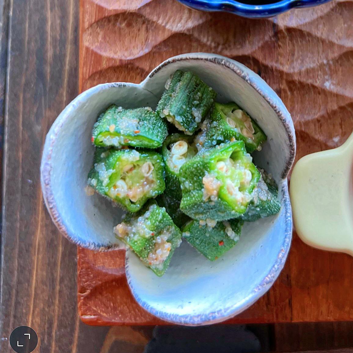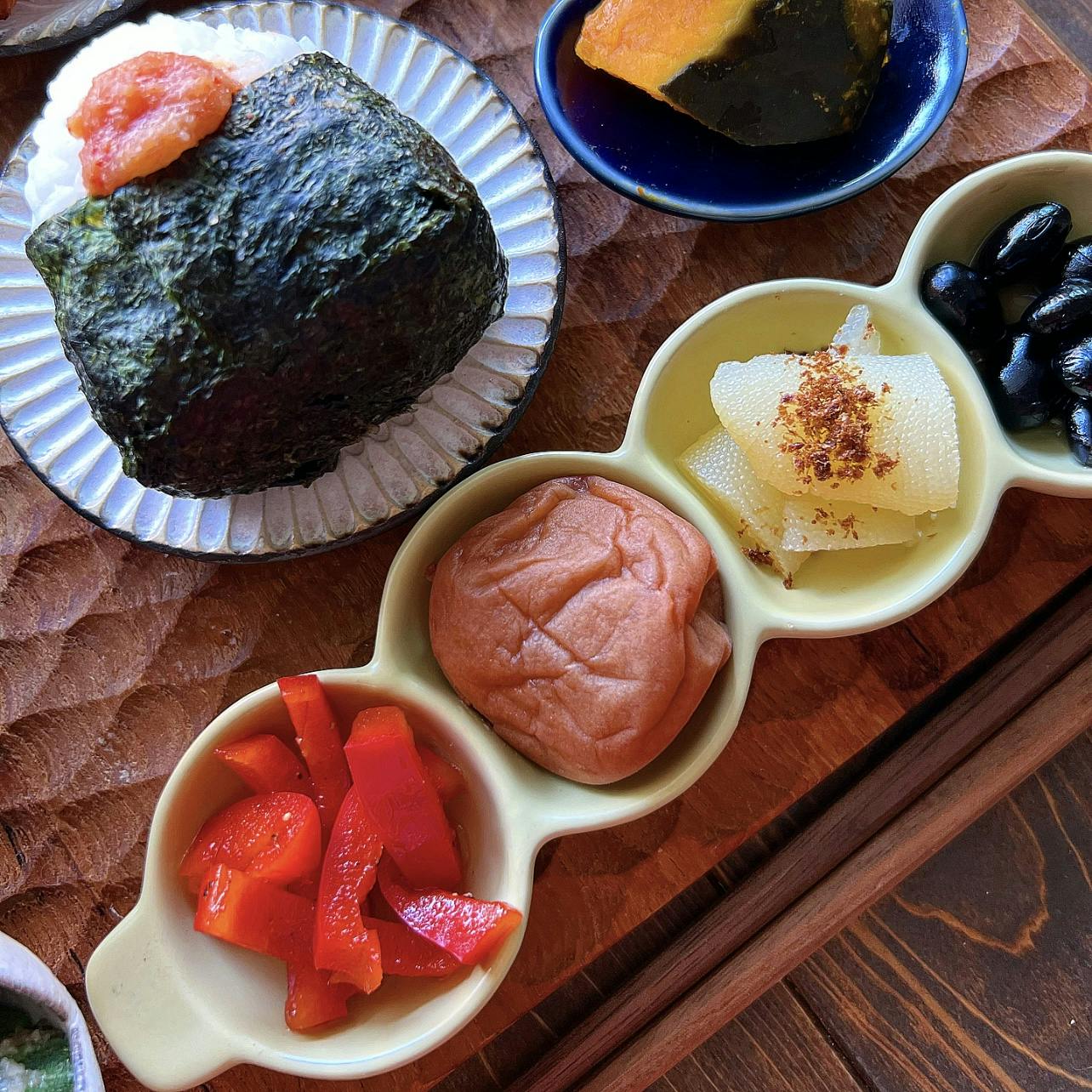 #豆皿ちょこちょこごはん 豆皿を並べて作り置きしていたおかずを少しずつ盛り付けてみました。 いろいろなものを少しずつってなんだか嬉しいですよね🤗 ❁ 明太子おにぎり🍙 ❁ ヤンニョムチキン ❁ 鮭の塩麹焼き ❁ 高野豆腐の含め煮 ❁ きんぴらごぼう ❁ かぼちゃの煮物 ❁ オクラの明太子和え ❁ 4連豆皿 (パプリカのマリネ、梅干し、数の子、黒豆) ❁ 小松菜と舞茸の味噌汁 ❁ いちご