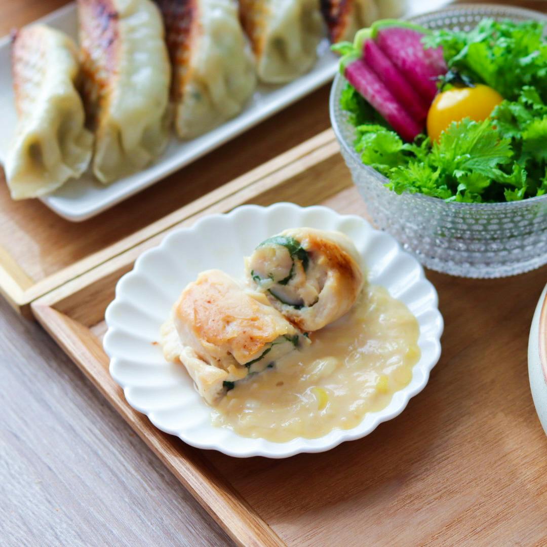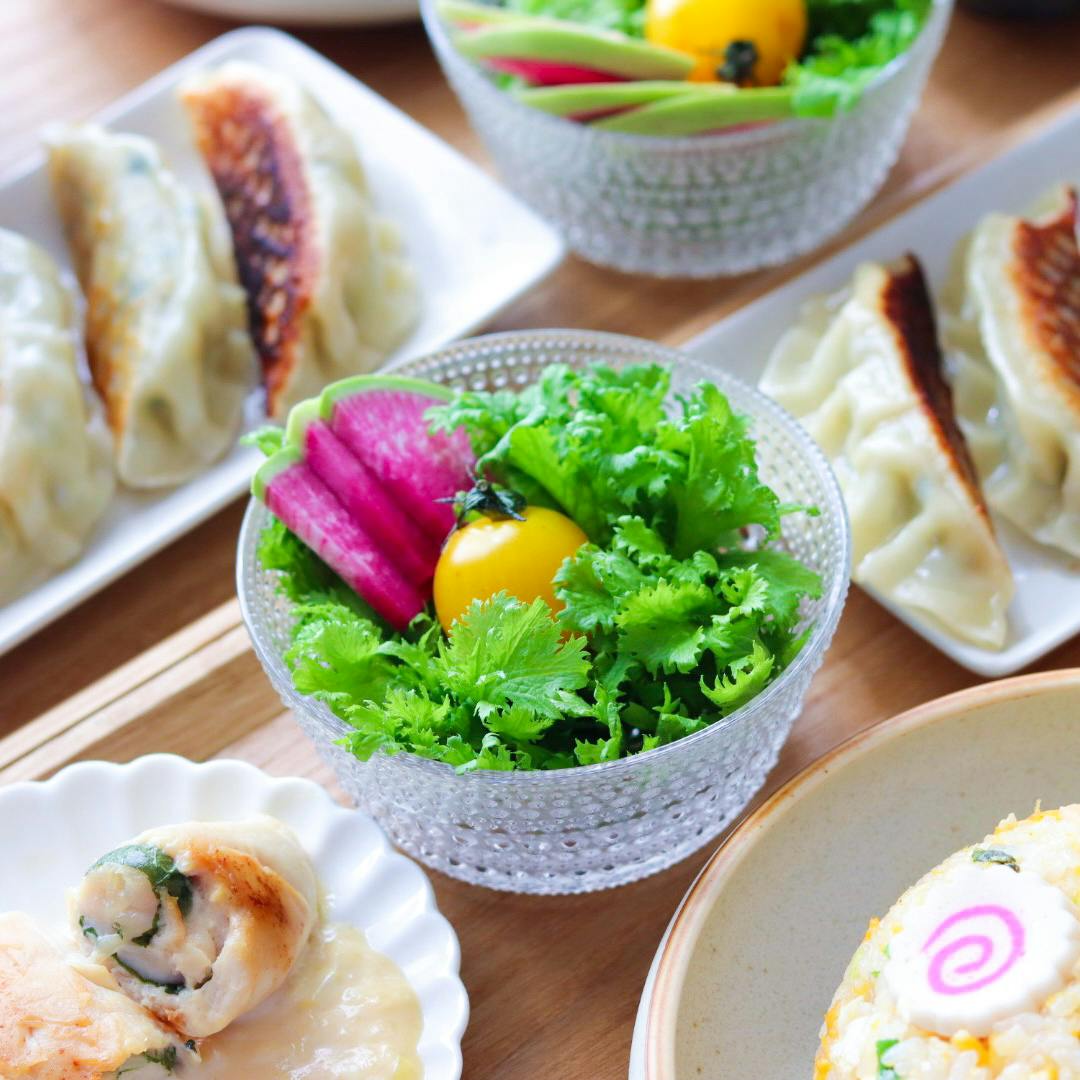 ꕤ 炒飯 ꕤ マンドゥ ꕤ みそマヨのささみ大葉巻き ꕤ サラダ ꕤ えのきの酸辣湯風スープ ꕤ フルーツ