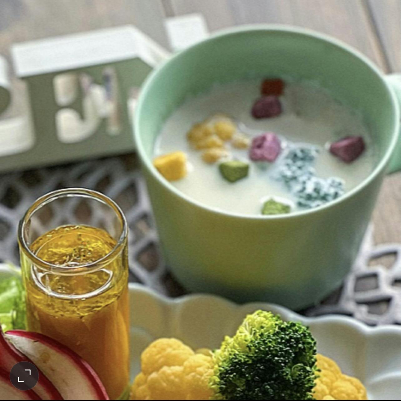 ドレスドオムライスのように見えますがドレス卵と焼きベーコンを乗せた甘くないお食事系のパンケーキです🥞 エリンギステーキ、フレッシュサラダ、ボイルブロッコリーを添えたお野菜いっぱいのワンプレート朝ごはん。 ❁ ベーコンと卵のパンケーキ ❁ エリンギのステーキ ❁ 彩りサラダと2色の茹でブロッコリー ❁ 残り野菜とSOVE入りのミルクスープ ❁ りんごジュース