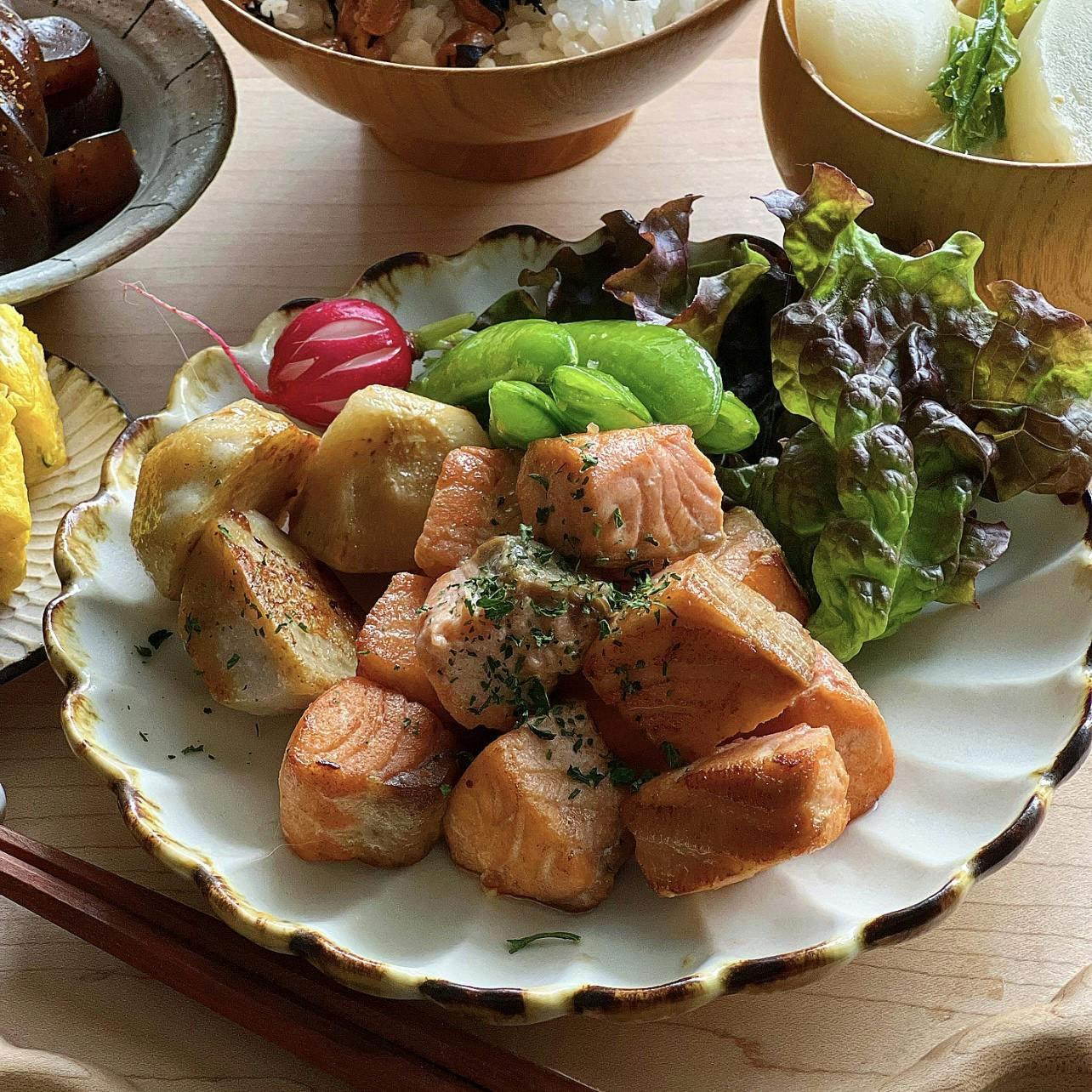 コロコロのサーモンステーキ風が美味しいあさごはん🍚 卵焼きはネギ入りです。 数の子は冷凍保存しています。 栄養価が高いので普段の食卓でも取り入たい食材です。 ❁ サーモンのコロコロステーキ風 ❁ 里芋のバターしょうゆソテー ❁ スナップエンドウのナムル ❁ ネギ入りだし巻き卵 ❁ ピリ辛ねじりこんにゃく ❁ 納豆ひじき数の子ごはん ❁ かぶと油揚げの味噌汁 ❁ みかん
