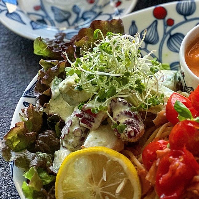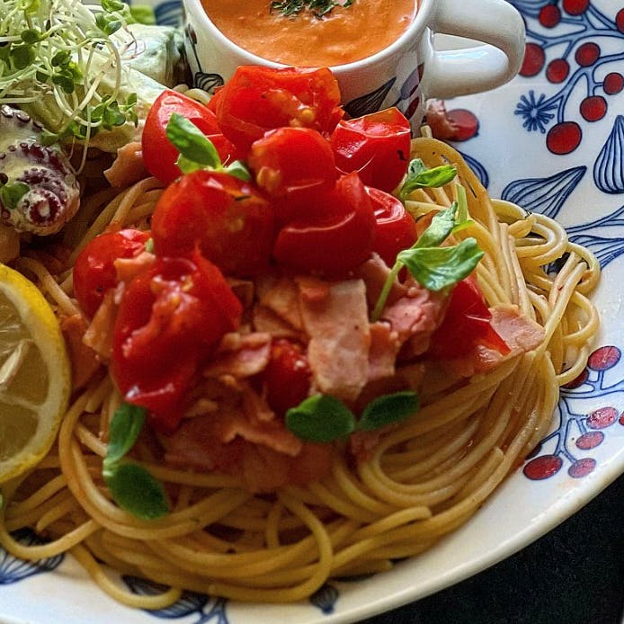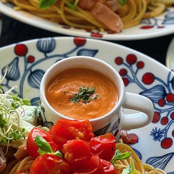 完熟の甘いアイコトマトを使ったパスタです。味付けはシンプルにコンソメと塩こしょうで🍝 トマトの風味が生きていて美味しい。 トマト大量消費のためポタージュにも。 じゃがいも玉ねぎでトロミがついてこちらも美味でした🍅 ❁ トマトとベーコンのパスタ ❁ トマトのポタージュ ❁ タコとアボカドのマヨわさサラダ ❁ ブルーベリーヨーグルト