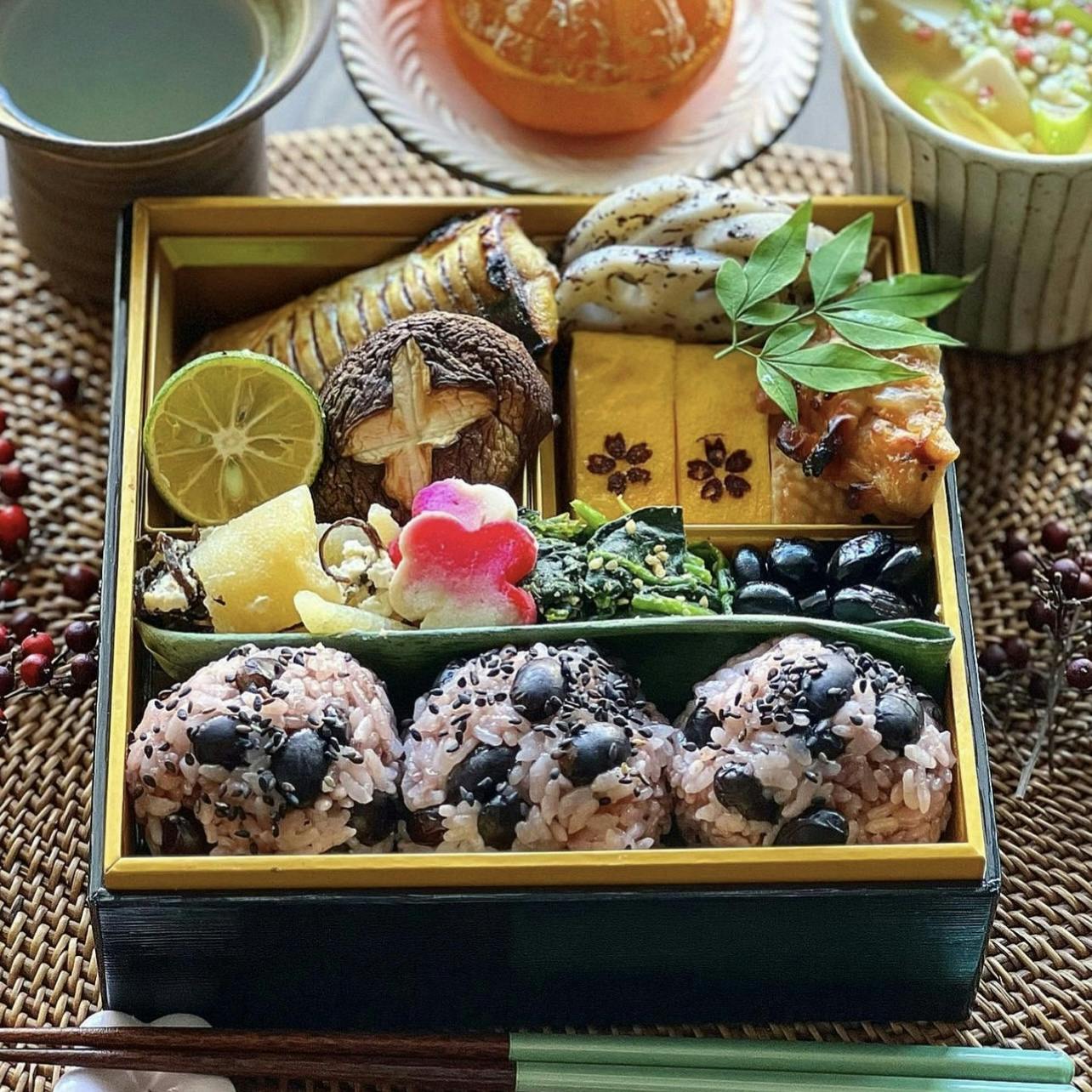 おせちのお重箱再利用。 黒豆ごはんをおにぎりにしてお弁当風にしました。 ちょっぴり春を感じるお弁当です。 ❁ 黒豆ごはんのまんまるおにぎり ❁ 数の子とクリームチーズの塩昆布和え ❁ 鯖の塩焼き ❁ 鶏肉の味噌焼き ❁ 玉子焼き ❁ 赤じそ蓮根 ❁ 焼き椎茸 ❁ 梅麩 ❁ ほうれん草のごま和え ❁ 黒豆の煮方 ❁ 豆腐とネギと油揚げの味噌汁 ❁ みかん🍊