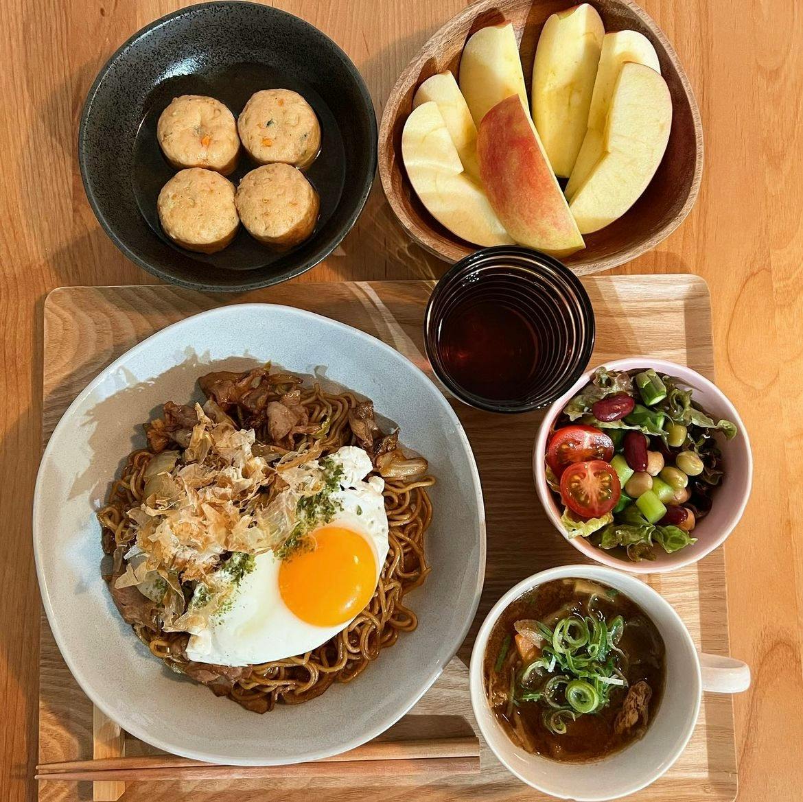 🥬🥚🍜 𖧵白菜の焼きそば 𖧵豚汁 𖧵 お豆とアスパラのコロコロサラダ 𖧵 6種野菜のがんもの含め煮 𖧵りんご 冬にいただいた白菜がまだ残っていたので キャベツは買わずに 白菜で焼きそばを作ってみました👩🏻🍳💡 初めて白菜で作ったけど、 焼き目が付くまで焼いてから麺も入れて仕上げると 全然べちゃっとせずに美味しく仕上がりました🖖🏻💞 :