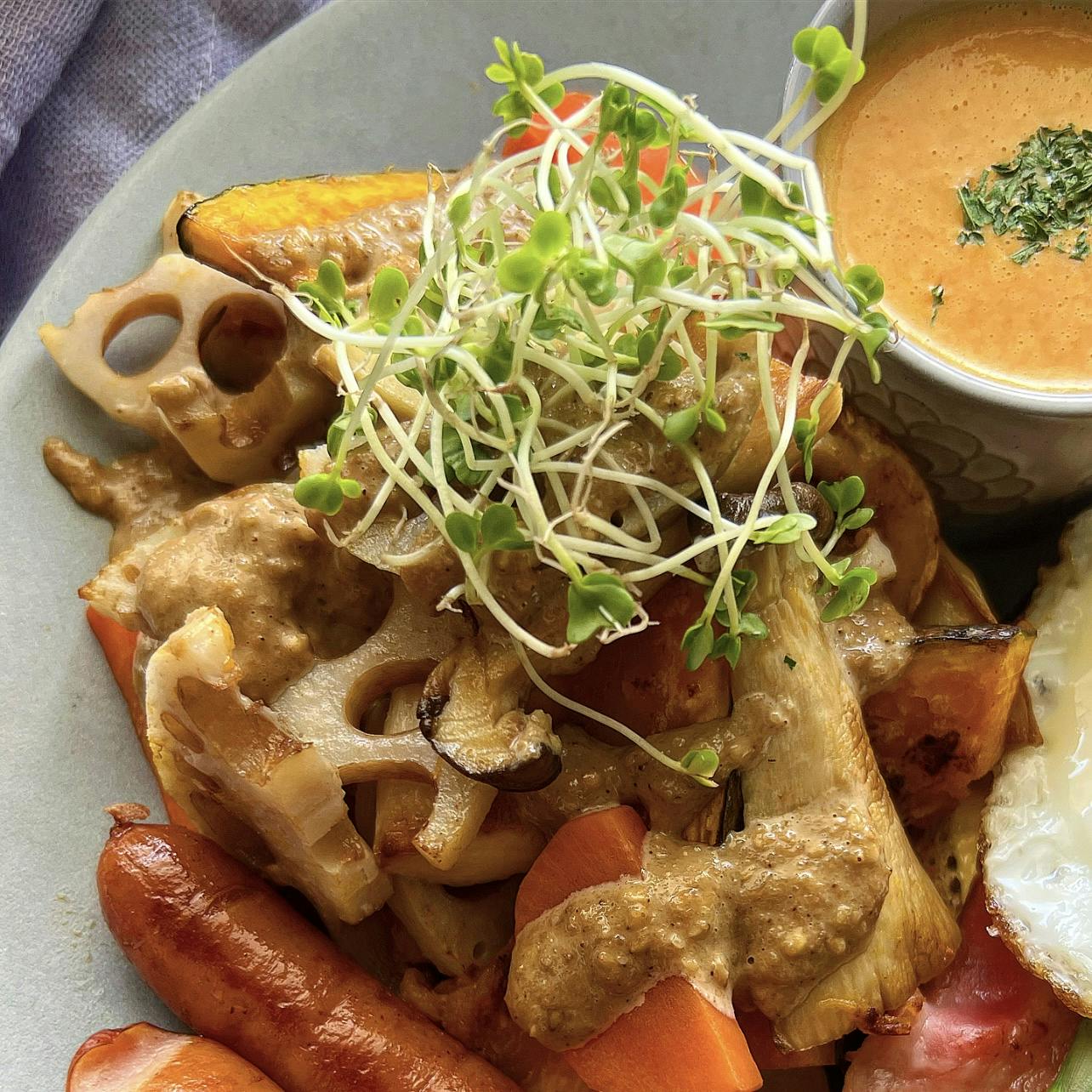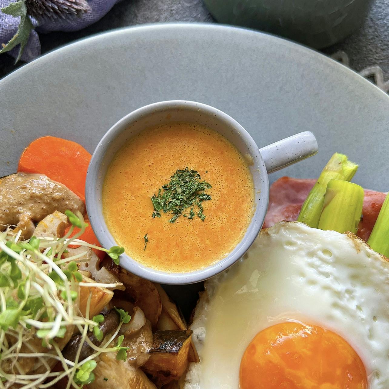 ❁ アスパラとベーコンと卵のオープンサンド ❁ 根菜ときのこのホットサラダ ❁ ボイルソーセージ ❁ にんじんのポタージュ たっぷりマヨネーズに粒マスタードチーズを乗せて ベーコン、アスパラガス、目玉焼きを重ねたオープンサンド。 かなりボリュミー✨ 根菜ときのこのホットサラダは れんこん、かぼちゃ、にんじん、エリンギ、しめじ。 生野菜よりホットサラダにした方が 身体にもやさしいですよね。 自家製ごまドレッシングで。 ドレッシングの 簡単レシピ 載せています。 濃厚ドレッシングで 肉料理にも魚料理にも使えるかと思います。
