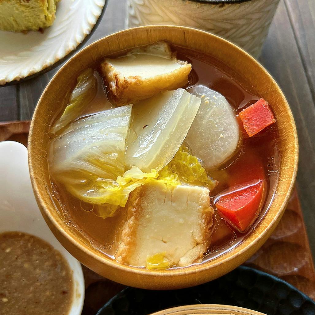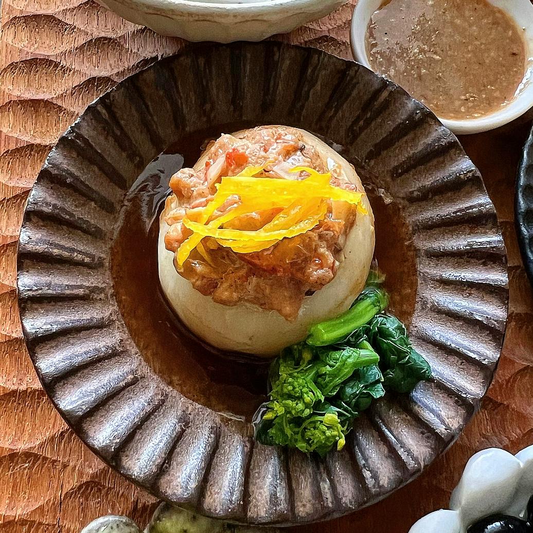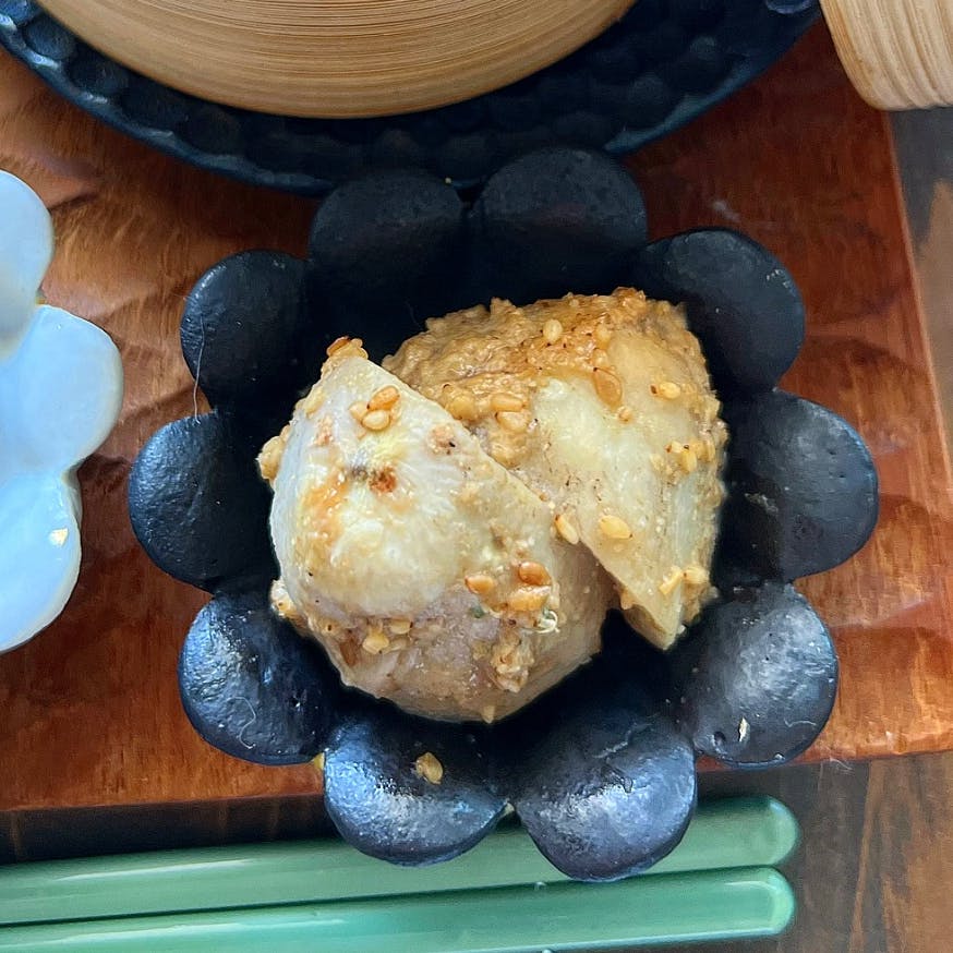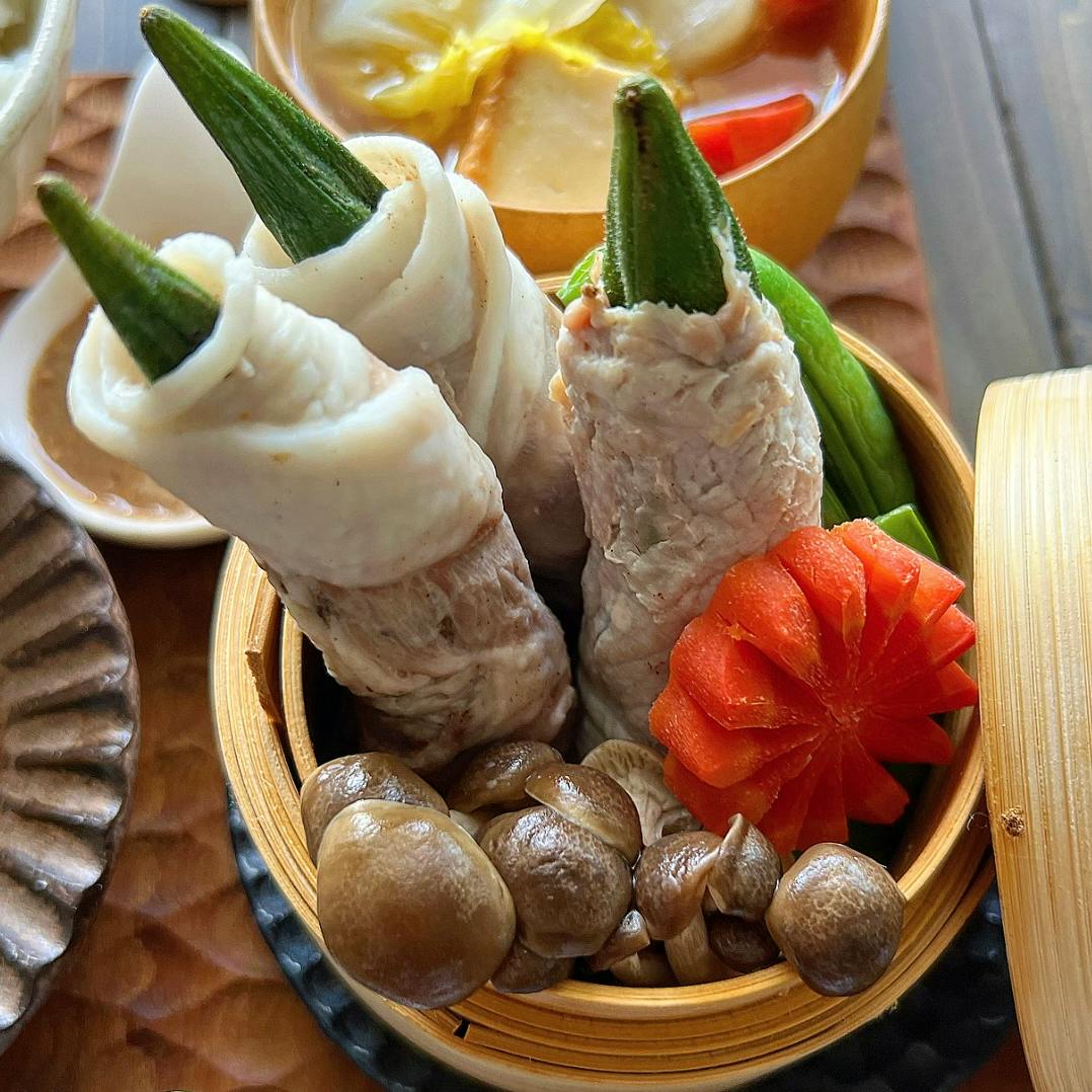 かぶの肉詰めの中身はお肉ではなく 大豆のお肉を使ってみました。 椎茸とにんじんのみじん切り、溶き卵、片栗粉、すりおろし生姜、塩こしょうで味付けしたものを詰めてコトコトと煮ました。 トロトロのかぶは絶品です。 ❁ まるごとかぶの肉詰め風あんかけ煮 ❁ 肉巻きオクラと野菜のせいろ蒸し 自家製胡麻だれで(しめじ、スナップエンドウ、人参) ❁ ブロッコリーのおかか和え ❁ 黒豆の煮方 ❁ 里芋の胡麻だれ和え ❁ 赤しそ梅ごはん ❁ 厚揚げと残り野菜の味噌汁 ❁ ピスタチオチーズケーキ