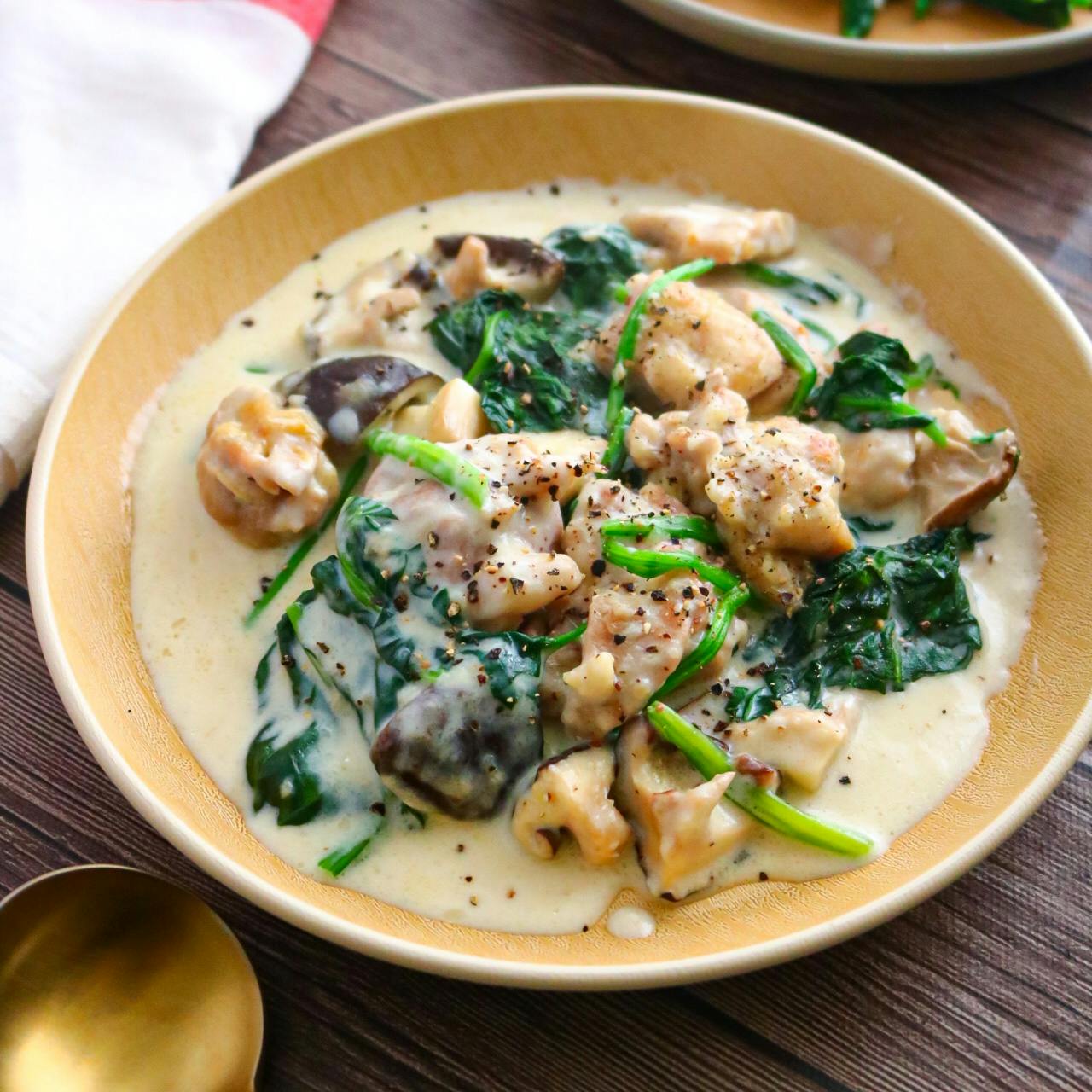鶏肉ときのこを使ったクリーム煮献立。 ゴロっと感を出すためにきのこはエリンギとしいたけ使用♪もちろんしめじやまいたけでもOK! 副菜もチーズやペペロンチーノ風に炒めた副菜で洋風に仕上げた献立です(*^-^*)