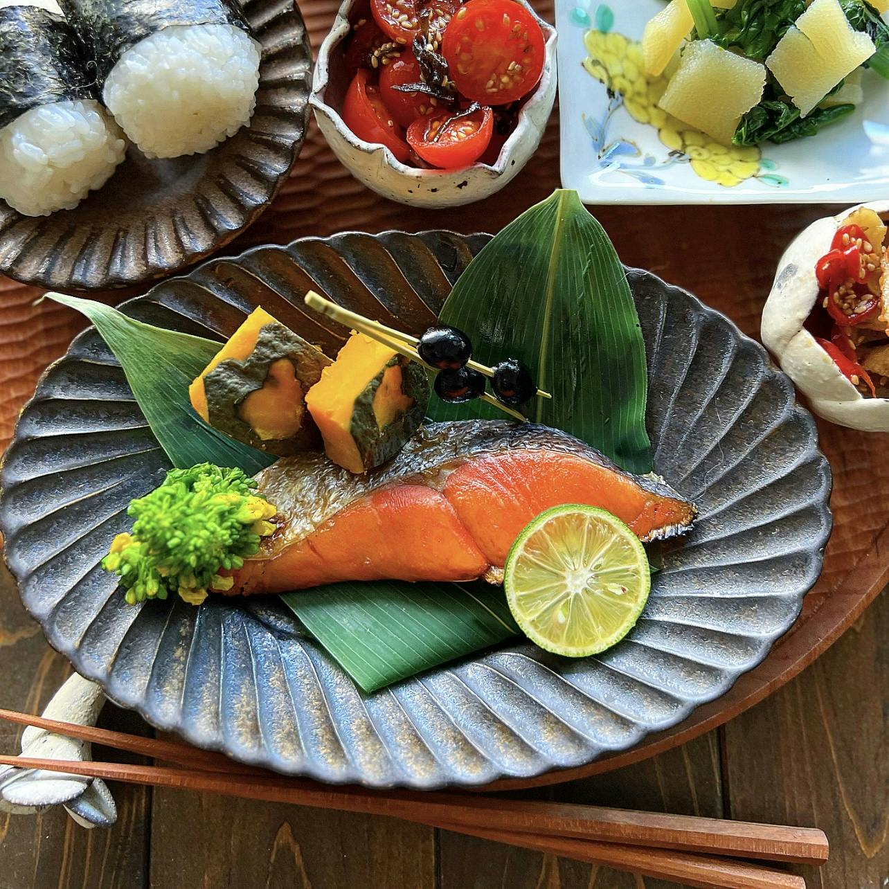 朝食べる鮭の塩焼きはやっぱり美味しいですね。 俵形のおむすびを合わせてみました。 ❁ 俵おむすび ❁ 絹揚げと菜の花の味噌汁 ❁ 鮭の塩焼き かぼちゃの煮物 黒豆の煮方 ❁ 数の子と菜の花のあえもの ❁ ちくわとパプリカのきんぴら ❁ トマトのごま塩昆布あえ