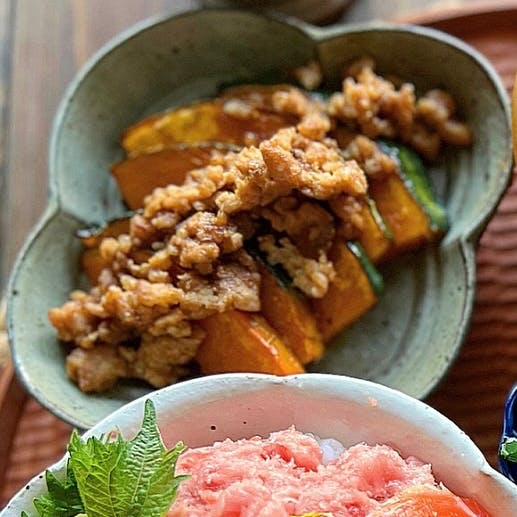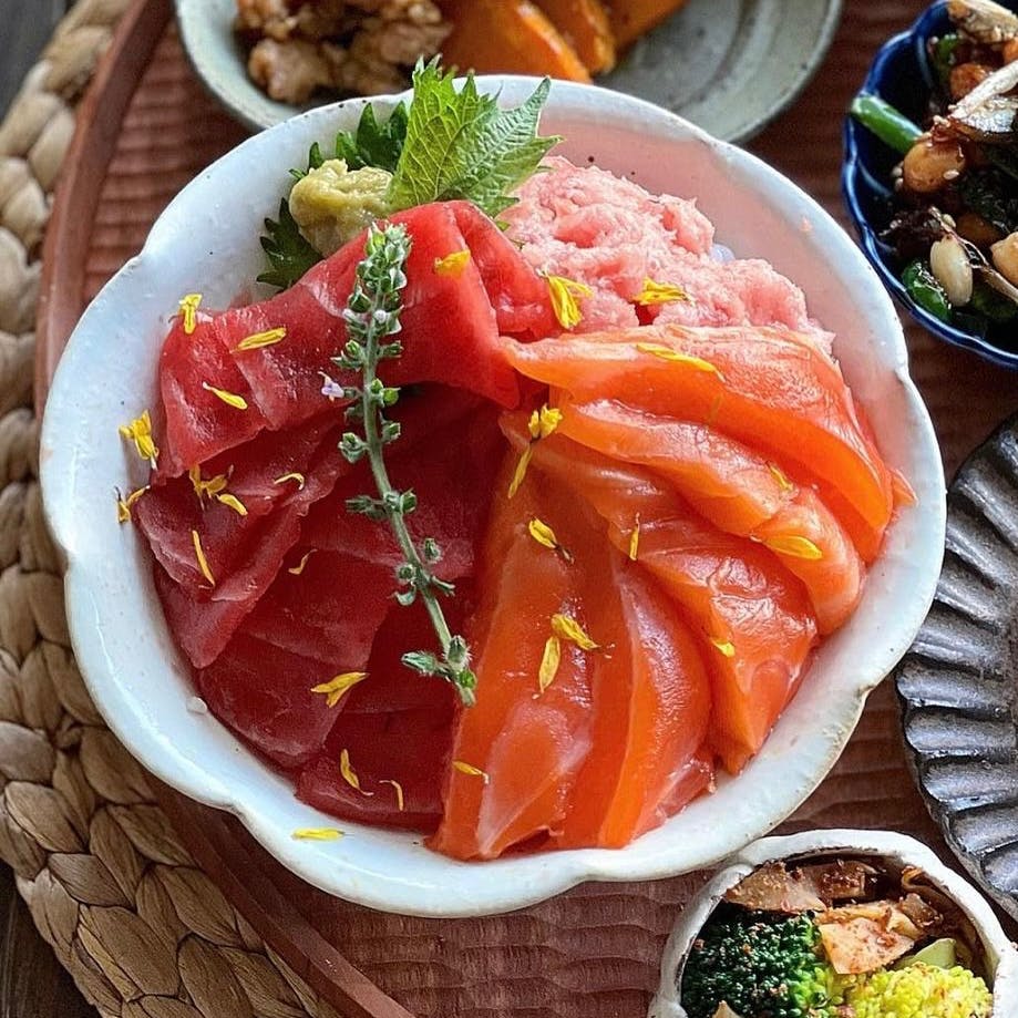 ❁ 3色海鮮丼 ❁ かぼちゃのソテーそぼろあん ❁ 温奴の明太ソースかけ ❁ ピーマンと小魚のみそピーナッツ炒め ❁ ゴボウの甘辛煮 ❁ ブロッコリーと筍の佃煮のおかか和え ❁ 長芋と挽き肉と小松菜の味噌汁 まぐろ、サーモン、ネギトロの3色の海鮮丼。 その他、根菜多めの副菜をちょこちょこと合わせました。 和食はやっぱり気持ちもほっこりしますね。
