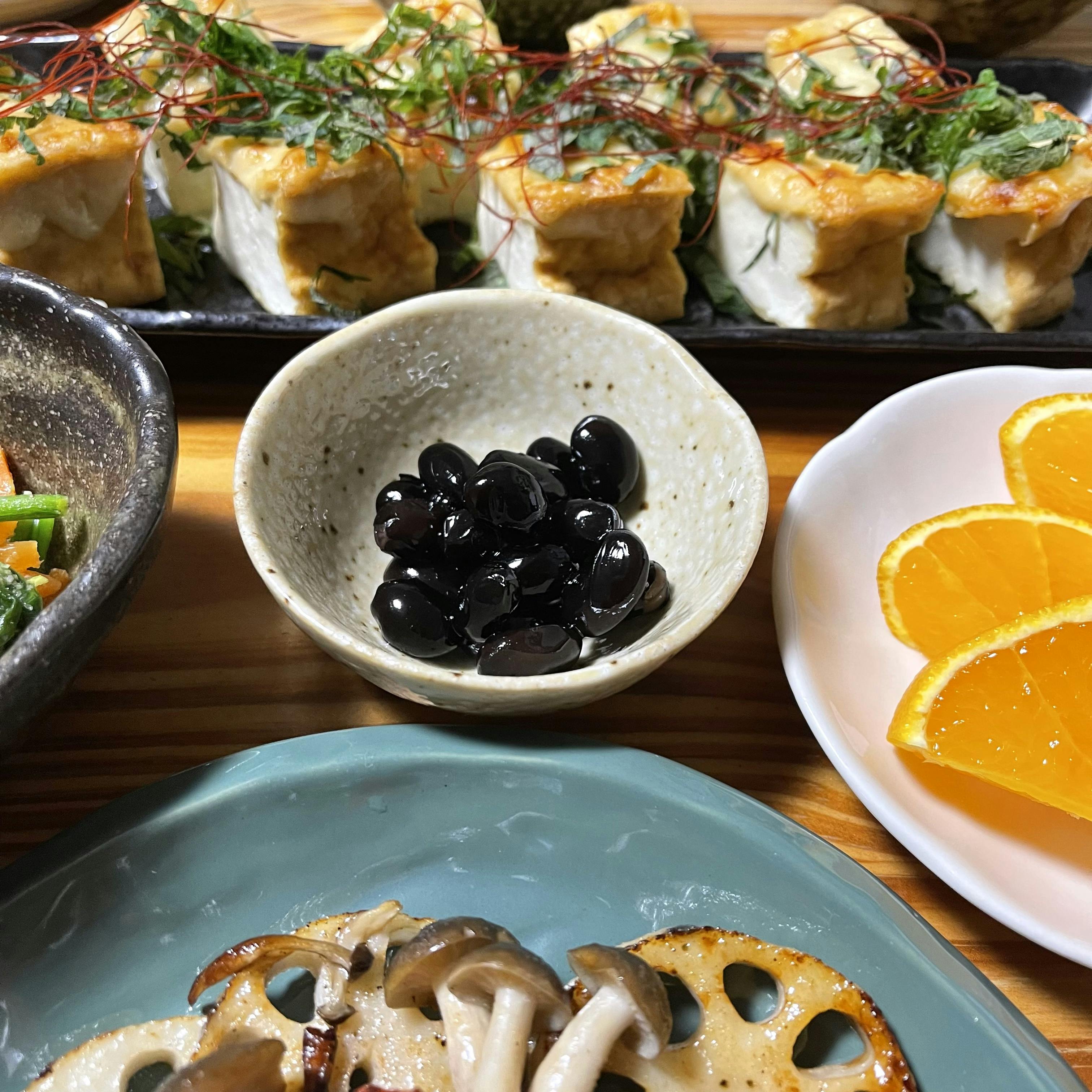 *ピーマンの肉巻き 🫑 *厚揚げの味噌チーズ焼き *ほうれん草と人参の胡麻和え *黒豆 *味噌汁 (キャベツ・ワカメ) *不知火🍊 *玄米入りごはん🍚 ✼••┈┈┈┈┈┈┈┈┈┈┈┈┈┈┈┈┈┈••✼ 肉巻き🫑の付け合わせで焼いたレンコン👩🍳 レンコンって焼いたらメチャ美味しいよねぇ〜✨ 厚揚げの味噌チーズ焼き🧀も美味しかったです〜✨