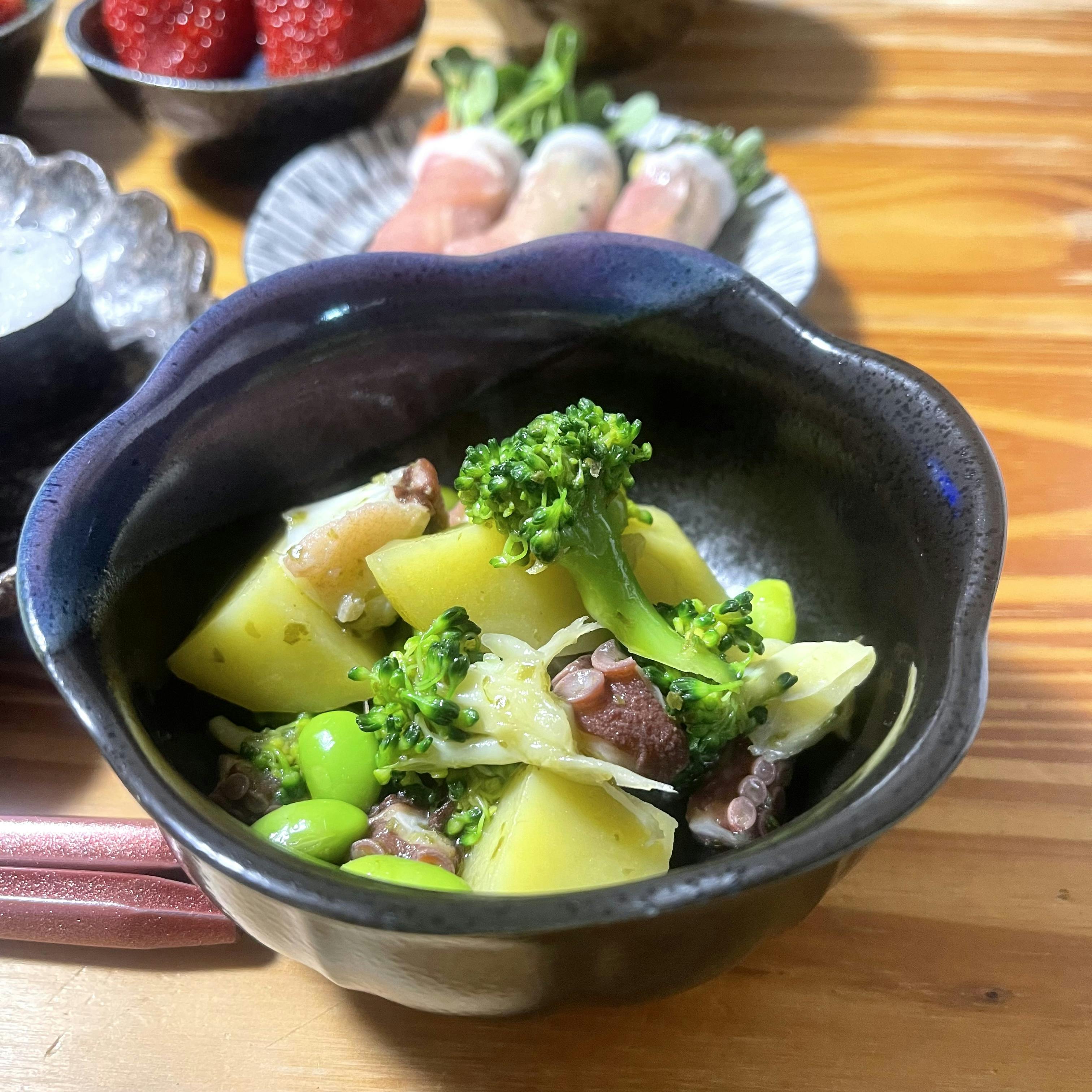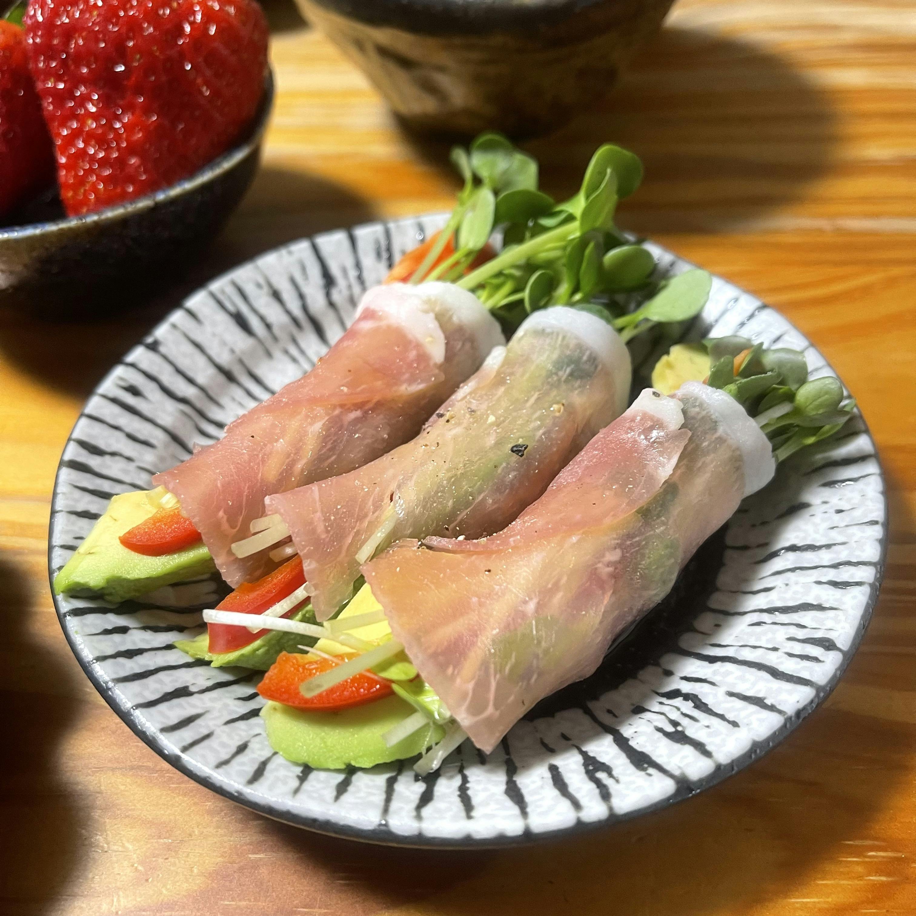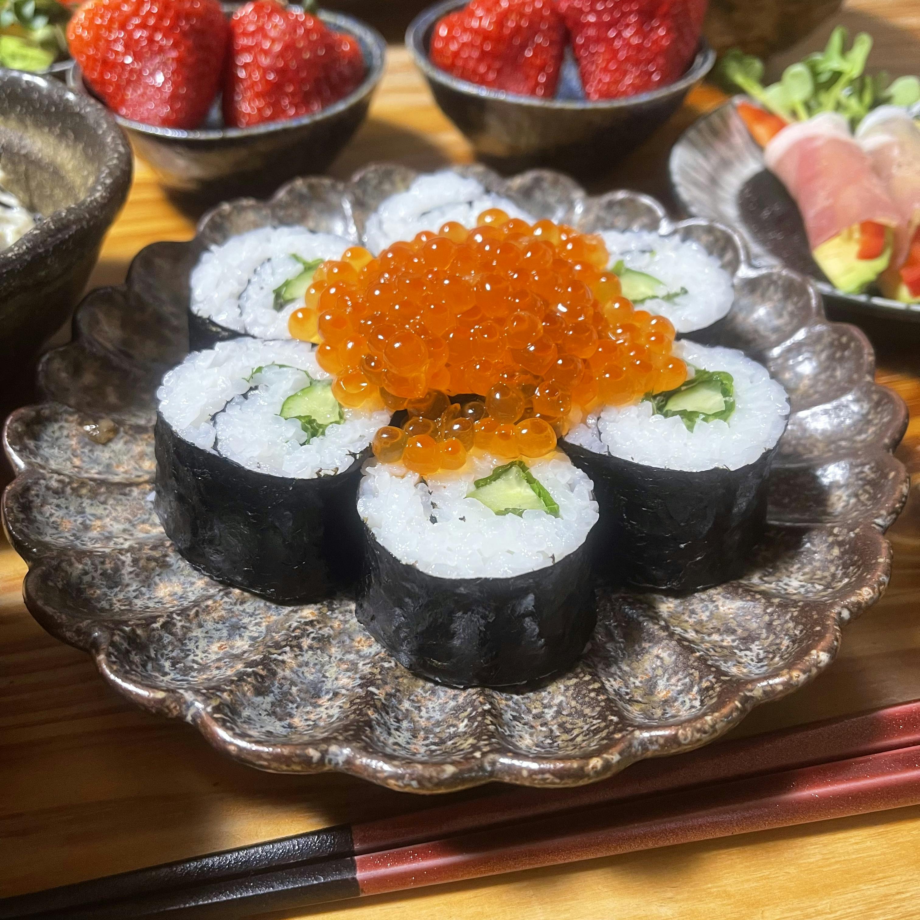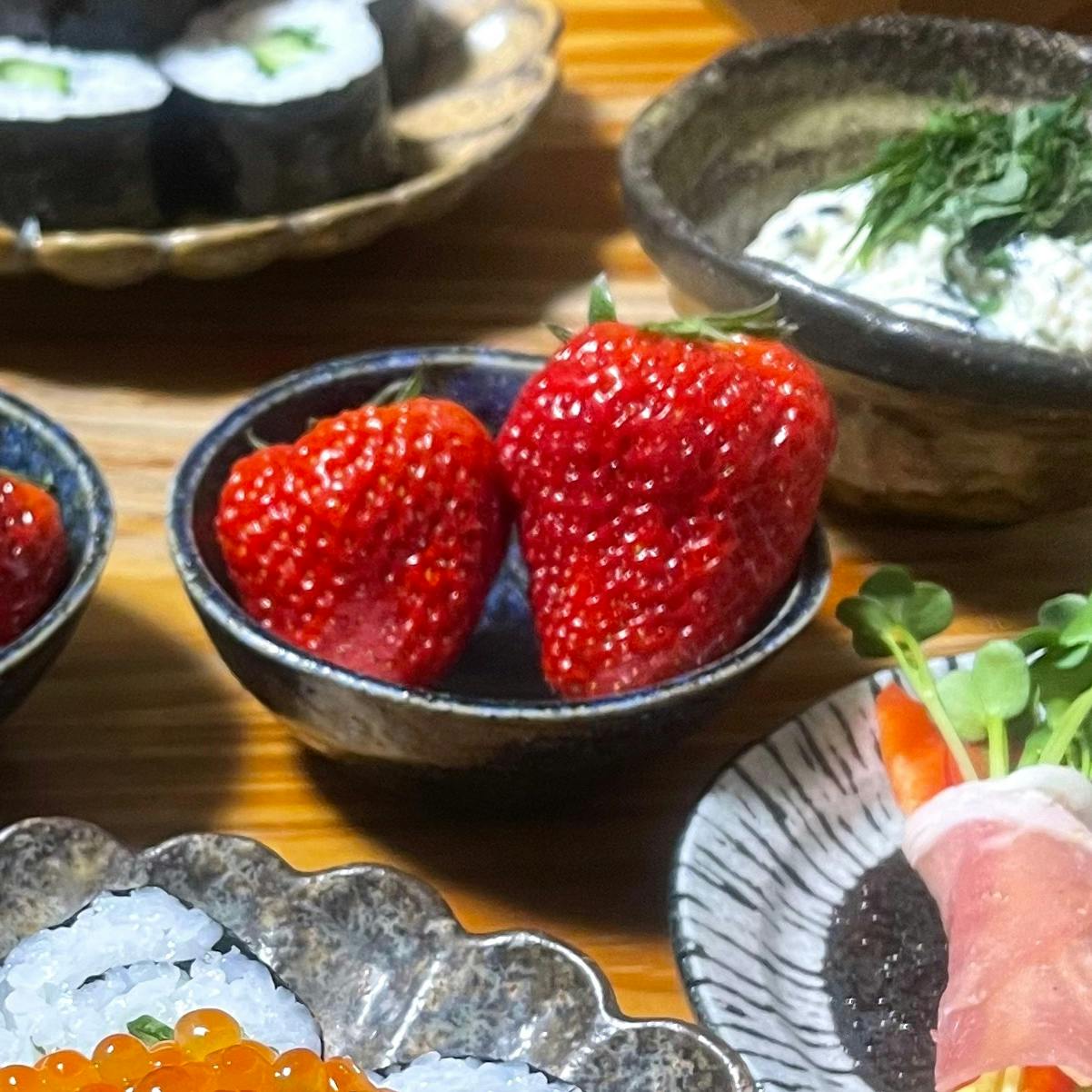 🍽 ある日の晩ごはん 🍽 *かっぱ巻きイクラのせ *タコとブロッコリーのバジルサラダ *アボカドの生ハム巻き *ひじきの白和え *味噌汁 (ホタテの稚貝) *イチゴ🍓 ✼••┈┈┈┈┈┈┈┈┈┈┈┈┈┈┈┈┈┈••✼ 企画ものに応募したらイクラが当たった✌️ そちらのイクラ🔴✨をかっぱ巻き🥒にのせてみました✨ 美味しいに決まってる😋 タコ🐙が安く買えたので、某コンビニ風に作ってみました〜👩🍳 ブロッコリー🥦と枝豆とじゃがいも🥔をバジルソースで和えました。美味しかったぁ〜✨ ごちそうさまでした〜😋