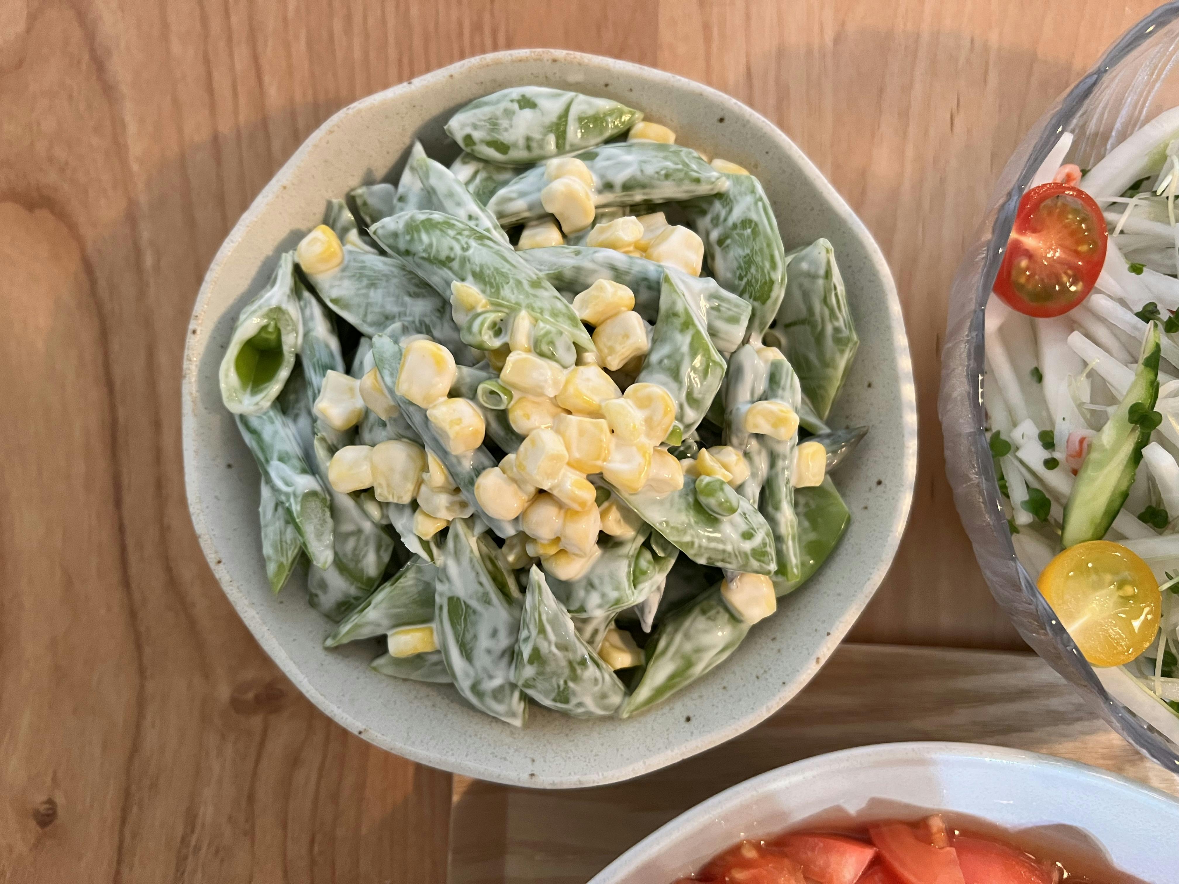 スナップエンドウとアスパラコーンマヨ和え