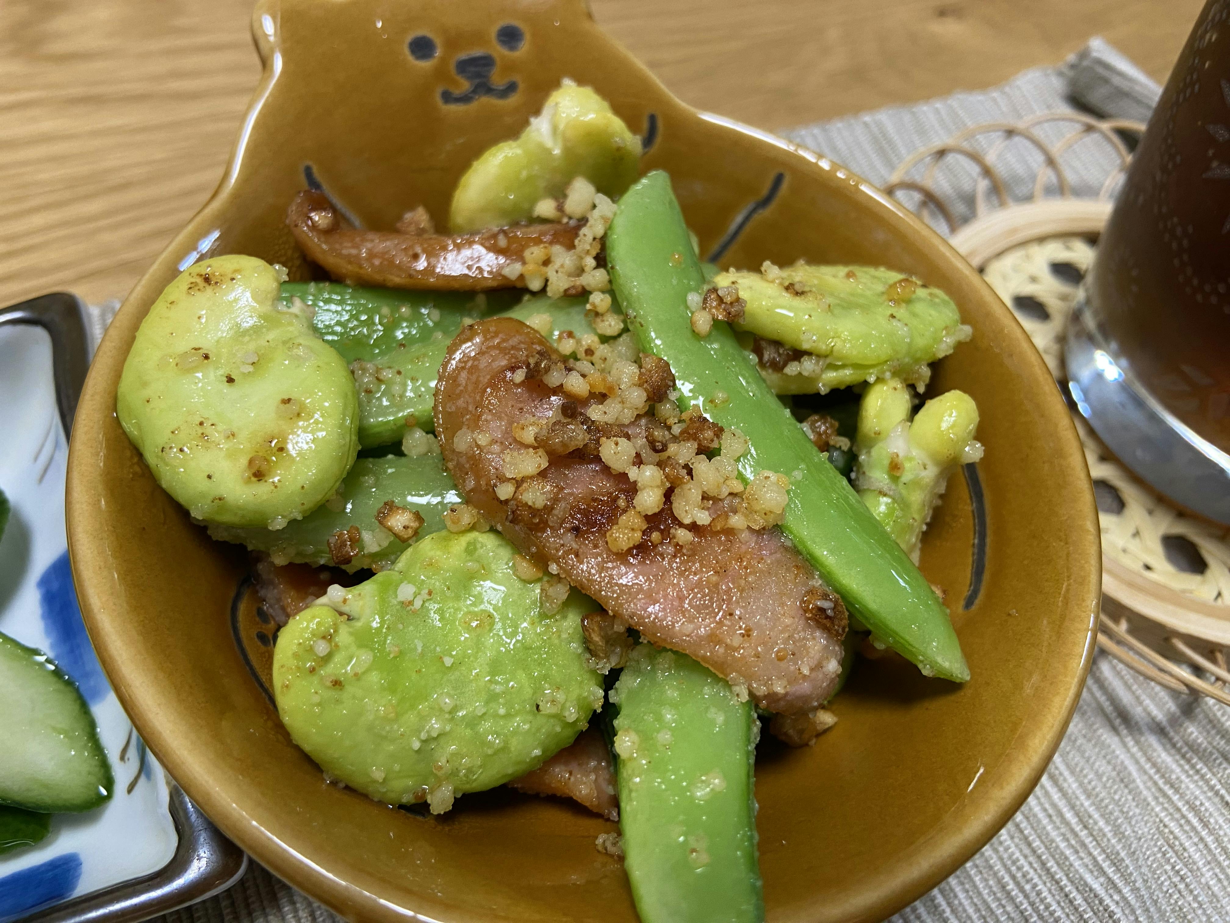 そら豆とスナップえんどうのペペロン炒め