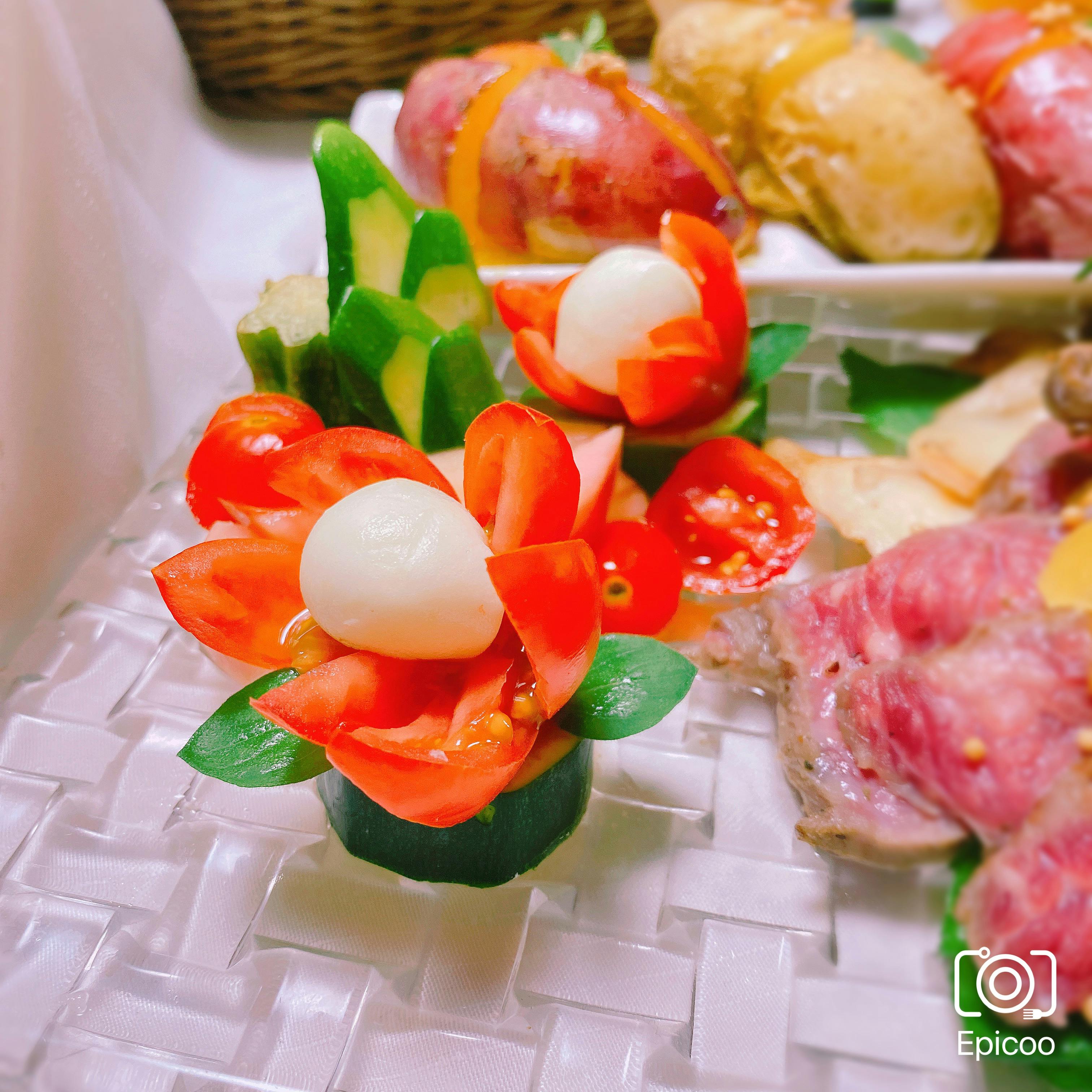 新じゃが食べ比べじゃがバター 自家製ローストビーフ 黄桃ソースで モッツアレラトマトの お花サラダ 自家製ピクルス 蓮根&2種の新じゃがチップス パン