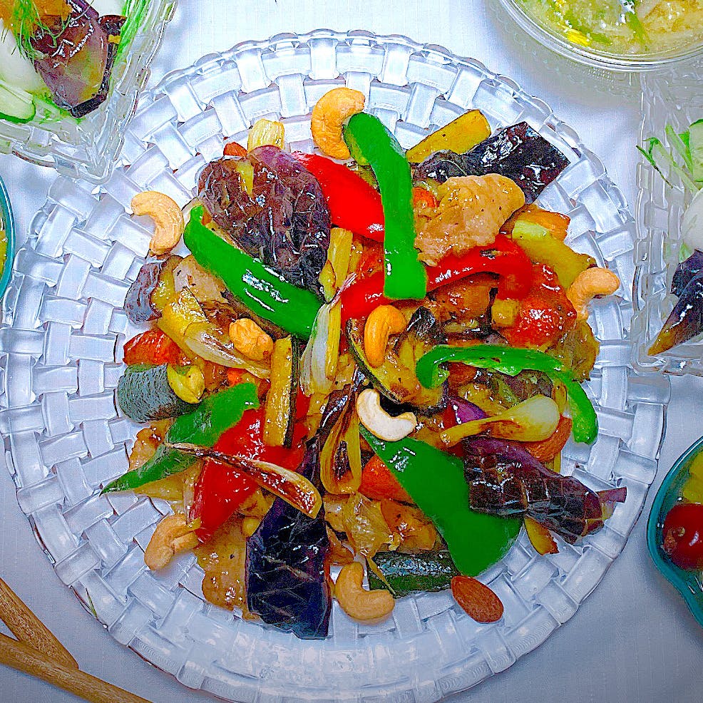 玉ねぎの代わりにエシャロット パインの代わりに黄桃で カシューナッツ 筑陽ナス ピーマン パプリカ たけのこ 卵と水菜のスープ 甘酢漬け 黄桃とアメリカンチェリーデザート