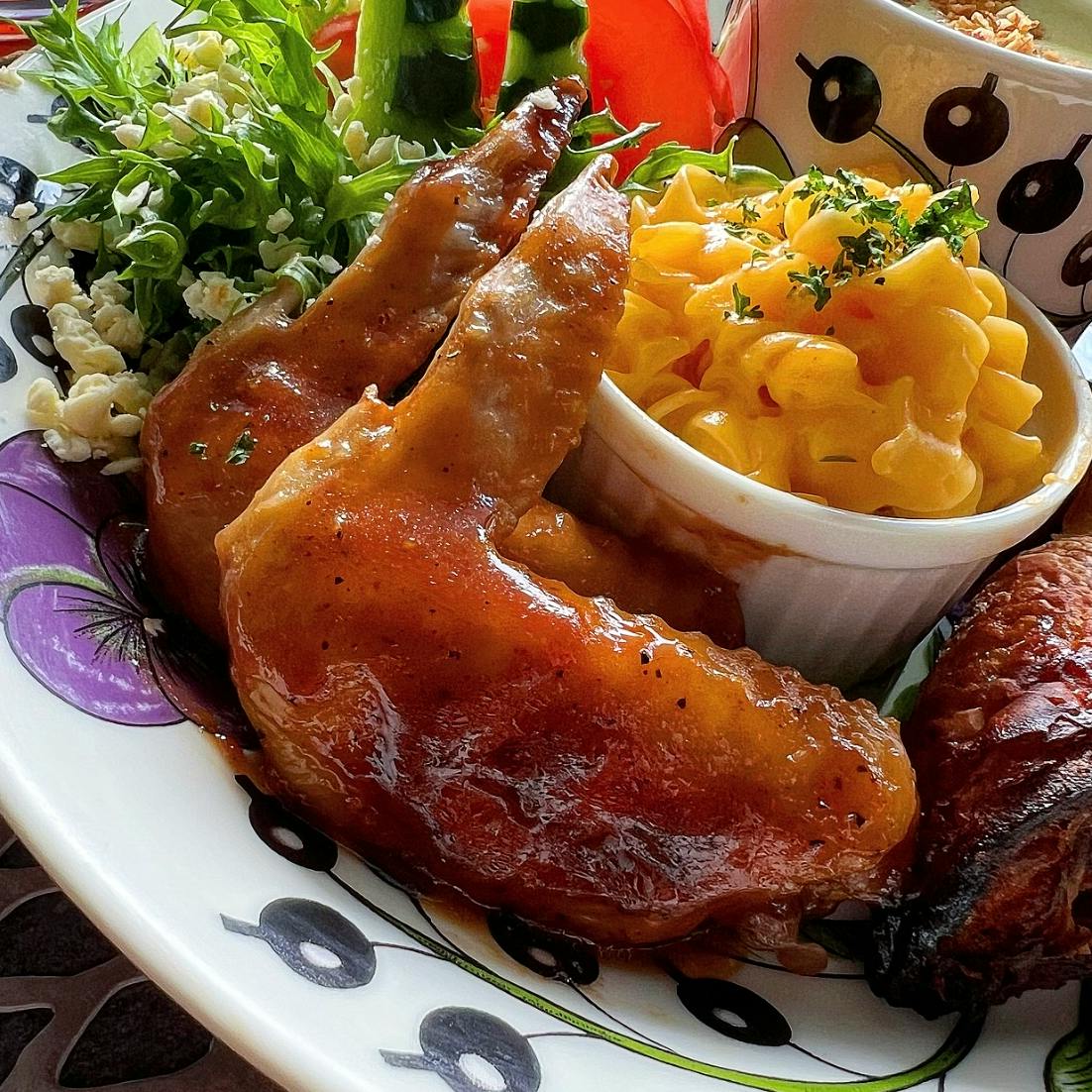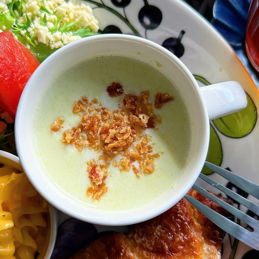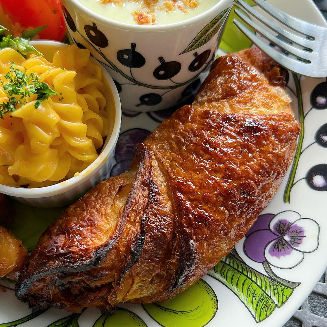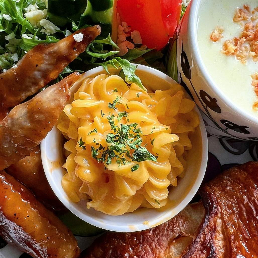 ❁ あんクロワッサン ❁ 鶏手羽バーベキュー味 ❁ マッケンチーズ ❁ 彩りサラダ ❁ えだ豆のポタージュ 手羽先とマッケンチーズとポタージュは味の素さんの新商品の調味料を使っています。 忙しい朝。 たまには市販のものを上手く使って時短でお手軽に仕上げるのもいいですね♡