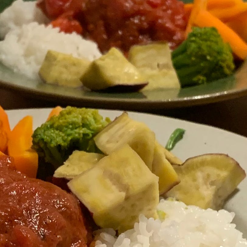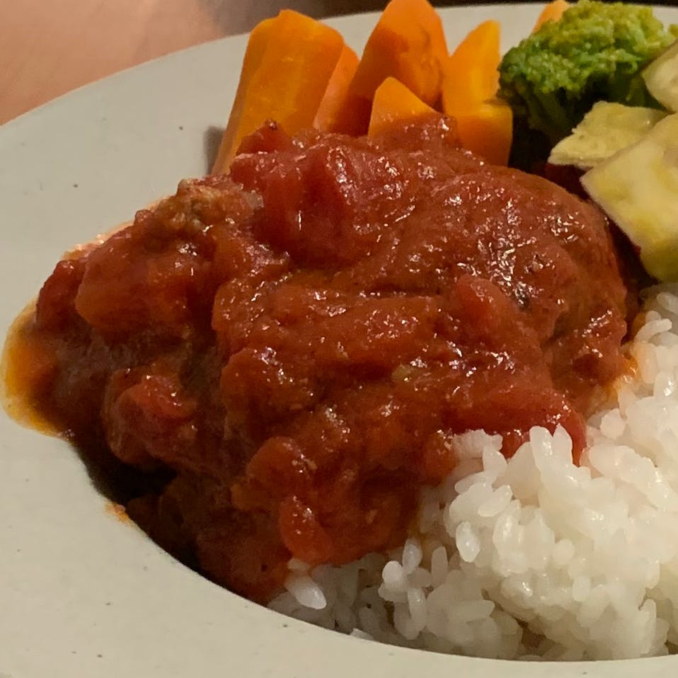 ハンバーグおじさんの肉塊がまだあったので、今度はトマトと煮込んでワンプレートにしました