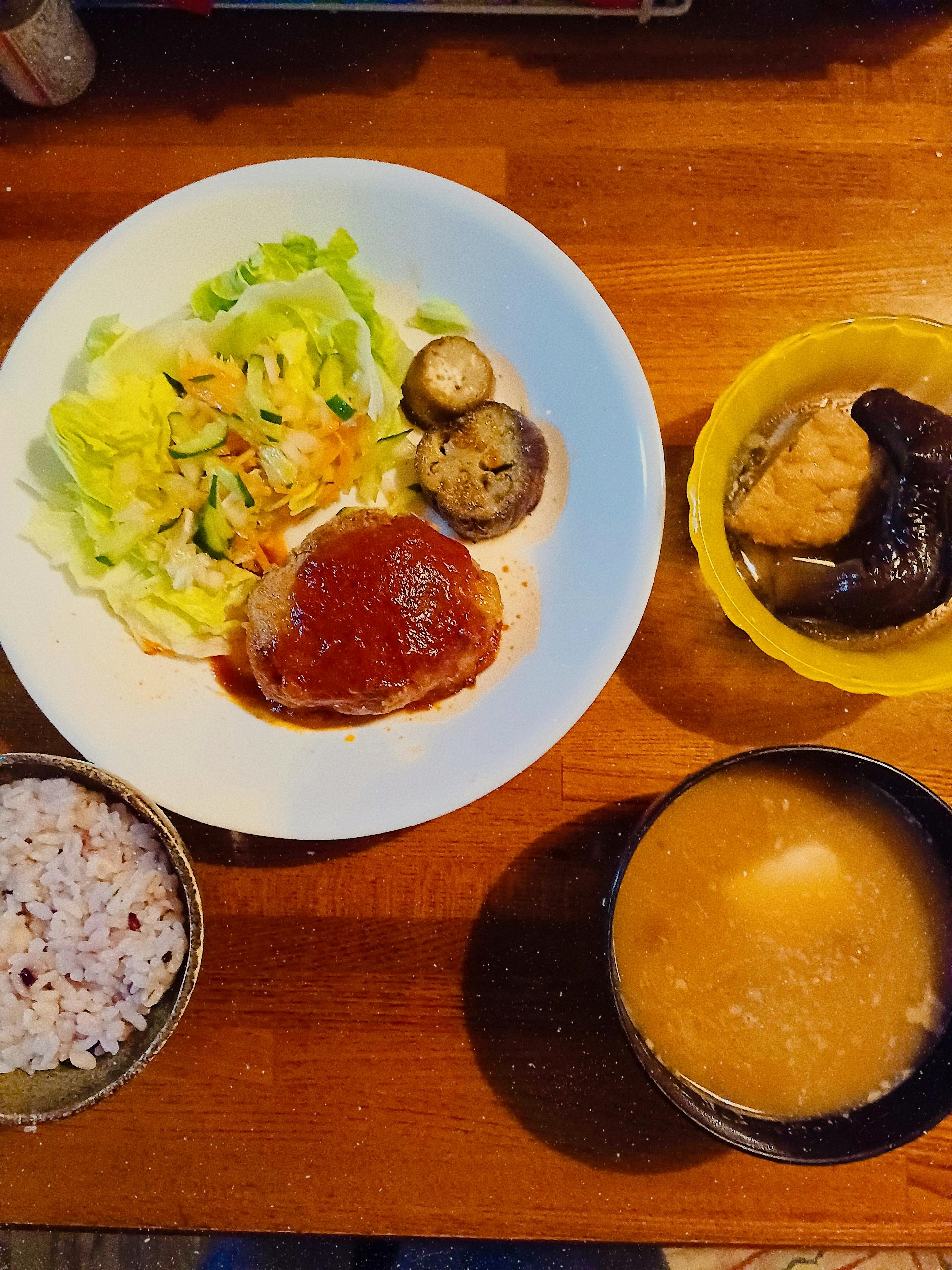 ハンバーグ なすのチーズ炒め サラダ 茄子とがんもどきの 煮物 味噌汁 雑穀米