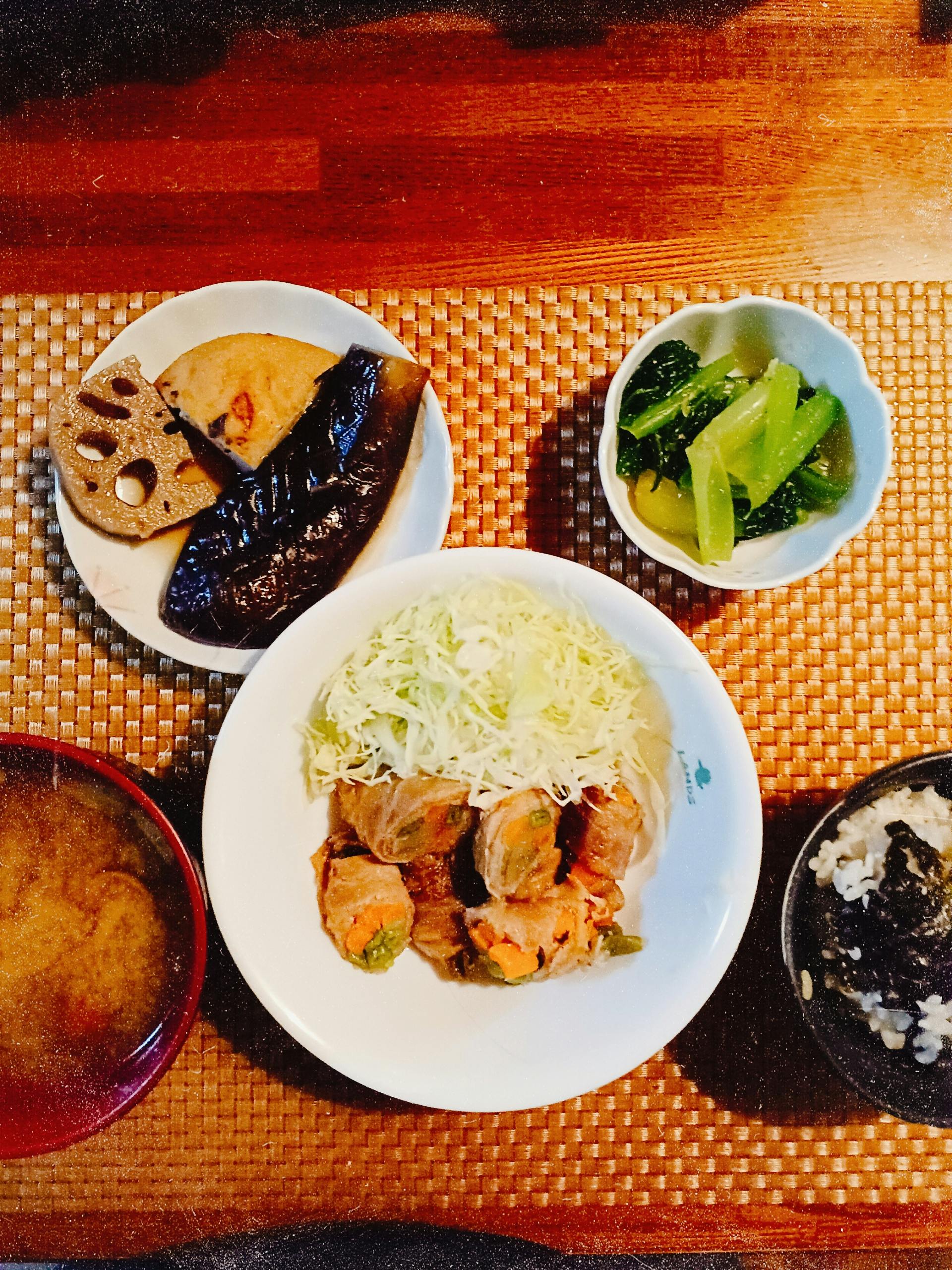肉巻き、サラダ 茄子とレンコン、がんもどきの煮物 小松菜のごま和え 海苔御飯 味噌汁 お弁当のおかずにぴったり