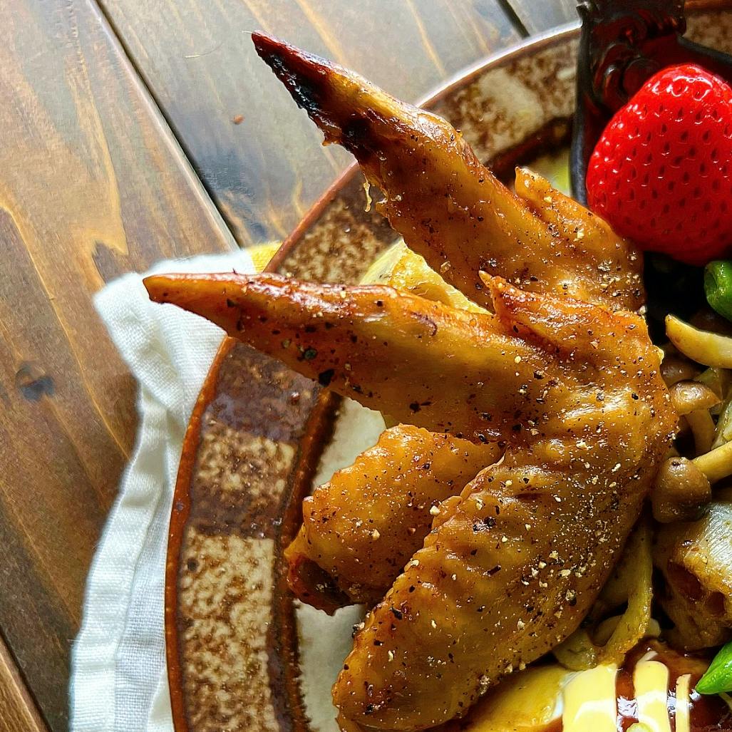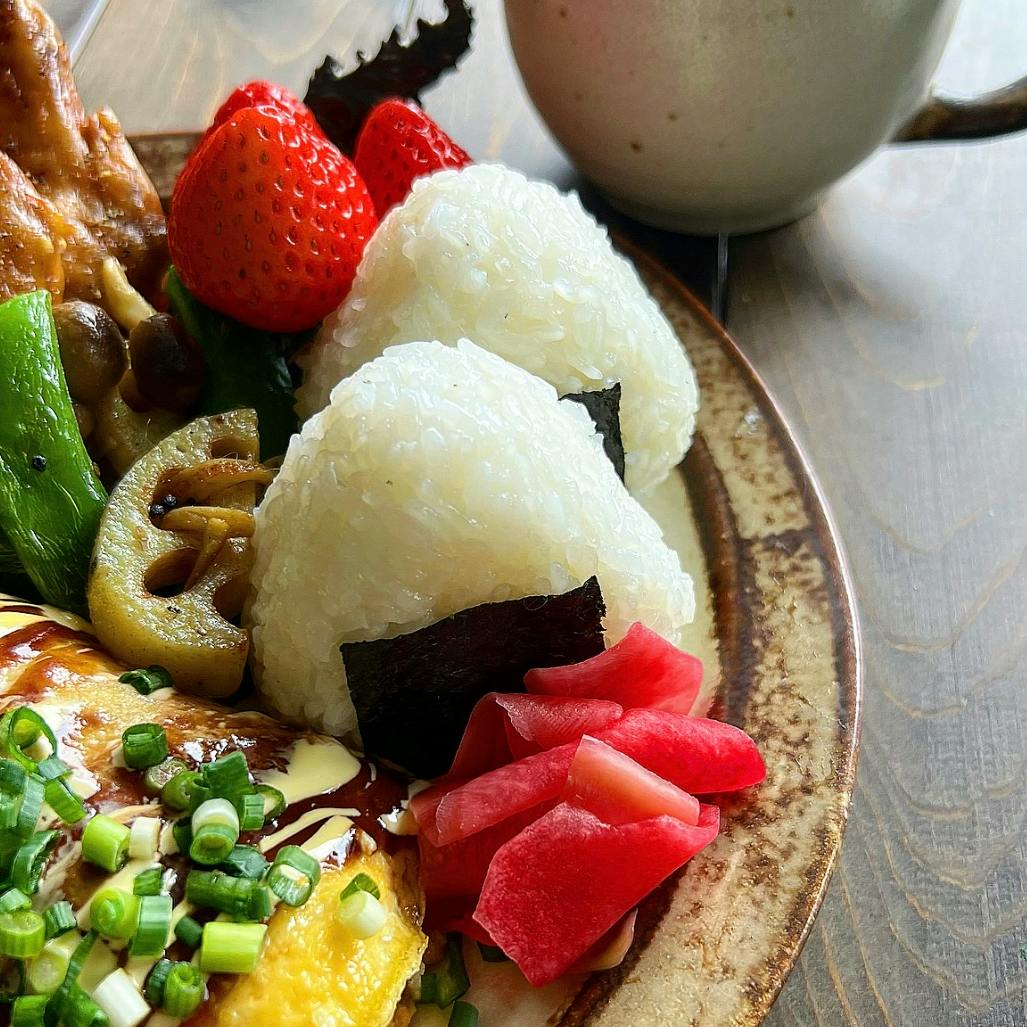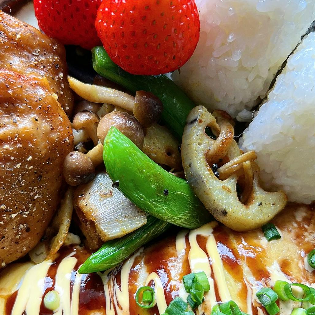 ❁ とん平焼き ❁ 手羽先の黒こしょう焼き ❁ 蓮根とスナップエンドときのこのバターソテー ❁ 塩おにぎり ❁ 赤かぶの甘酢漬け ❁ いちご 大きく見えますが卵1つで作ったとん平焼き🥚 卵も高騰してるしコレストロール値も気になるのでちょうど良いです🤗 中身は豚バラ薄切り肉、もやし、キャベツ、チーズ。 おにぎりと合わせたら満足度大です🍙