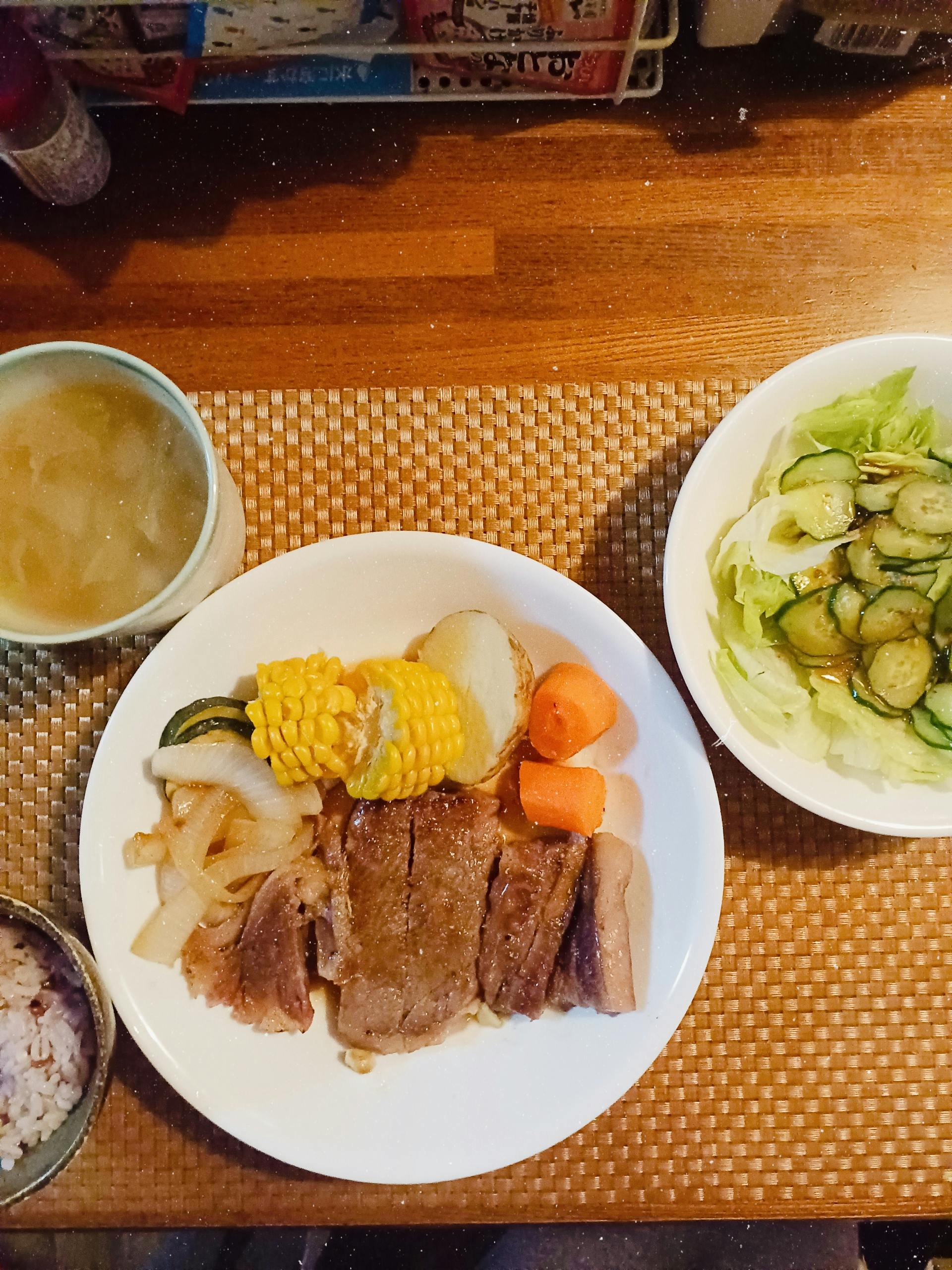 ステーキ ズッキーニ、トウモロコシ、人参、玉ねぎの蒸し焼き サラダ いろいろ野菜コンソメスープ 雑穀米