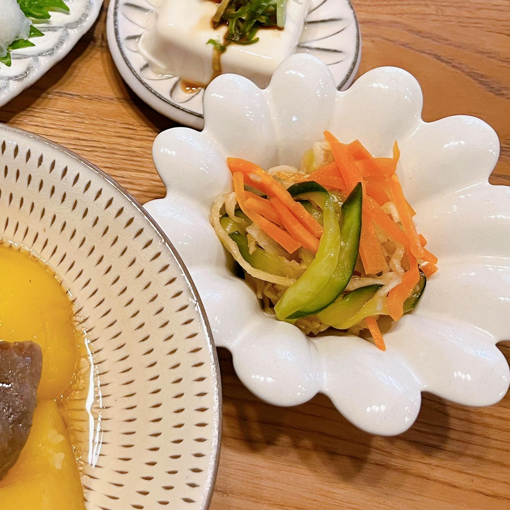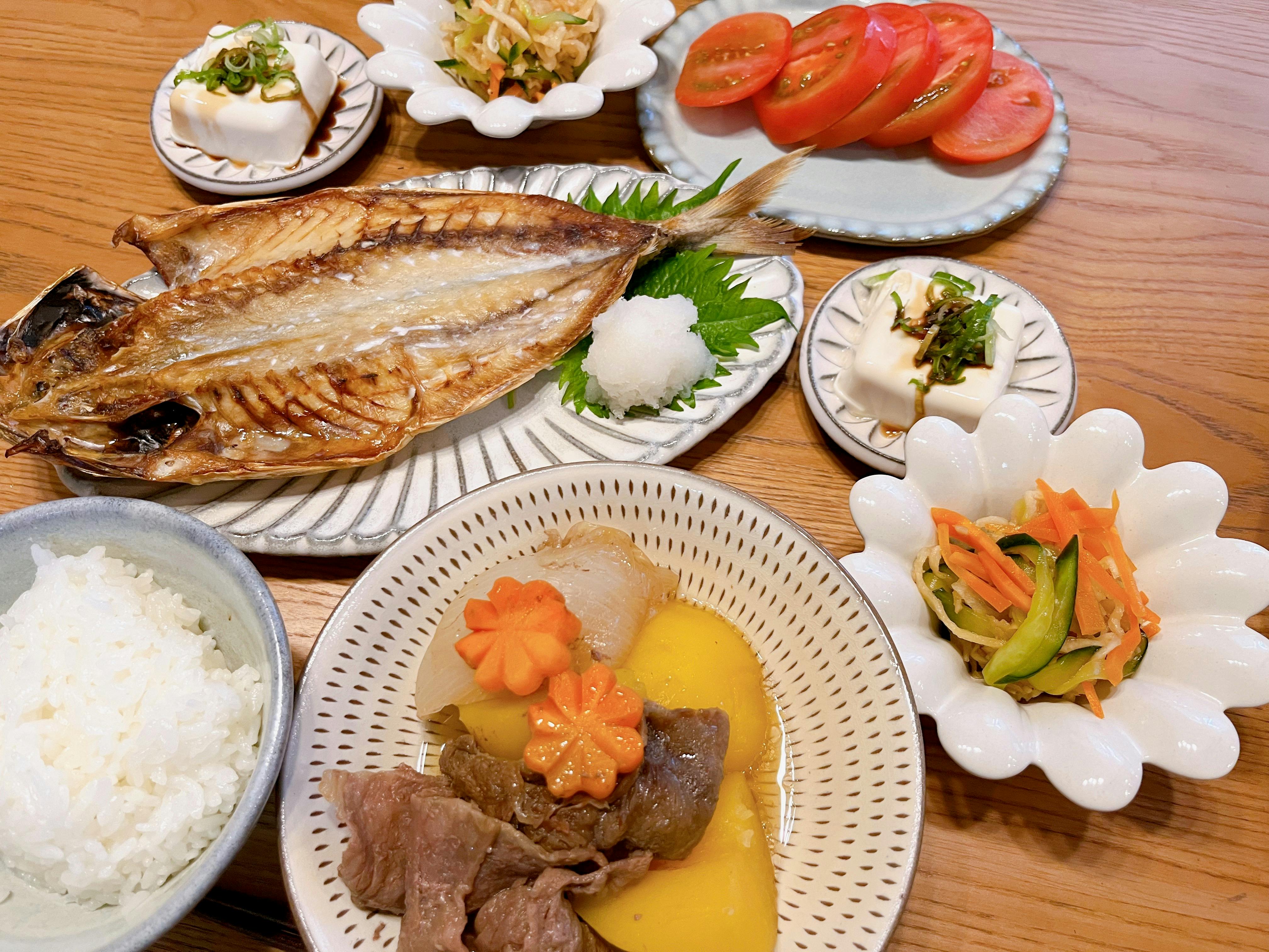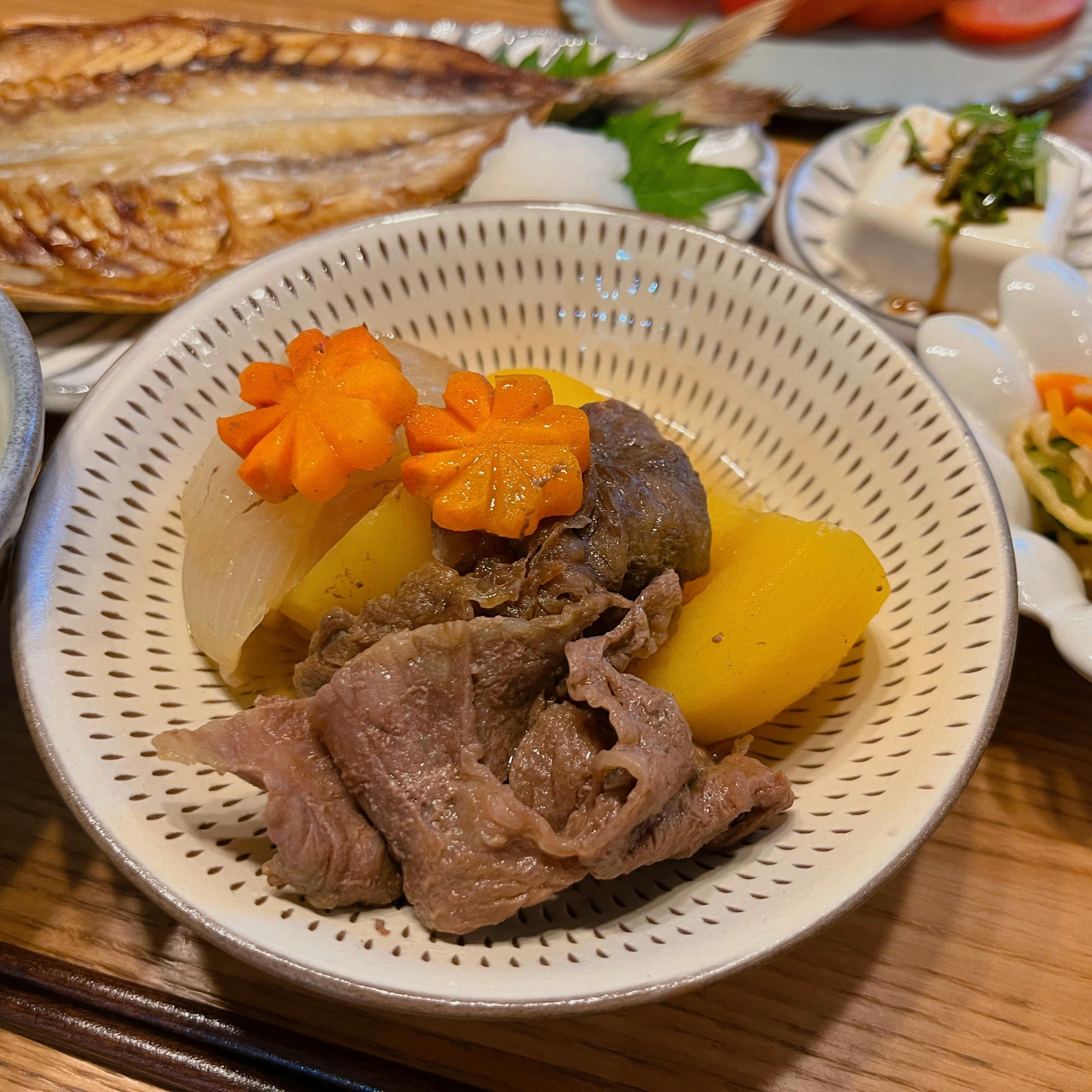 畑で採れたじゃがいもと玉ねぎを使いました🥔🧅 暑くてお味噌汁が作れなかったけど、お腹いっぱいになりました😋 ・肉じゃが ・鯵の干物 ・切り干し大根の中華サラダ ・冷奴 ・冷やしトマト