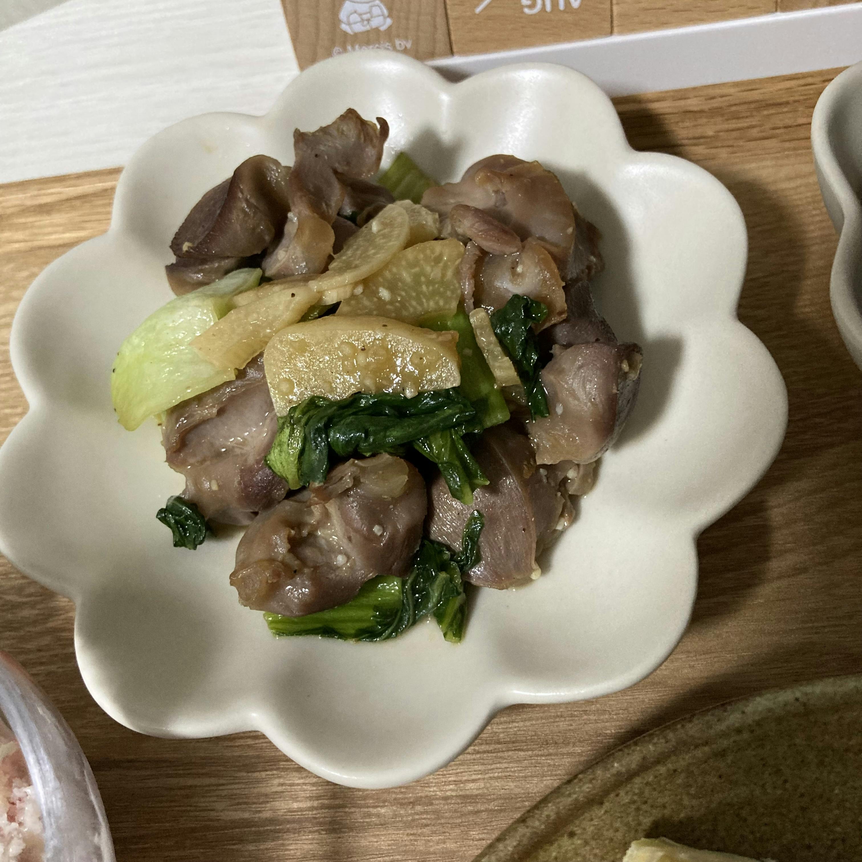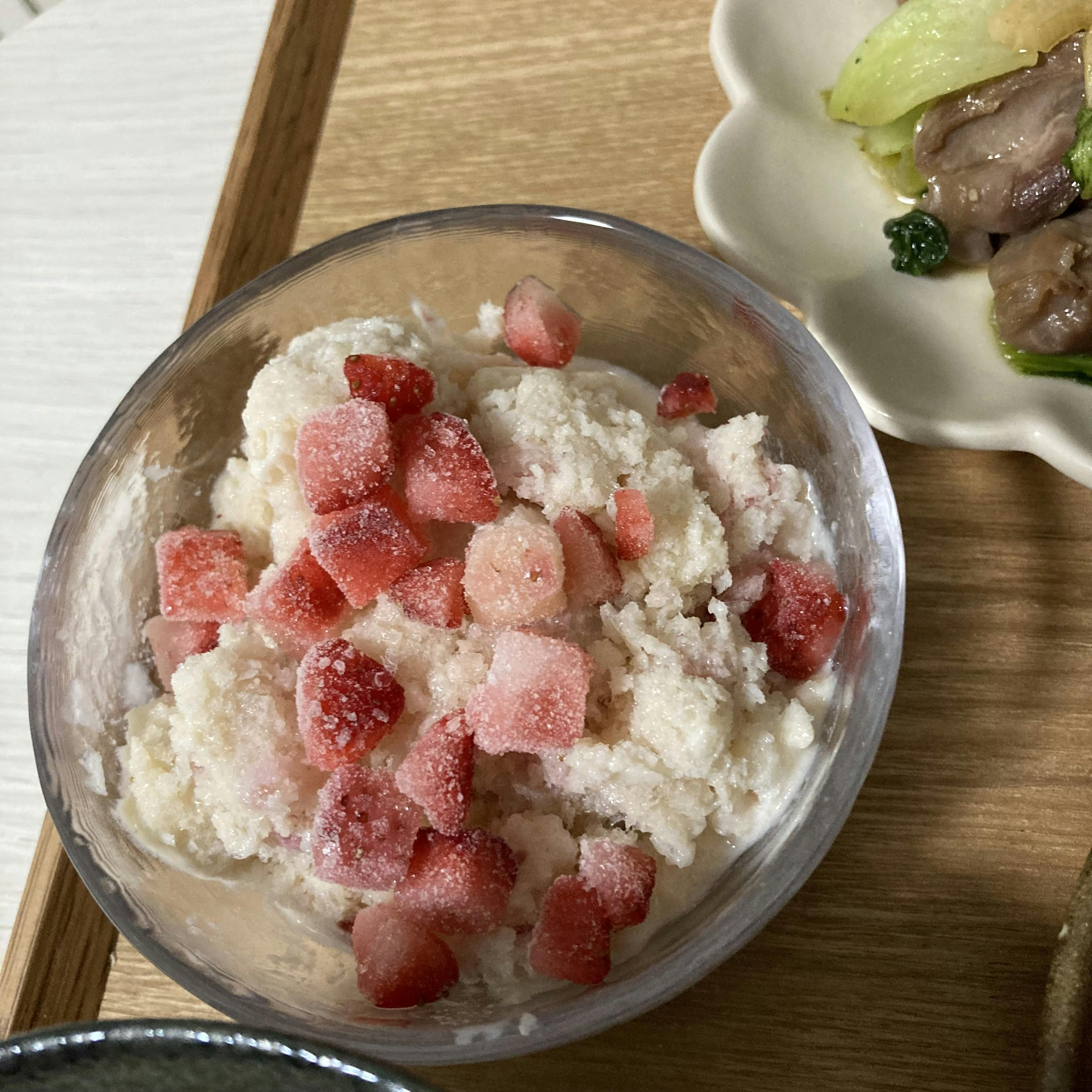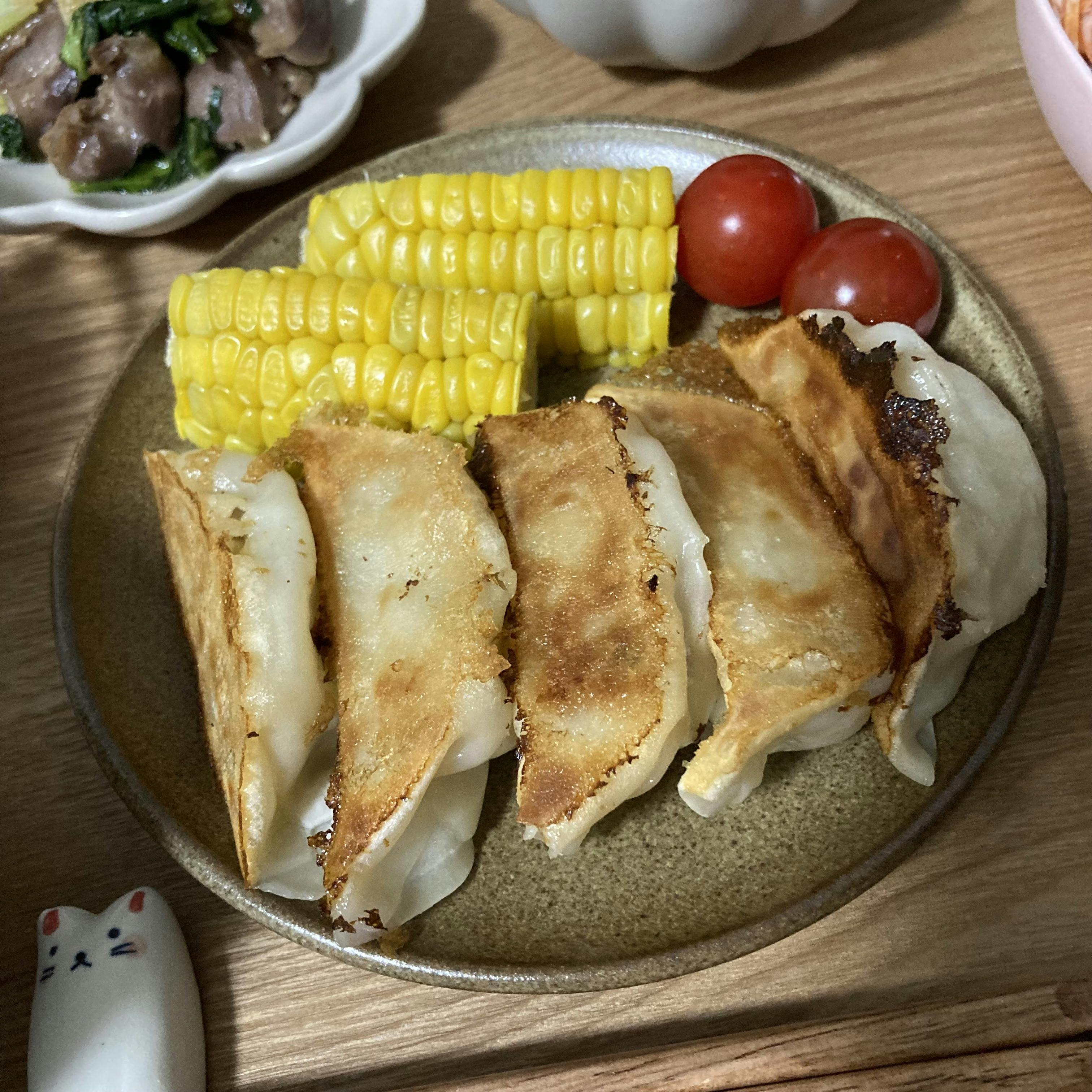 ⚪︎ふりかけご飯 ⚪︎餃子 とうもろこし ⚪︎わかめ卵スープ ⚪︎砂肝と青梗菜のニンニク炒め ⚪︎厚揚げとこんにゃくの味噌煮 ⚪︎人参のめんつゆマヨ ⚪︎豆腐のいちごアイス