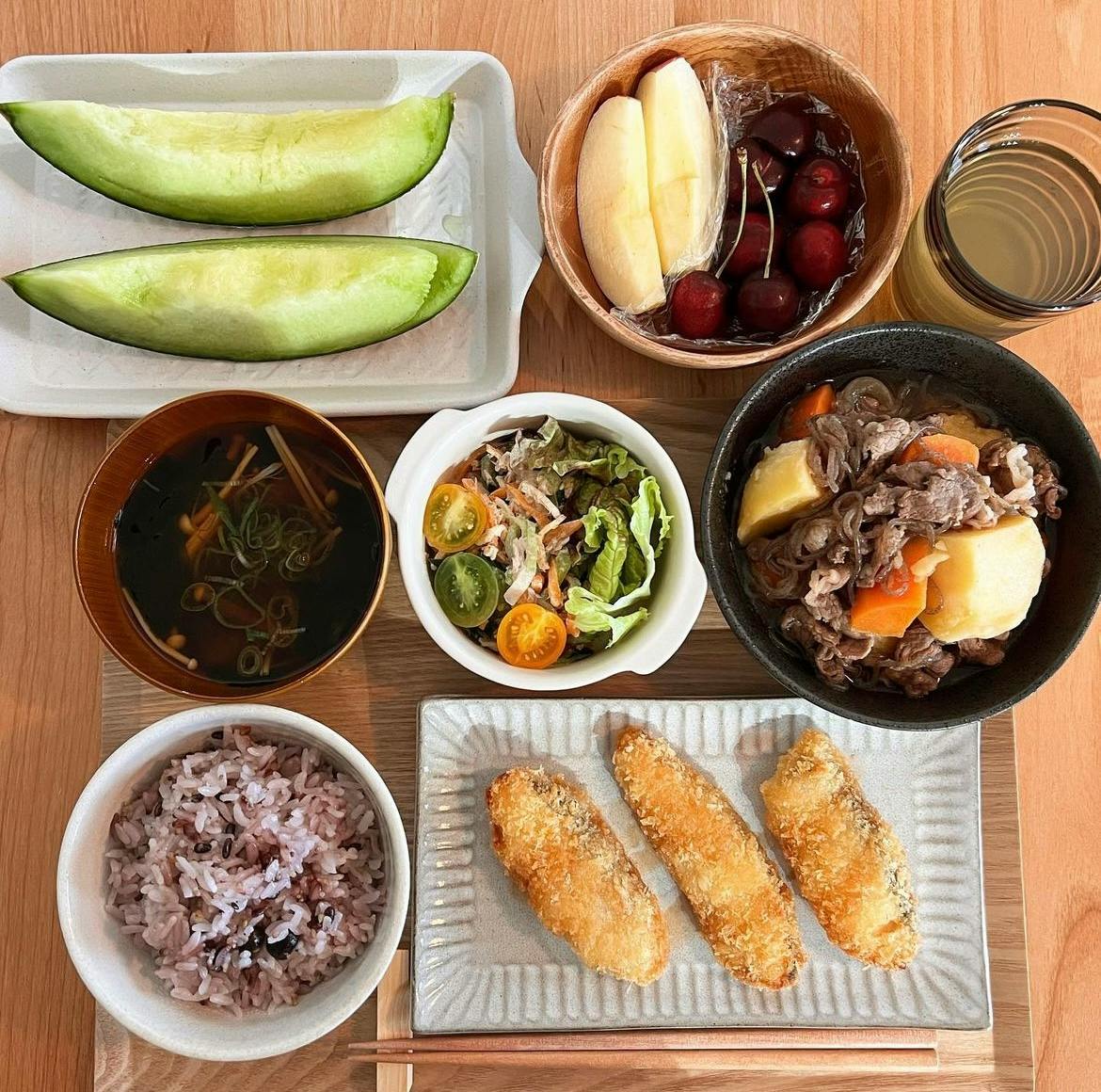 🍈🍎🍒 𖧵秋鮭フライ 𖧵えのきわかめ味噌汁 𖧵切干大根のごまマヨサラダ 𖧵肉じゃが 𖧵メロン 𖧵りんご 𖧵アメリカンチェリー _________ 頂き物のメロンと自分で買ったフルーツ、 幸せの渋滞ですね🥹 :