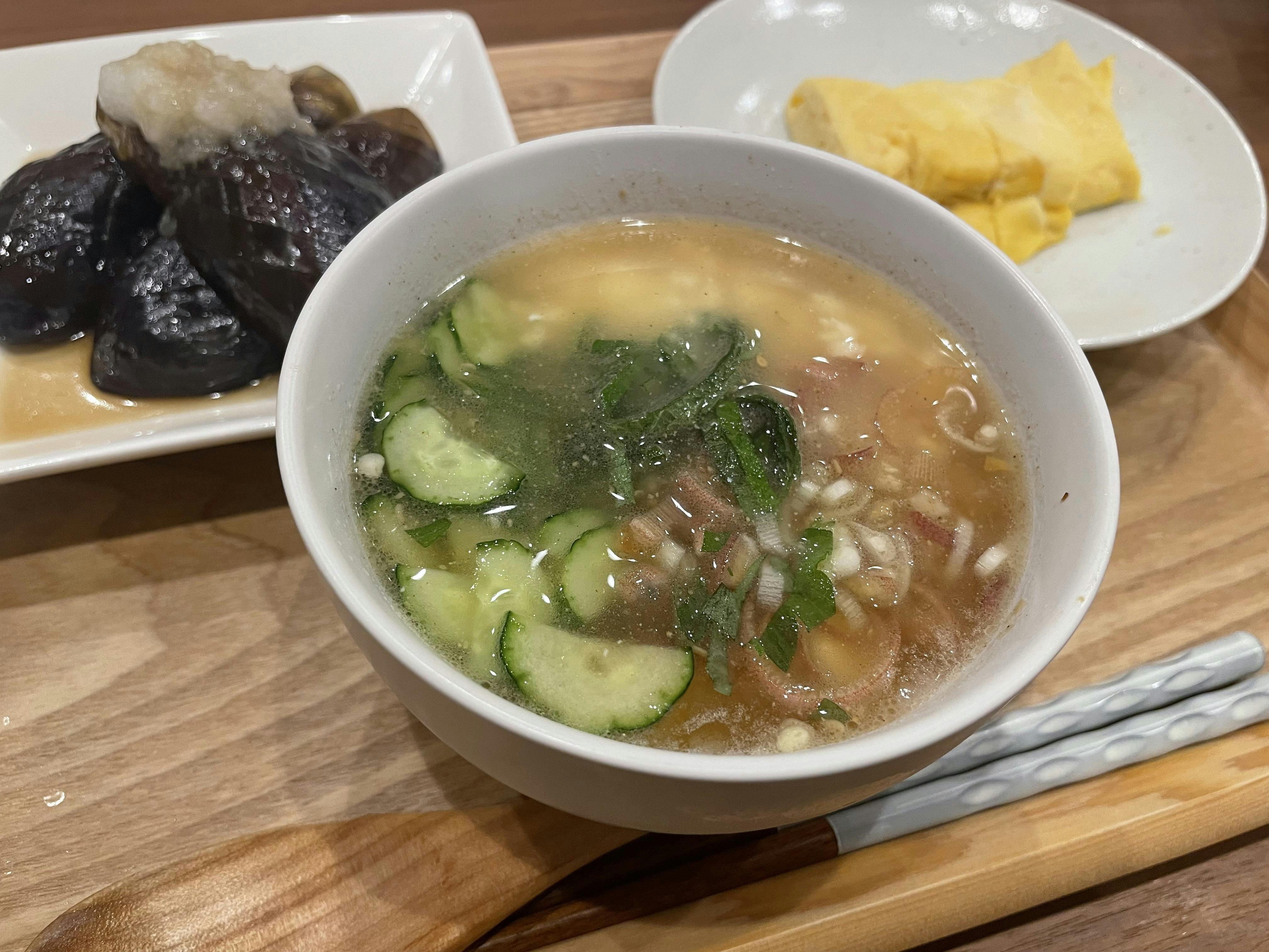 茅乃舎の冷や汁の出汁と、だし巻き玉子のだしを使って、茅乃舎セットにしてみました🥢 暑くて食欲なかったけど、冷や汁だとサラッと食べれますね😋 そして、さすがの茅乃舎…! 冷や汁もだし巻き玉子もすっごく美味しかったです✨