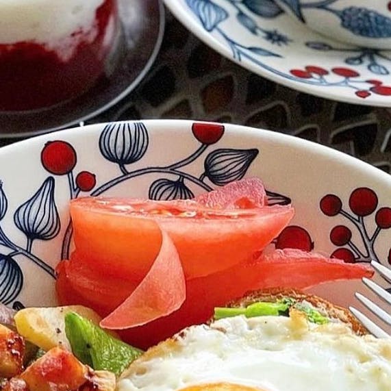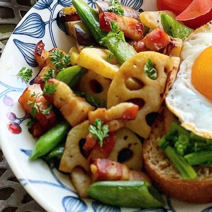 ❁ ハムと菜の花と卵のオープンサンド ❁ 野菜とベーコンのホットサラダ (蓮根、茄子、スナップエンドウ) ❁ トマト ❁ ミックスベリーのヨーグルト ❁ 紅茶 目玉焼きがドーンとのったオープンサンド。 お野菜いっぱいのホットサラダも添えて。 生野菜よりも体にやさしいですよね🤗🌿
