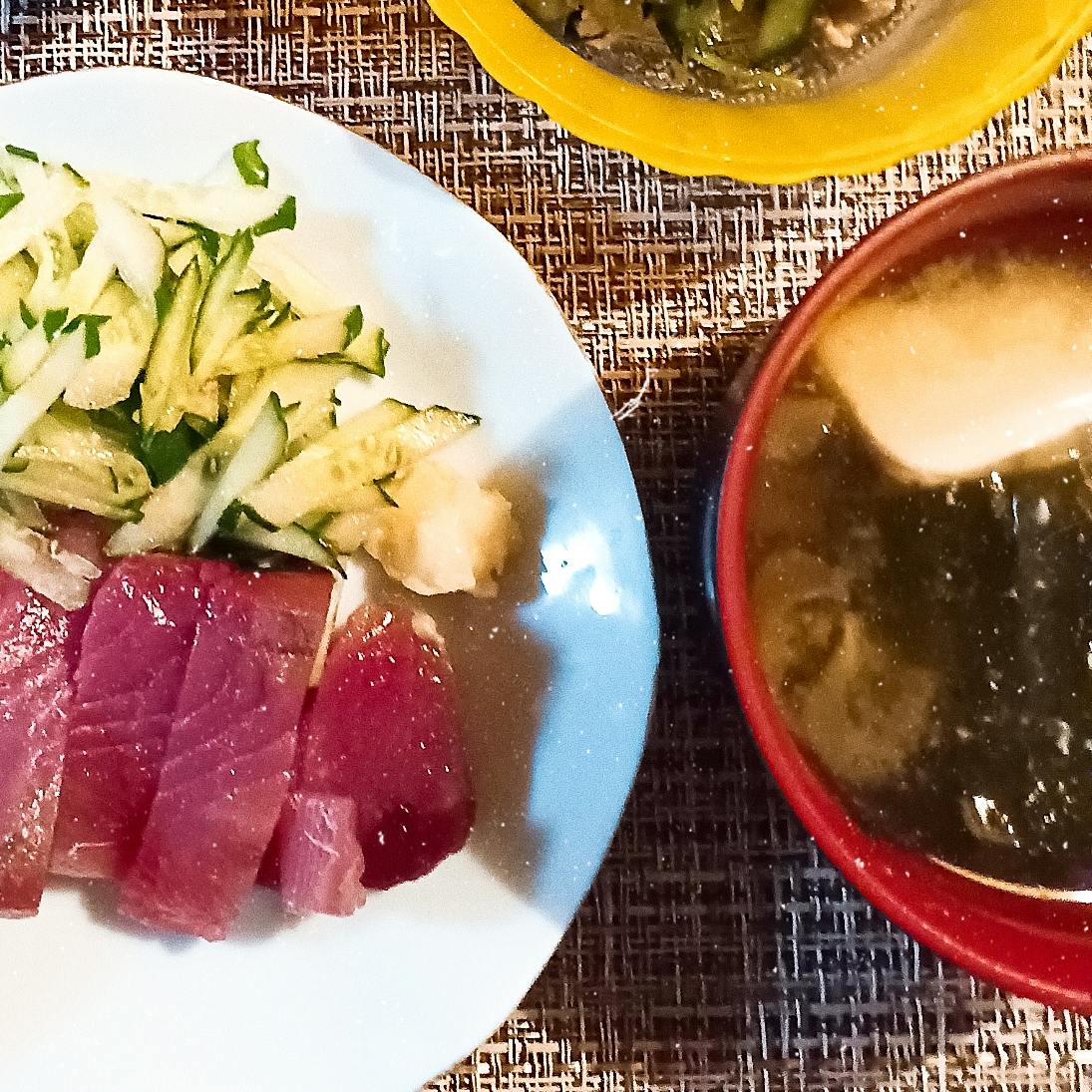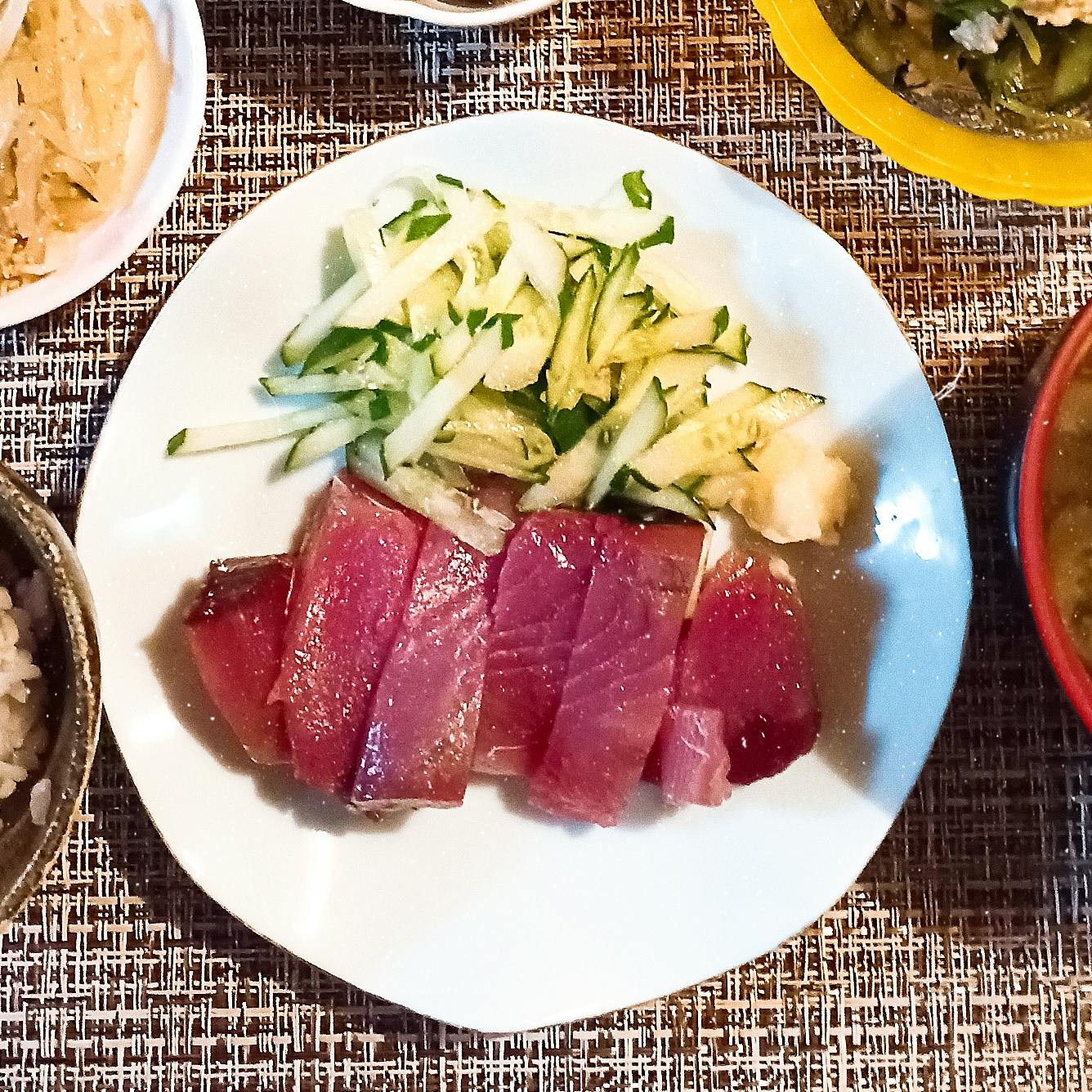 かつおの刺身 なすの煮浸し モヤシナムル 豚肉と三つ葉、キュウリの柚子胡椒和え 雑穀米 味噌汁