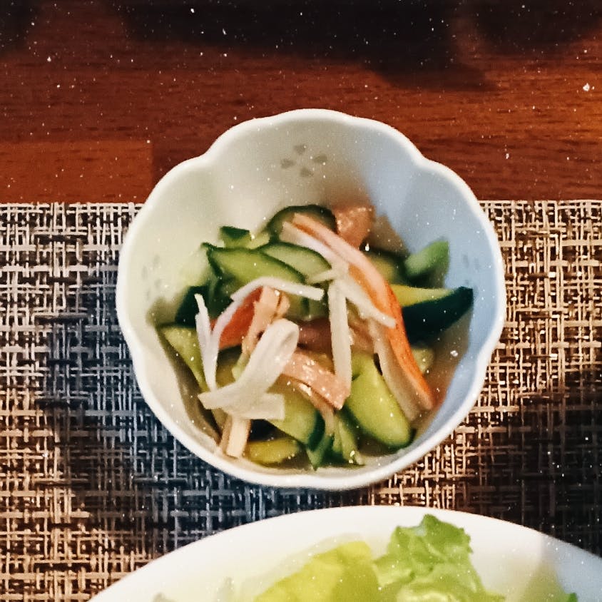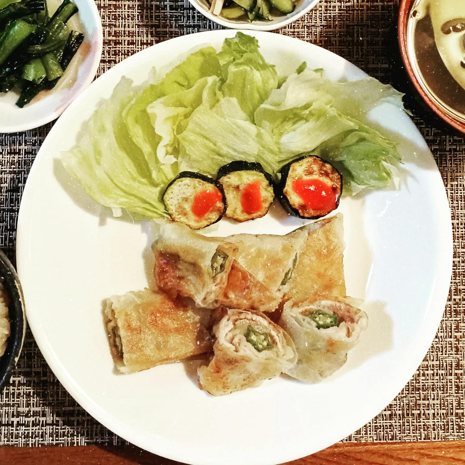 おくらと豚肉チーズ春巻き(shizu.kitchinさんレシピ) ズッキーニ炒め 小松菜お浸し キュウリ、カニかま、茗荷酢の物 味噌汁 あじご飯