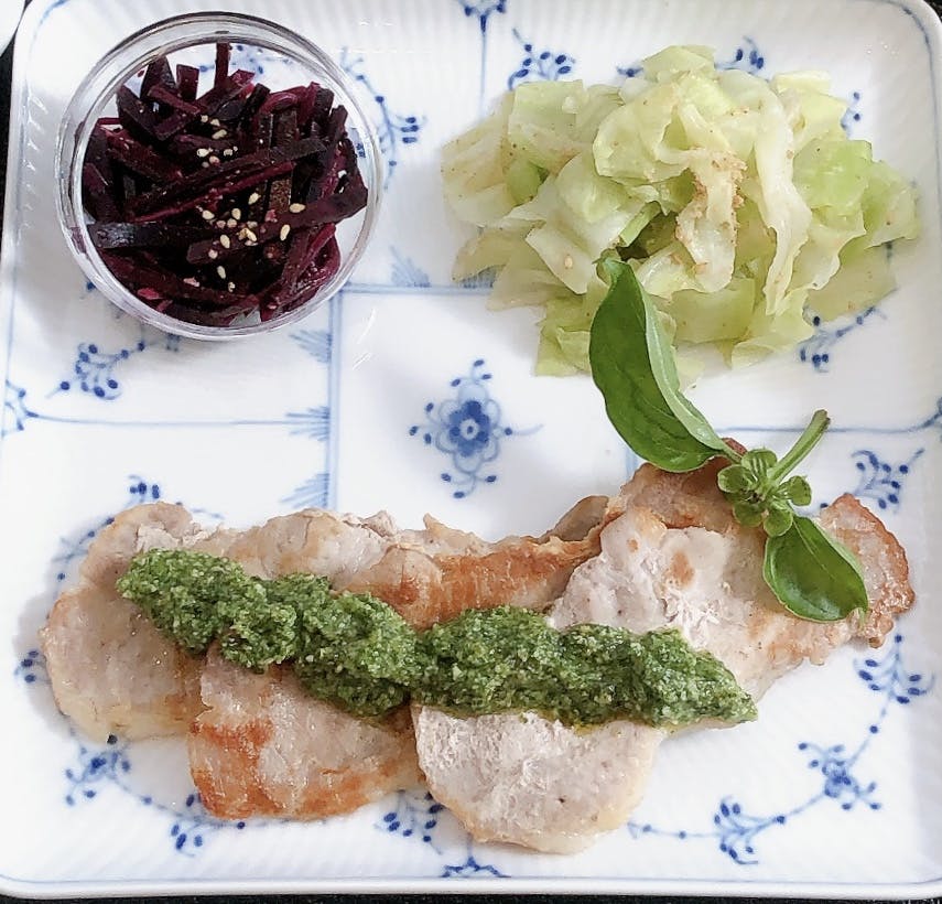 豚薄切り肉ソテー、バジルソースかけ、