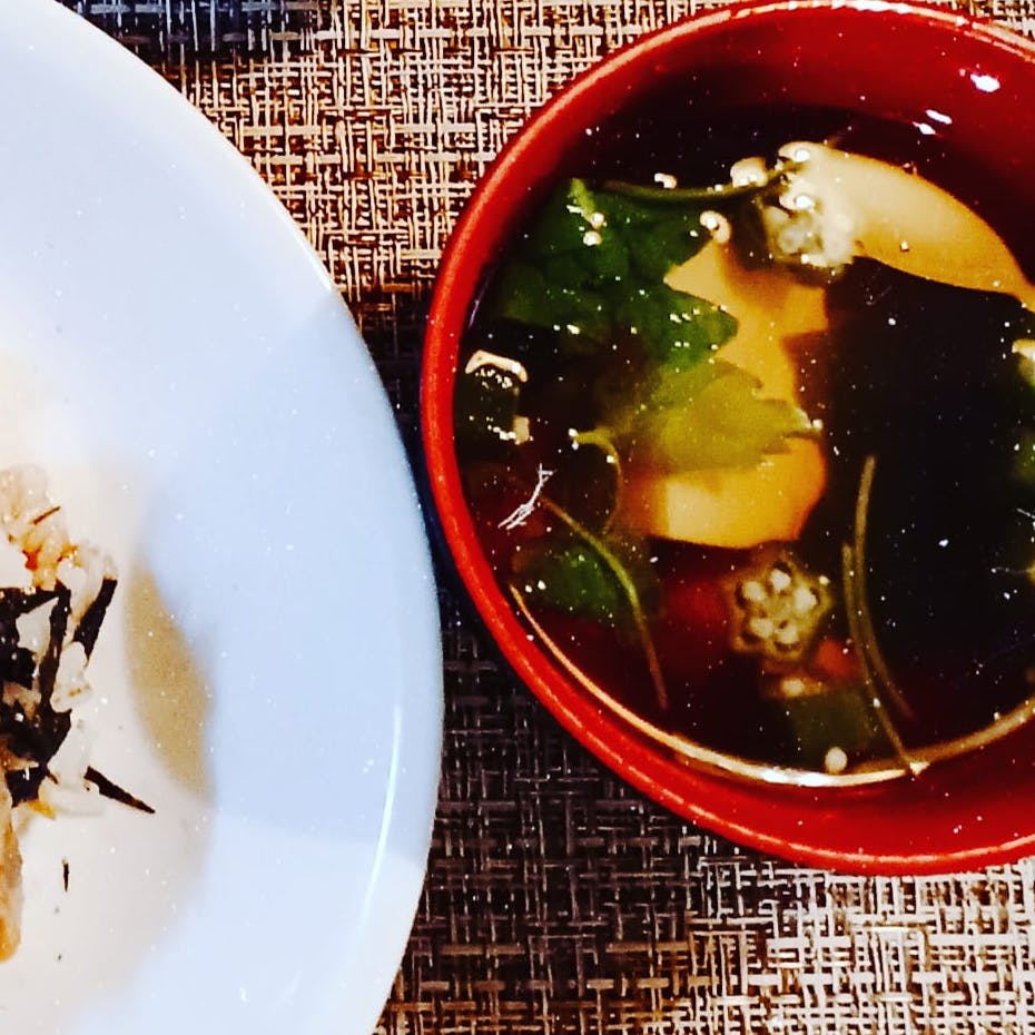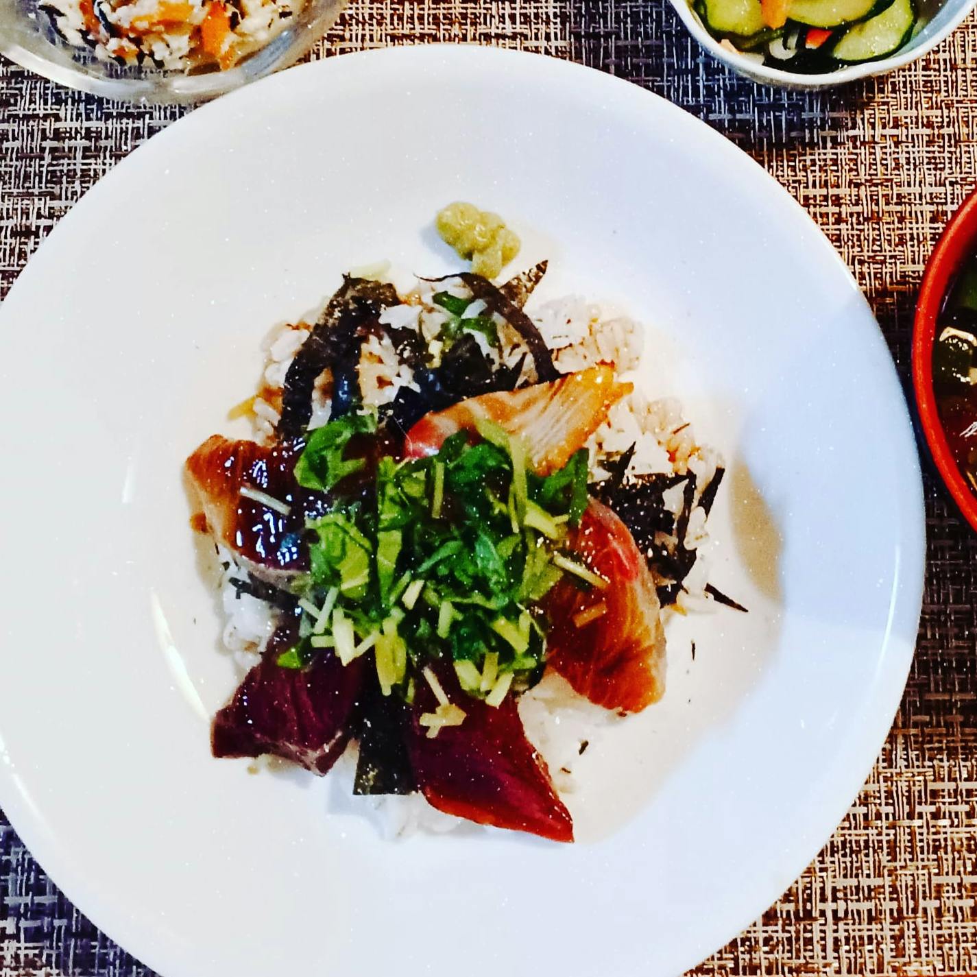 漬け丼 卵豆腐、三つ葉のお吸い物 キュウリ、カニかま、ワカメの酢の物 ひじきの白和え 残った刺身を漬けにして酢飯の上にのせます。ひじきも昨日の残りの白和えです