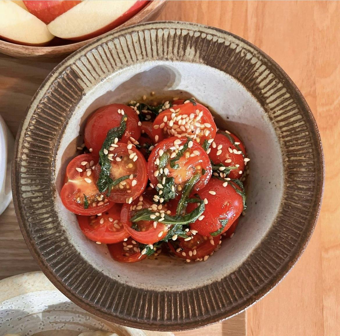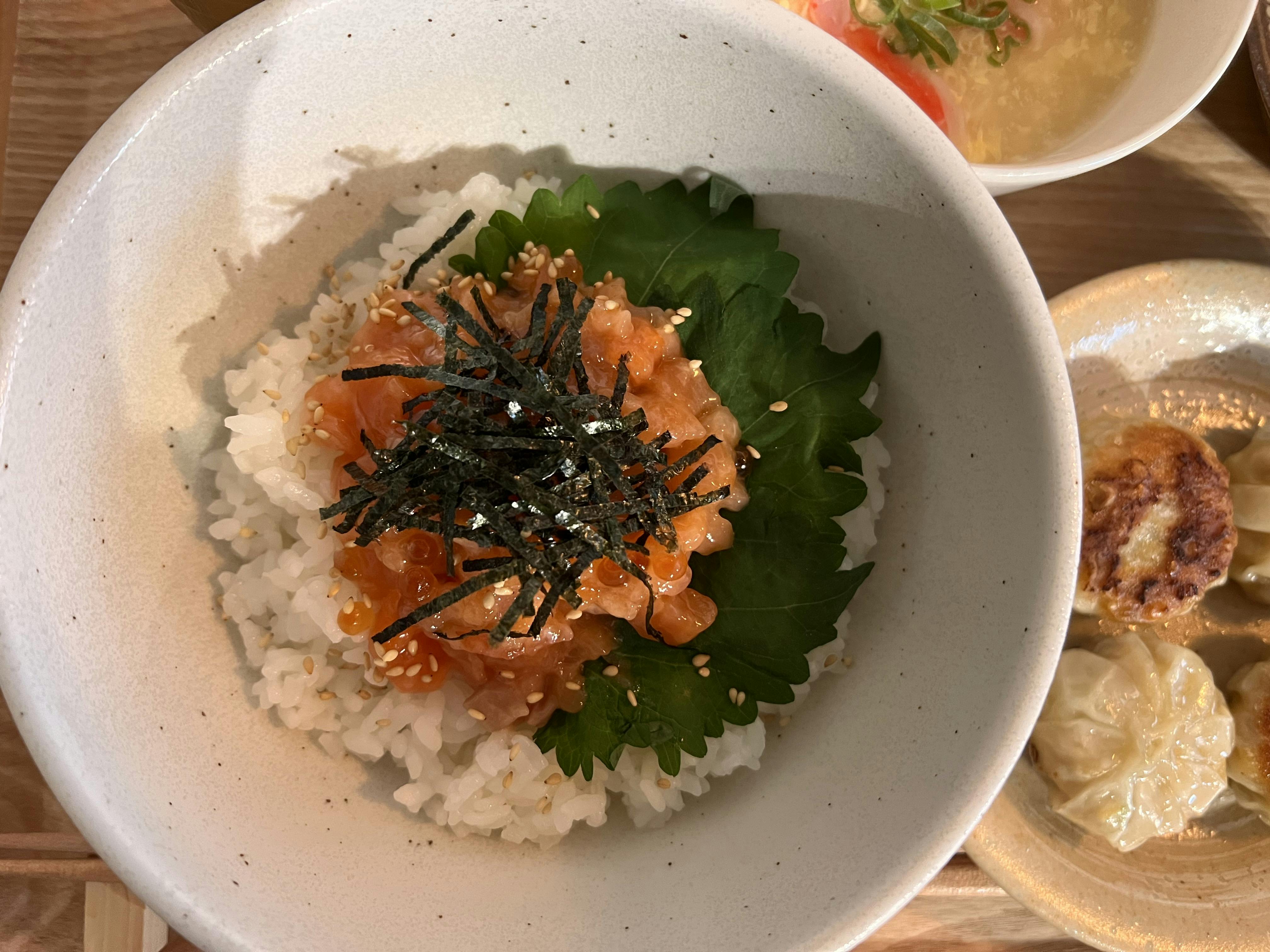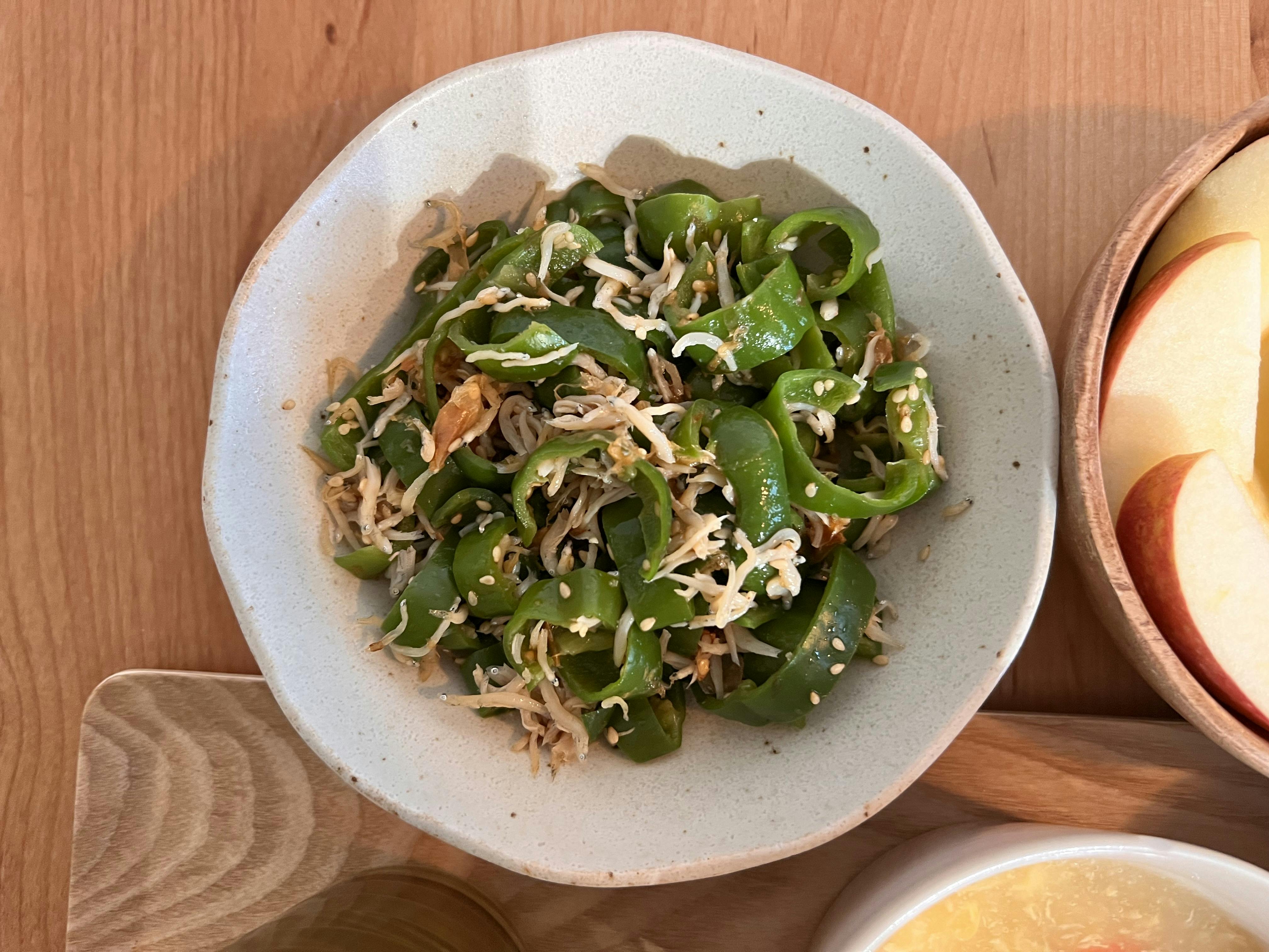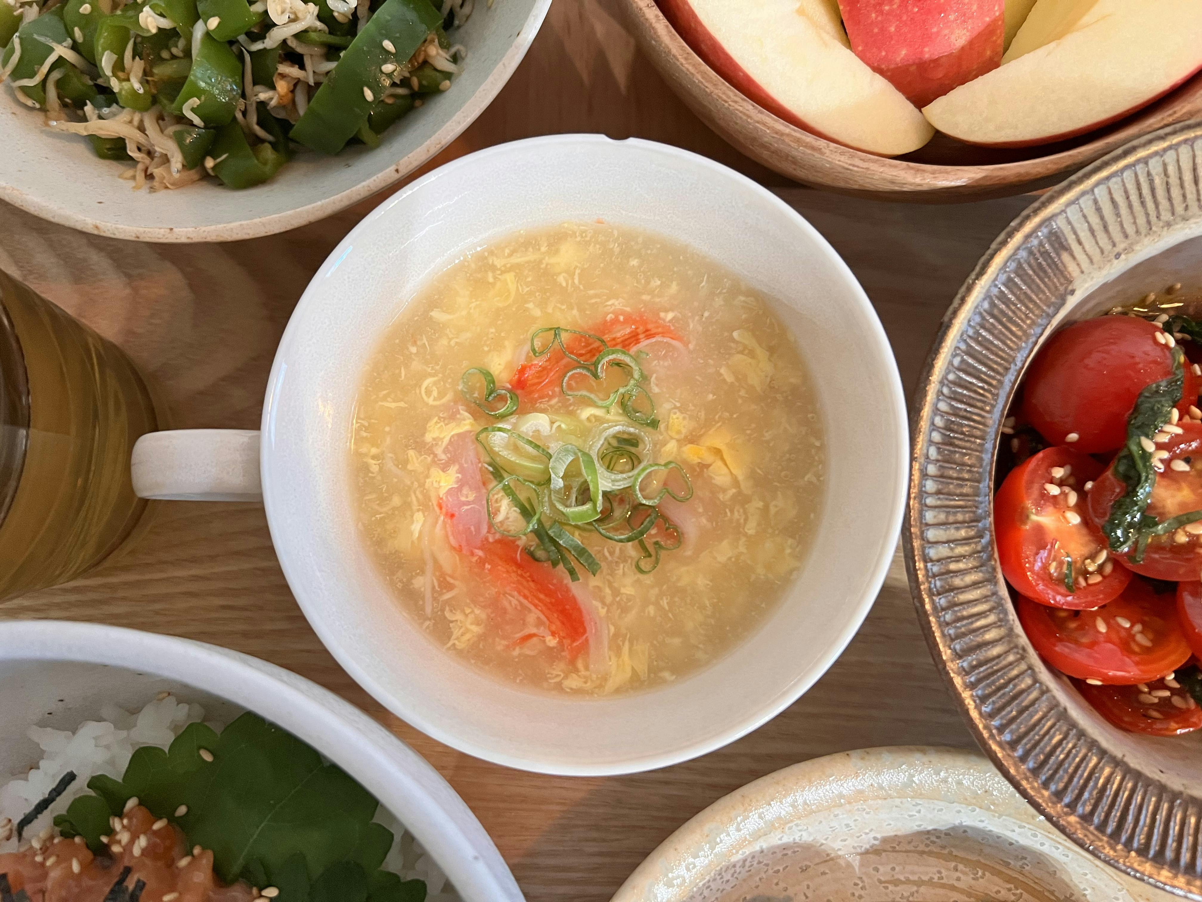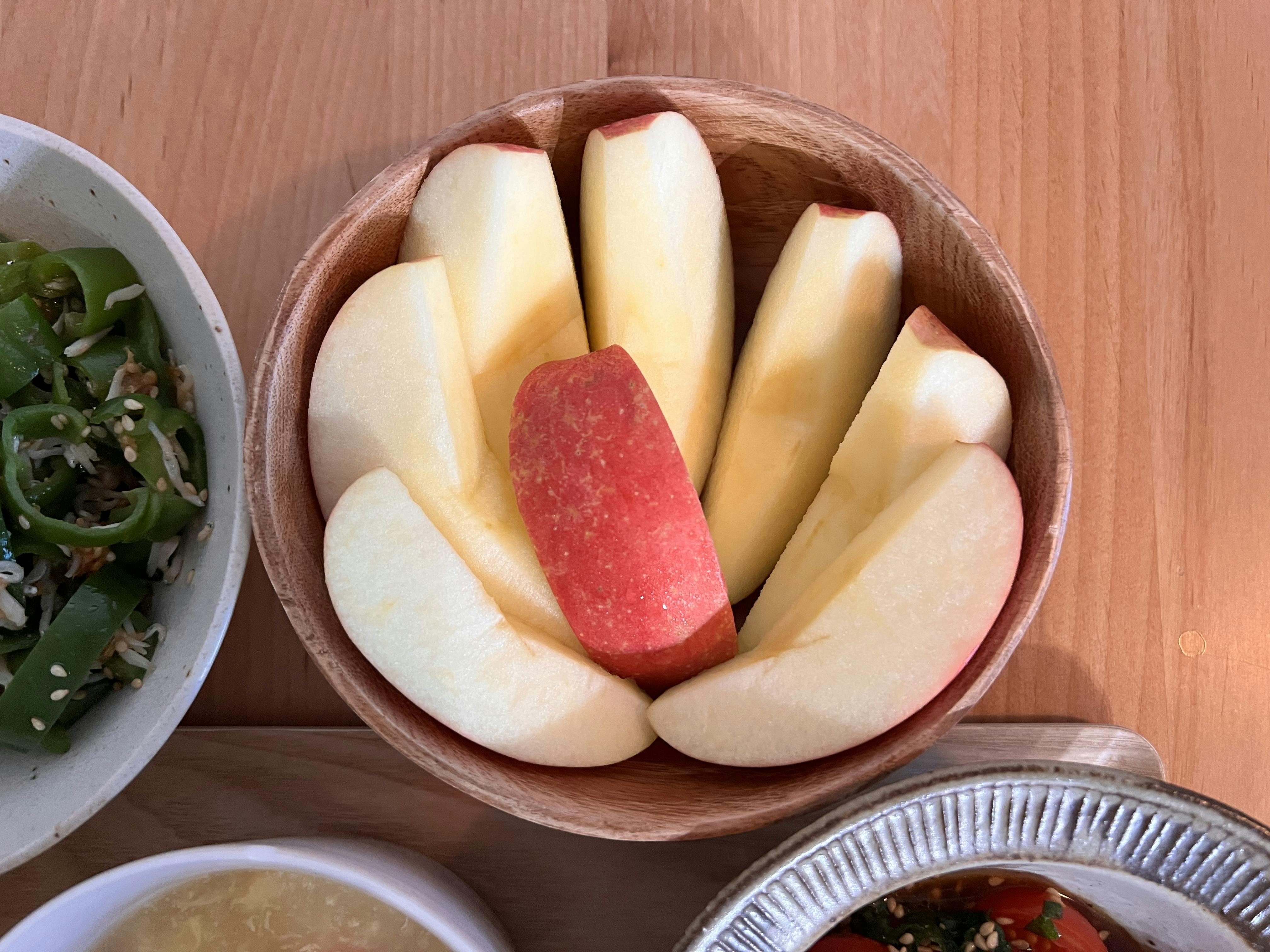 🐟🧡🍚 𖧵サーモンいくら丼 𖧵コーン焼饅じゅう(生協) 𖧵カニカマと卵のとろみ中華スープ 𖧵トマトと大葉の無限サラダ 𖧵やみつき無限ピーマン 𖧵りんご _________ 副菜が無限×無限してた日。笑 🫑♾️🍅 :